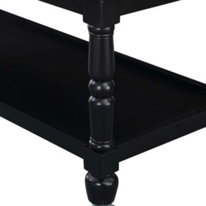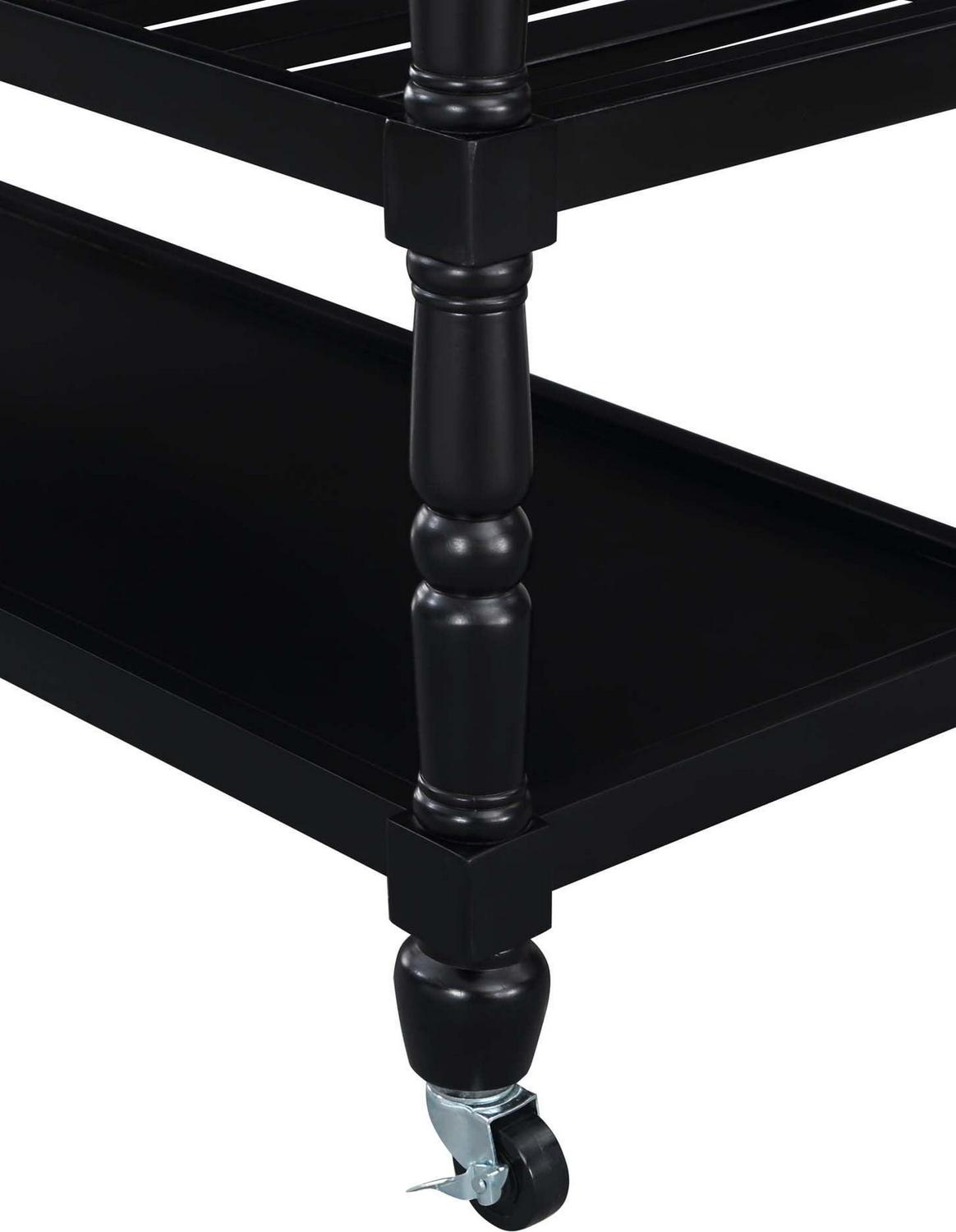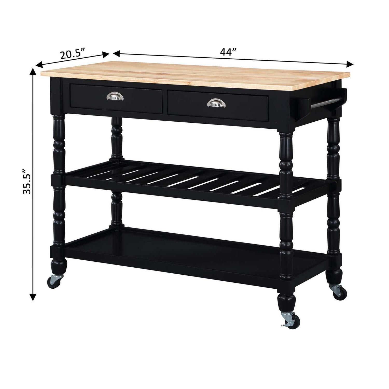 The French Country 3 Tier Butcher Block Kitchen Cart with Drawers by Convenience Concepts is the perfect addition to any transitional kitchen space. Providing functionality and efficiency for everyday tasks; this traditional unit is sure to become a staple in your home. The smooth butcher block countertop is an ideal efficient food prep station; and the stainless-steel towel rack allows for easy cleaning. Two additional shelves and two spacious drawers on smooth ball-bearing slides offer all the storage one may need. The middle shelf is slatted giving the perfect space to store wine bottles or other kitchenware as well. This portable cart is the perfect mobile storage space thanks to the 360-degree swivel caster wheels; two of which are locking. Beautiful turned legs and the butcher block top are engineered of rubberwood to ensure long-term durability. This finely crafted piece is perfect for small kitchens; apartments; and anywhere you need a little extra storage or kitchen prep space. Available in multiple finishes; you are sure to find a French Country 3 Tier Butcher Block Kitchen Cart with Drawers by Convenience Concepts to match your current existing interiors. Please note that this cart is not intended to be used as a cutting board.