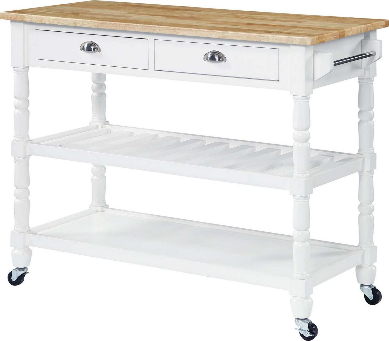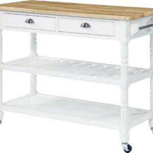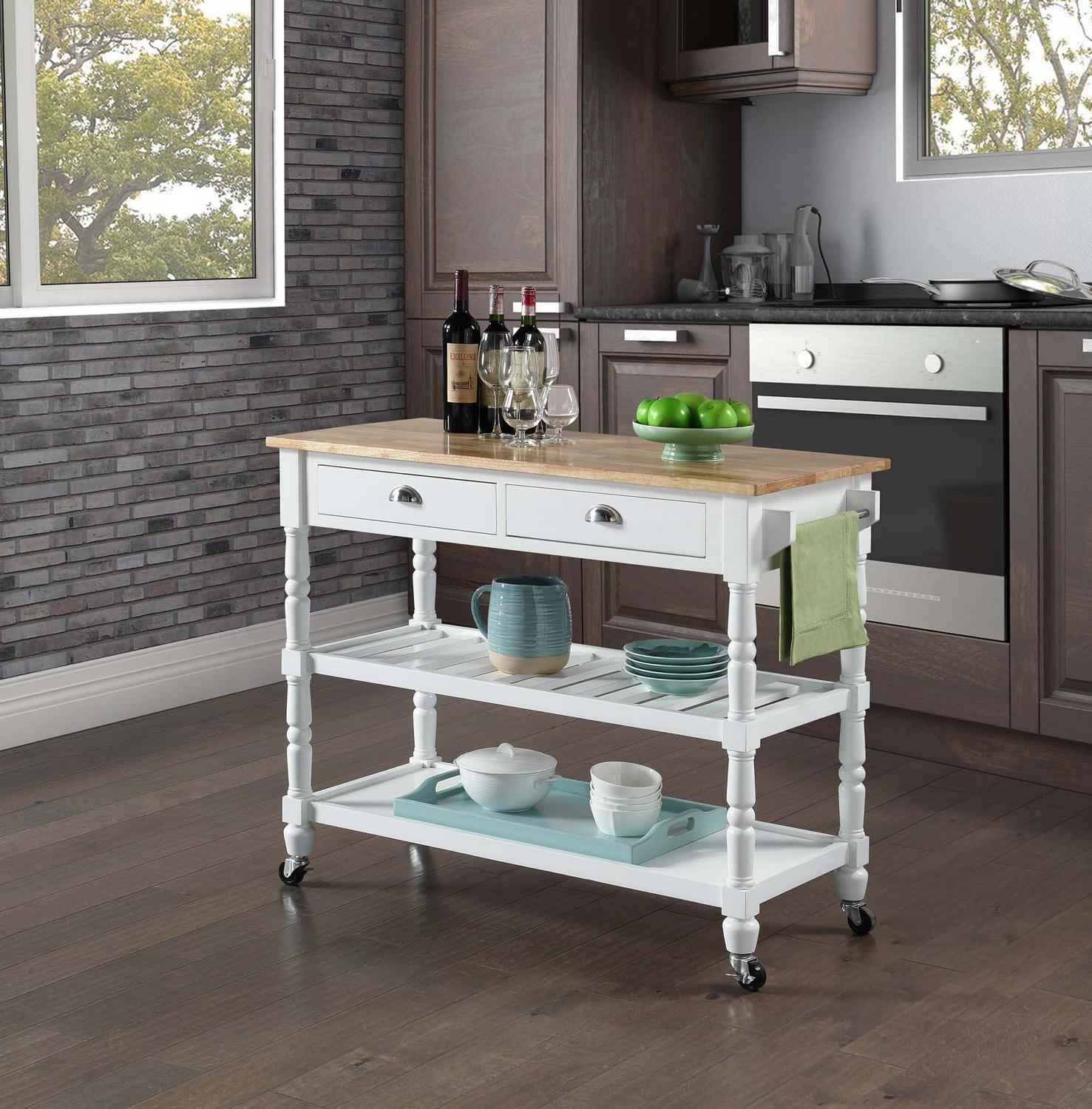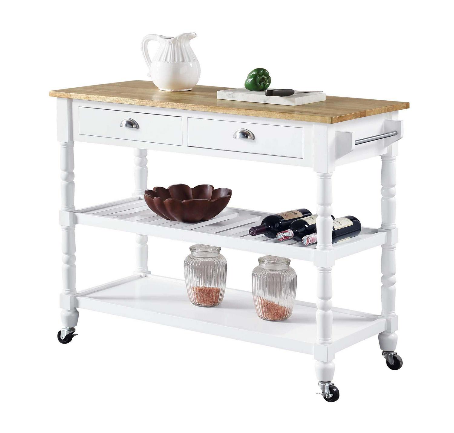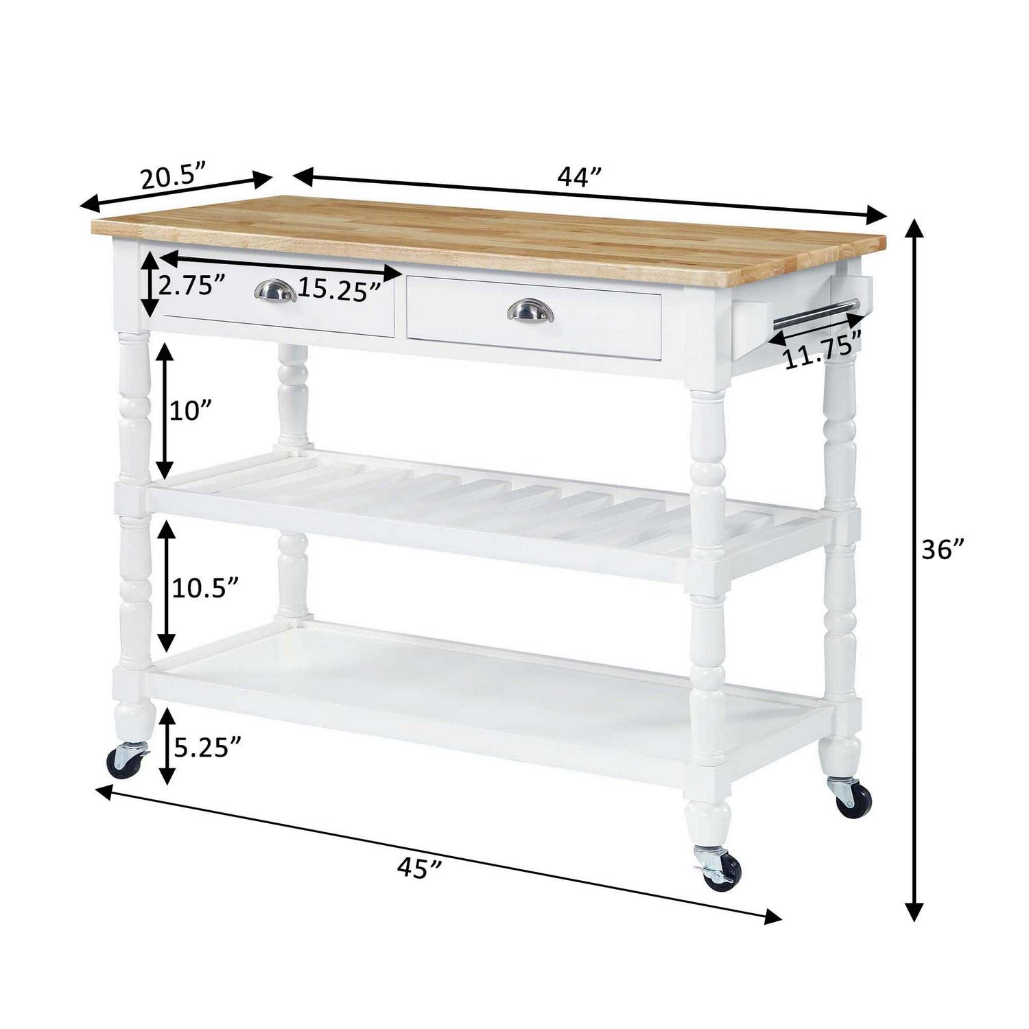 The French Country 3 Tier Butcher Block Kitchen Cart with Drawers by Convenience Concepts is the perfect addition to any transitional kitchen space. Providing functionality and efficiency for everyday tasks; this traditional unit is sure to become a staple in your home. The smooth butcher block countertop is an ideal efficient food prep station; and the stainless-steel towel rack allows for easy cleaning. Two additional shelves and two spacious drawers on smooth ball-bearing slides offer all the storage one may need. The middle shelf is slatted giving the perfect space to store wine bottles or other kitchenware as well. This portable cart is the perfect mobile storage space thanks to the 360-degree swivel caster wheels; two of which are locking. Beautiful turned legs and the butcher block top are engineered of rubberwood to ensure long-term durability. This finely crafted piece is perfect for small kitchens; apartments; and anywhere you need a little extra storage or kitchen prep space. Available in multiple finishes; you are sure to find a French Country 3 Tier Butcher Block Kitchen Cart with Drawers by Convenience Concepts to match your current existing interiors. Please note that this cart is not intended to be used as a cutting board.