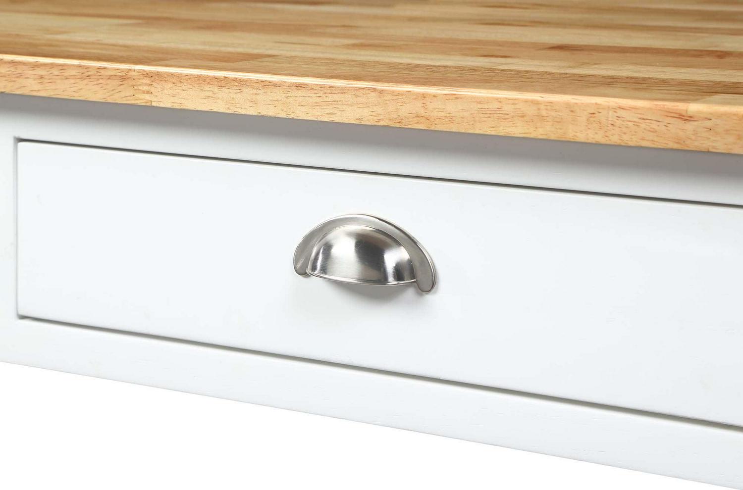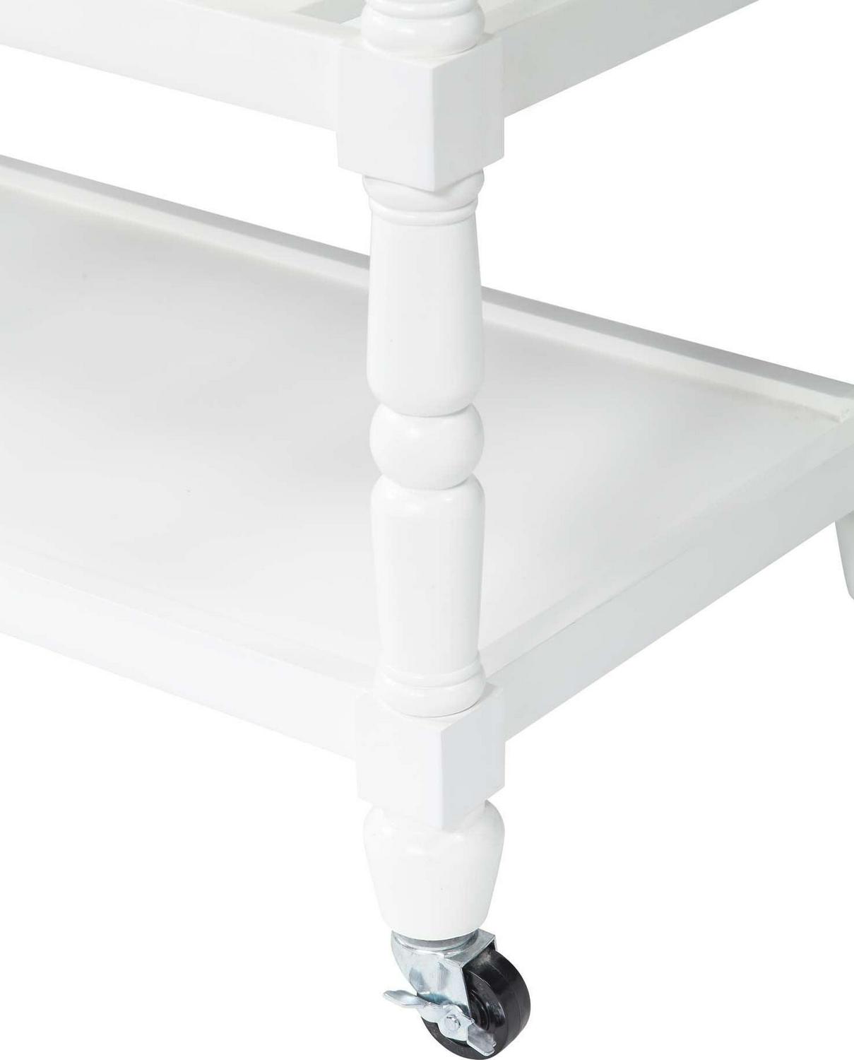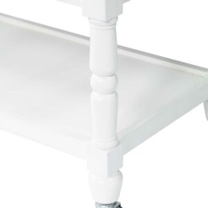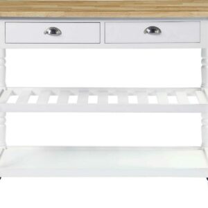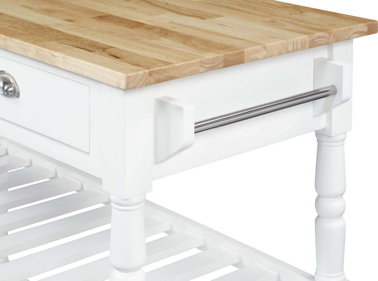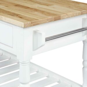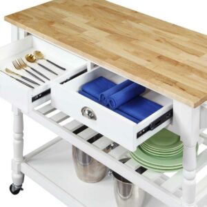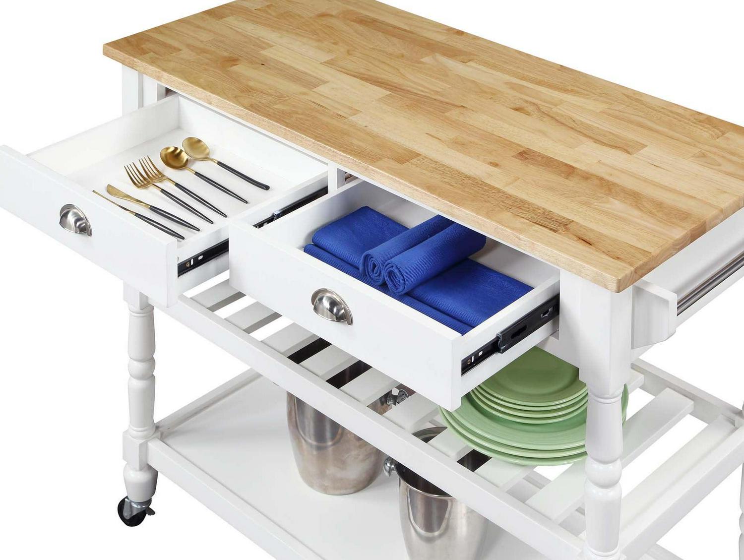 The French Country 3 Tier Butcher Block Kitchen Cart with Drawers by Convenience Concepts is the perfect addition to any transitional kitchen space. Providing functionality and efficiency for everyday tasks; this traditional unit is sure to become a staple in your home. The smooth butcher block countertop is an ideal efficient food prep station; and the stainless-steel towel rack allows for easy cleaning. Two additional shelves and two spacious drawers on smooth ball-bearing slides offer all the storage one may need. The middle shelf is slatted giving the perfect space to store wine bottles or other kitchenware as well. This portable cart is the perfect mobile storage space thanks to the 360-degree swivel caster wheels; two of which are locking. Beautiful turned legs and the butcher block top are engineered of rubberwood to ensure long-term durability. This finely crafted piece is perfect for small kitchens; apartments; and anywhere you need a little extra storage or kitchen prep space. Available in multiple finishes; you are sure to find a French Country 3 Tier Butcher Block Kitchen Cart with Drawers by Convenience Concepts to match your current existing interiors. Please note that this cart is not intended to be used as a cutting board.