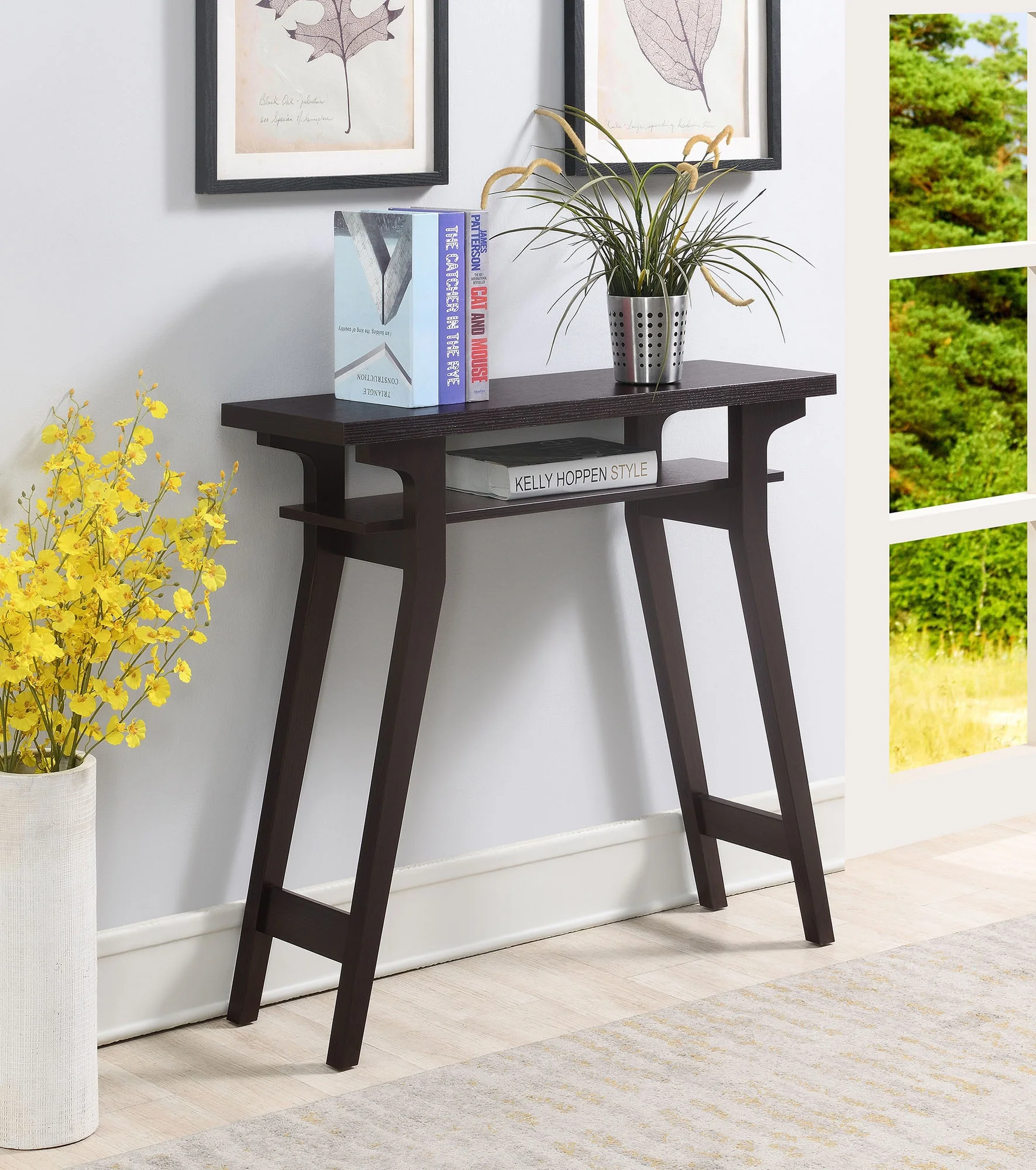 Ideal for small spaces; the Newport Lynda Console Table by Convenience Concepts will take up minimal square footage while optimizing your storage and display space. Showcases a contemporary style to upgrade your home decor. Place it in your entryway; hallway or home office and witness its limitless versatility. Provides ample tiers that are ideal to display your favorite collections or to keep your out the door essentials handy. You can even place a colorful tote basket right below the second shelf for additional storage space. This unique design was crafted from hollow core; MDF; particle board and paper melamine. Bring home today and transform your decor right after delivery. Its simple assembly is worth every step. This piece is available in multiple finishes to ensure you find the perfect fit. Love the look? Pair it with a coffee table or end table from the Newport Collection by Convenience Concepts. Each sold separately.