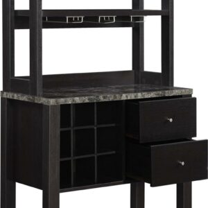 Upgrade your entertaining area with the Newport Serving Bar by Convenience Concepts. With a holding capacity of 9 wine bottles, you will have enough space for all your favorites. Including a total of 4 shelves, 3 top and 1 bottom, there is ample space for drinkware and must have beverages. In addition, this bar has 3 hanging stemware racks to accommodate your wine glasses. This modern contemporary piece includes two drawers that provide hidden storage to stow away your cocktail accessories. Cleanup is easy thanks to the faux marble serving top finished with melamine. Place in your living room, kitchen or dining room and enjoy its endless versatility. Pair with additional pieces from the Newport Collection by Convenience Concepts, each sold separately.