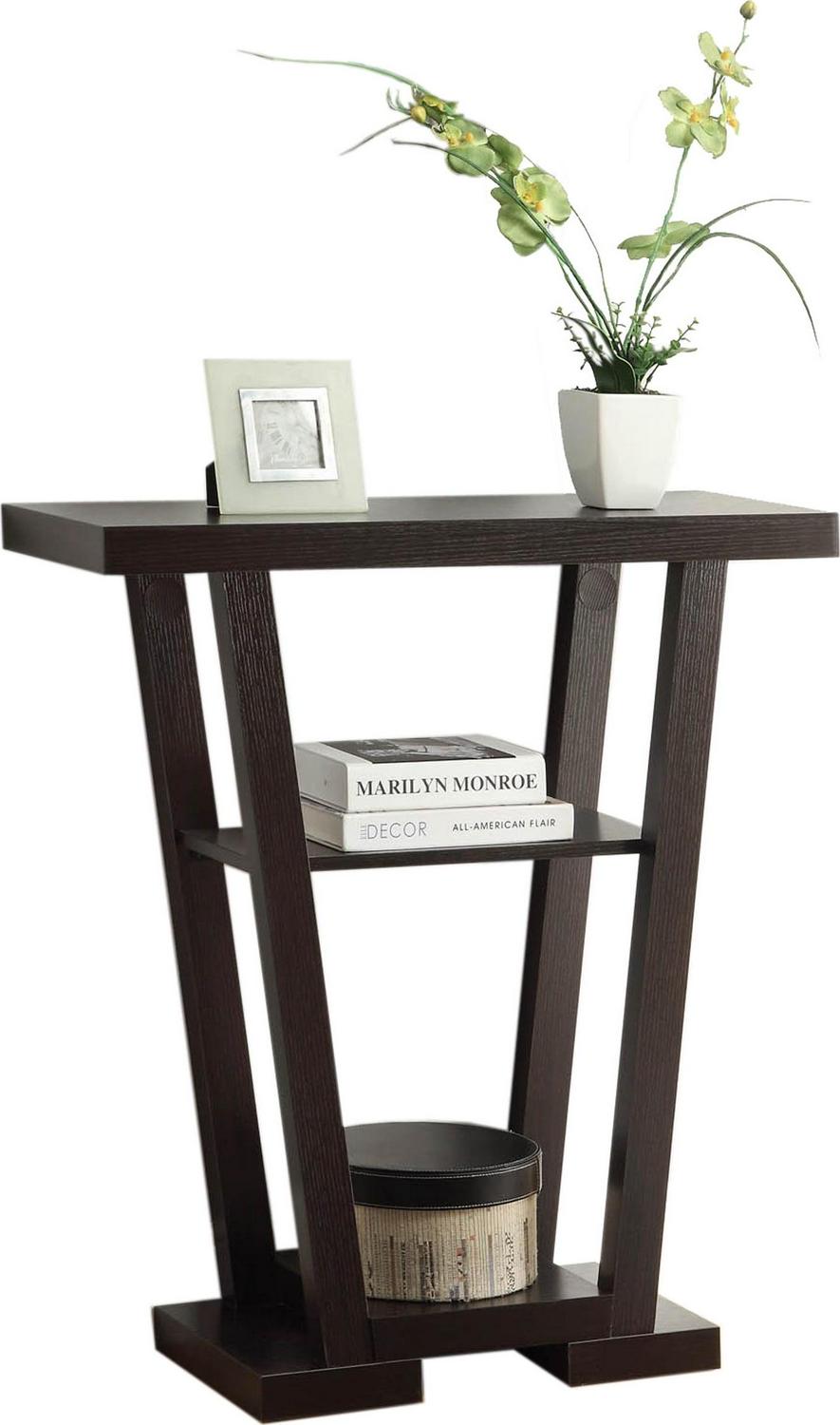 The Newport V Espresso Console Table comes in a rich espresso, mahogany, or weatherd white wood grain finish. Stylish and functional, it is sure to be an eye catcher. Featuring an open “V” shape frame with two additional shelves, this console table is the perfect way to add a touch of class to your home. This console table with shelves on the bottom and middle provides additional storage for books, collectibles and more. Its sophisticated design allows it to fit nearly any home decor. Dimensions: 31.5″W x 11.5″D x 34″H