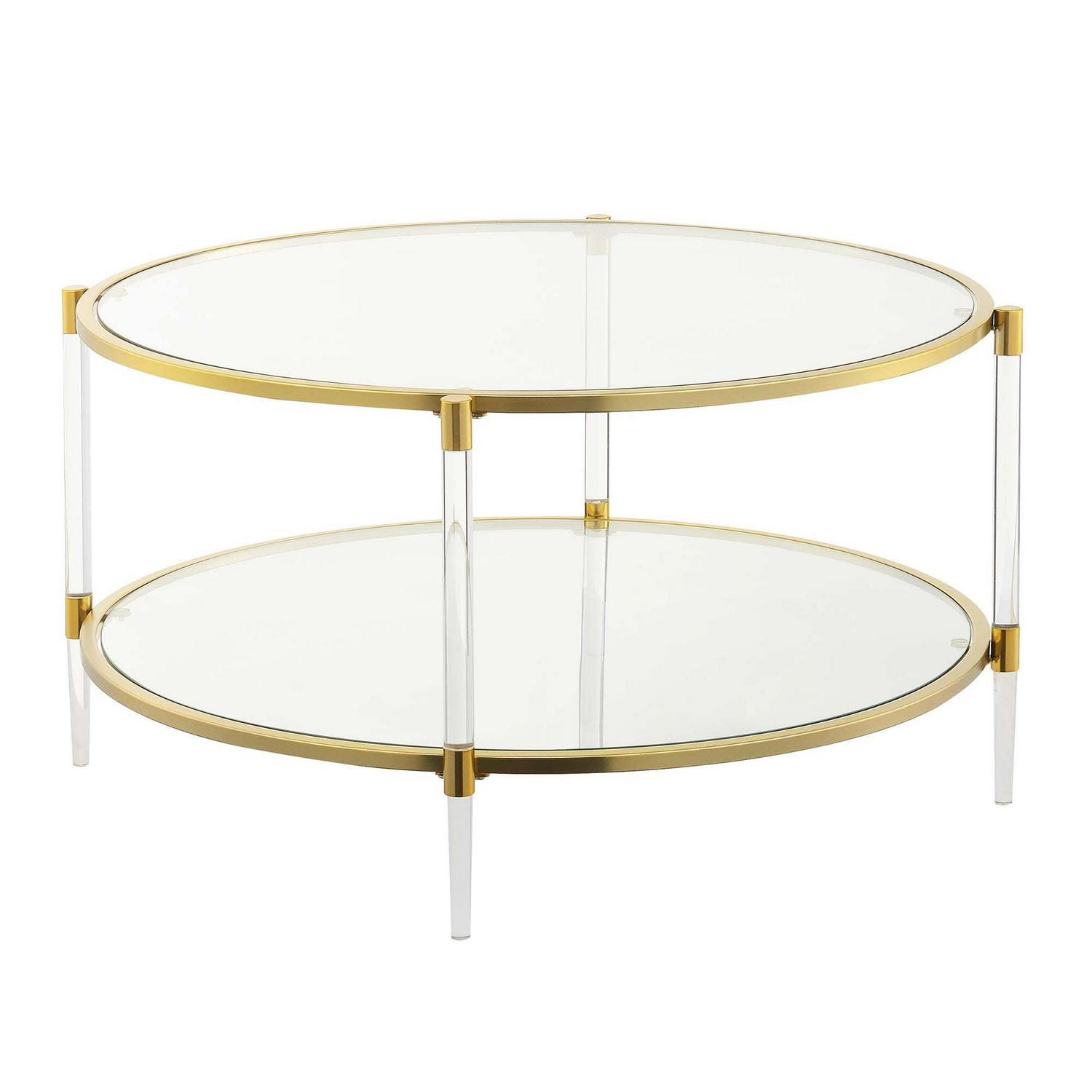 Royal Crest Acrylic Glass Coffee Table Add luxury and glam to your favorite living space with the Royal Crest Acrylic Glass Coffee Table by Convenience Concepts. Featuring four acrylic legs that support two gold chrome metal frames and two tiers of tempered glass shelves. Great for entertaining, the spacious tabletop gives you and your guests plenty of table space to place beverages and much more. Ample space is available on the 2nd tier of this extravagant coffee table to display your glamourous decorative items. This classy piece is quick to assemble with only 3 easy steps required. Add more to your living space by shopping the complete Royal Crest Collection by Convenience Concepts, each sold separately.