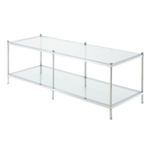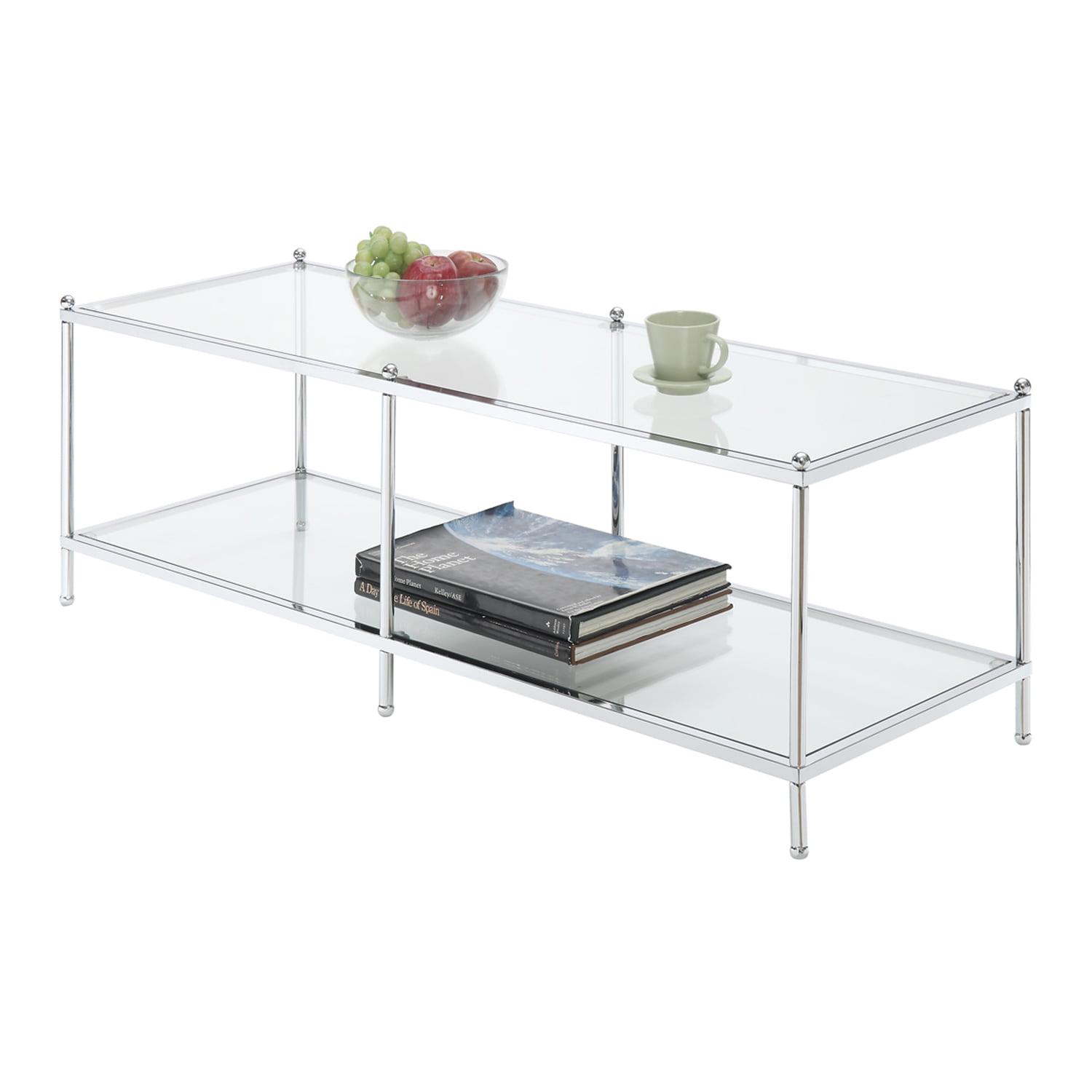 Convenience Concepts No Tools Royal Crest Coffee Table will enhance the look of a living room or dining room. The chrome frame provides both durability and a contemporary look. This rectangle coffee table features a bottom glass shelf that provides plenty of space to display collectibles or additional storage. Put it in a sitting area with couches around it, so guests have someplace to set their food and drinks. Furnish the entire room with coordinating items, which are sold separately. The objects stored on the second shelf can be viewed nicely due to the design. It will fit in with most home decors, since it is available in black glass or glass.