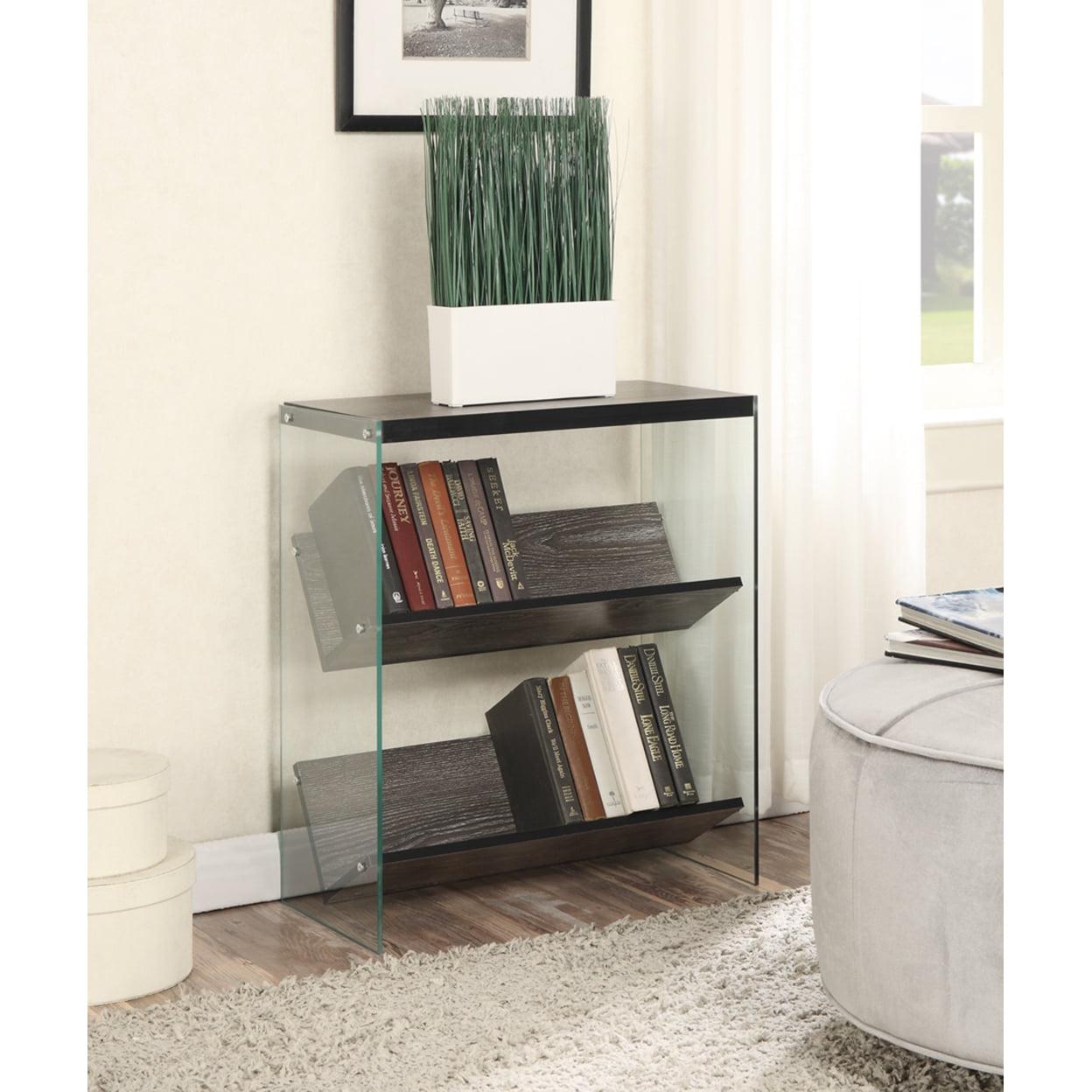 SoHo Bookcase, Weathered Gray Get in the orbit of the SoHo Bookcase that is perfect for any modern space. With a generous gray top surface, you will have plenty of space to store your decor or pictures. The tempered glass sides catches the eye and makes this bookcase a sparkling addition in any room. This decorative yet practical piece has a convenient stylish two lower shelves for plenty of added display and storage. Will provide years of enjoyment.