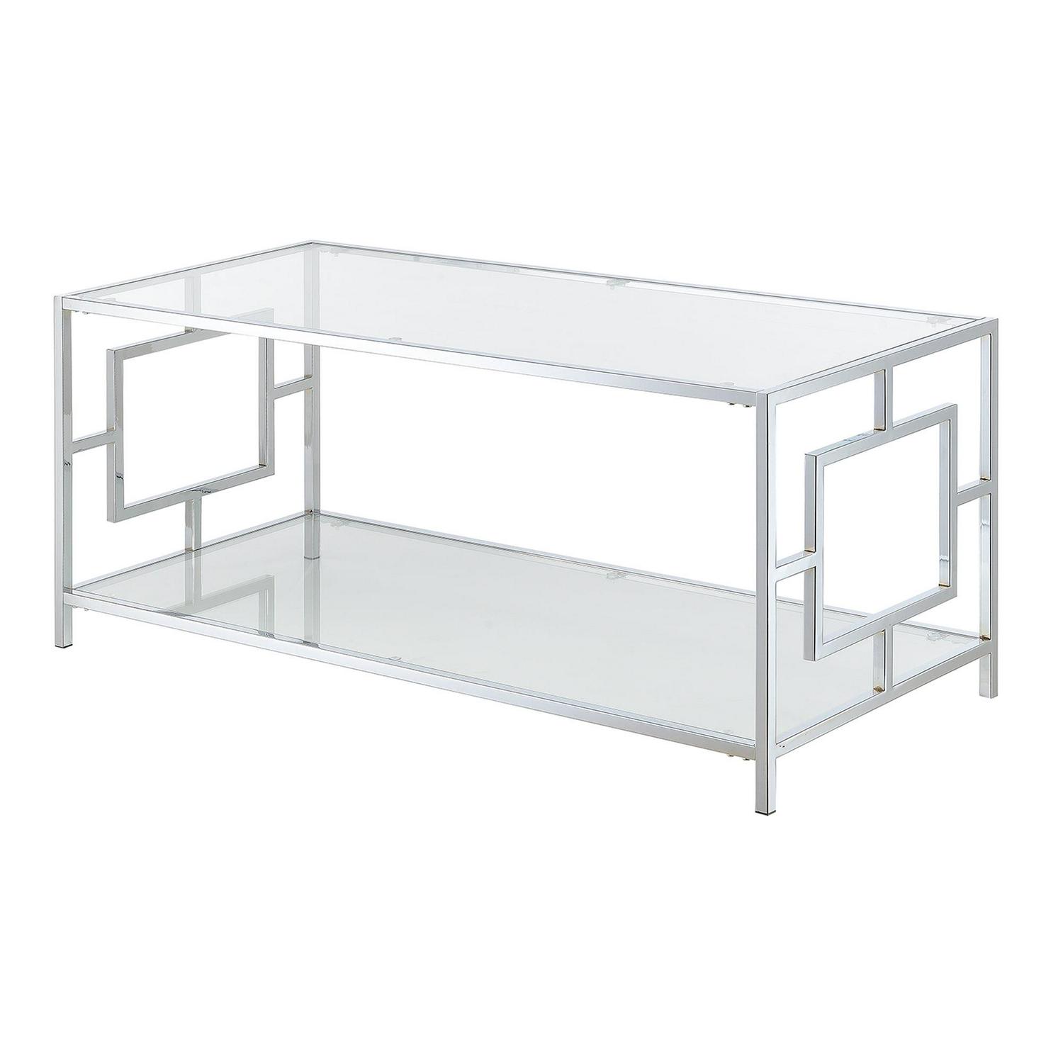 Town Square Chrome Coffee Table, Clear Glass Create a seating group with your favorite sofa and loveseat and make the Town Square Coffee Table from Convenience Concepts its centerpiece. This contemporary table will bring glamour and functionality anywhere it stands. Showcasing two shelving tiers crafted from tempered clear glass, a geometric side framework, and a metal chrome frame, it is designed to create a spacious ambience. Its ample shelves offer plenty of space for all your living room essentials. The removable glass tiers make it for easy maintenance. Simple and easy assembly in 3 easy steps, will have you and your friends admiring its updated classical beauty in no time. Look for matching pieces from the Town Square Collection from Convenience Concepts, each sold separately.