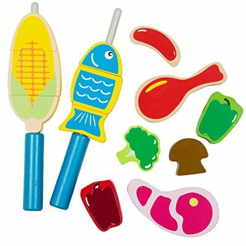 Cook ‘N Grill Wood BBQ Set – Includes Over 30 Pcs of Wooden Barbeque Food and Barbecue Grilling Tools Wooden BBQ Set – Includes over 30pcs of all the grilling and BBQ pieces, from Barbeque food pieces, Barbecue grilling tools and utensils, condiments. This set comes with skewers so children can build their own combination of food pieces on skewers, and corn and fish separates into 3 pieces for additional play factor. The burger set that comes with the set also comes with velcro so children can take it apart and build it for added fun factor. Cook ‘N Grill Wood BBQ Set – Includes Over 30 Pcs of Wooden Barbeque Food and Barbecue Grilling Tools