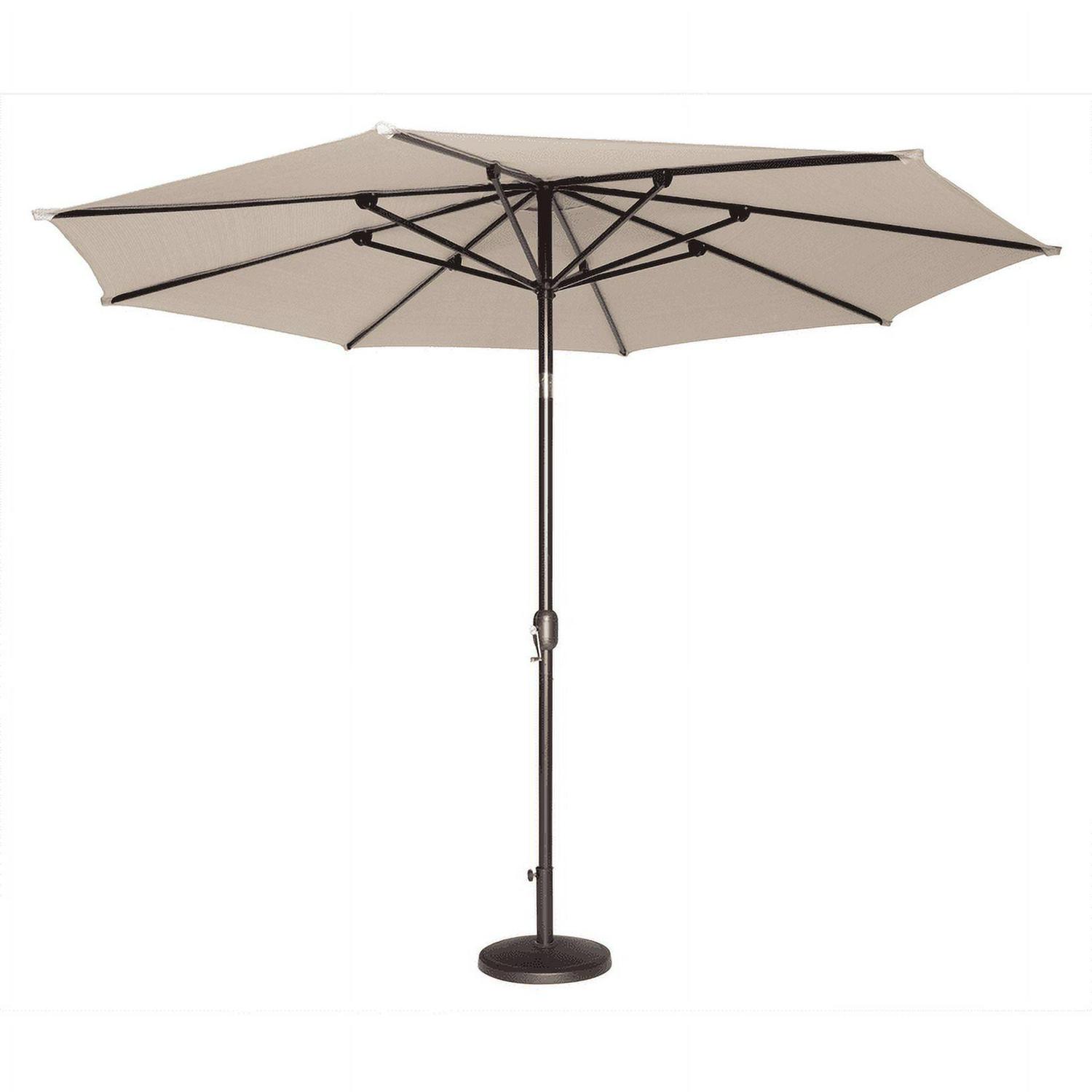 Accent your backyard with the elegant Coolaroo 11′ Round Aluminum Umbrella. This classically designed smoky color outdoor table umbrella offers functional style to your backyard or patio. It offers protection from the sun while allowing cool breezes to flow through its fabric. Featuring weather-resistant and UV-blocking fabric, this garden umbrella ensures 90-percent sun block and can help reduce temperatures by up to 32 percent. This Coolaroo 11′ Round Aluminum Umbrella allows you to relax comfortably with your family and friends. It has a three-position tilt aluminum pole so you can adjust for shade any time of the day. The Coolaroo 11′ Round Aluminum Umbrella resists mold and mildew to provide reliable performance for years.