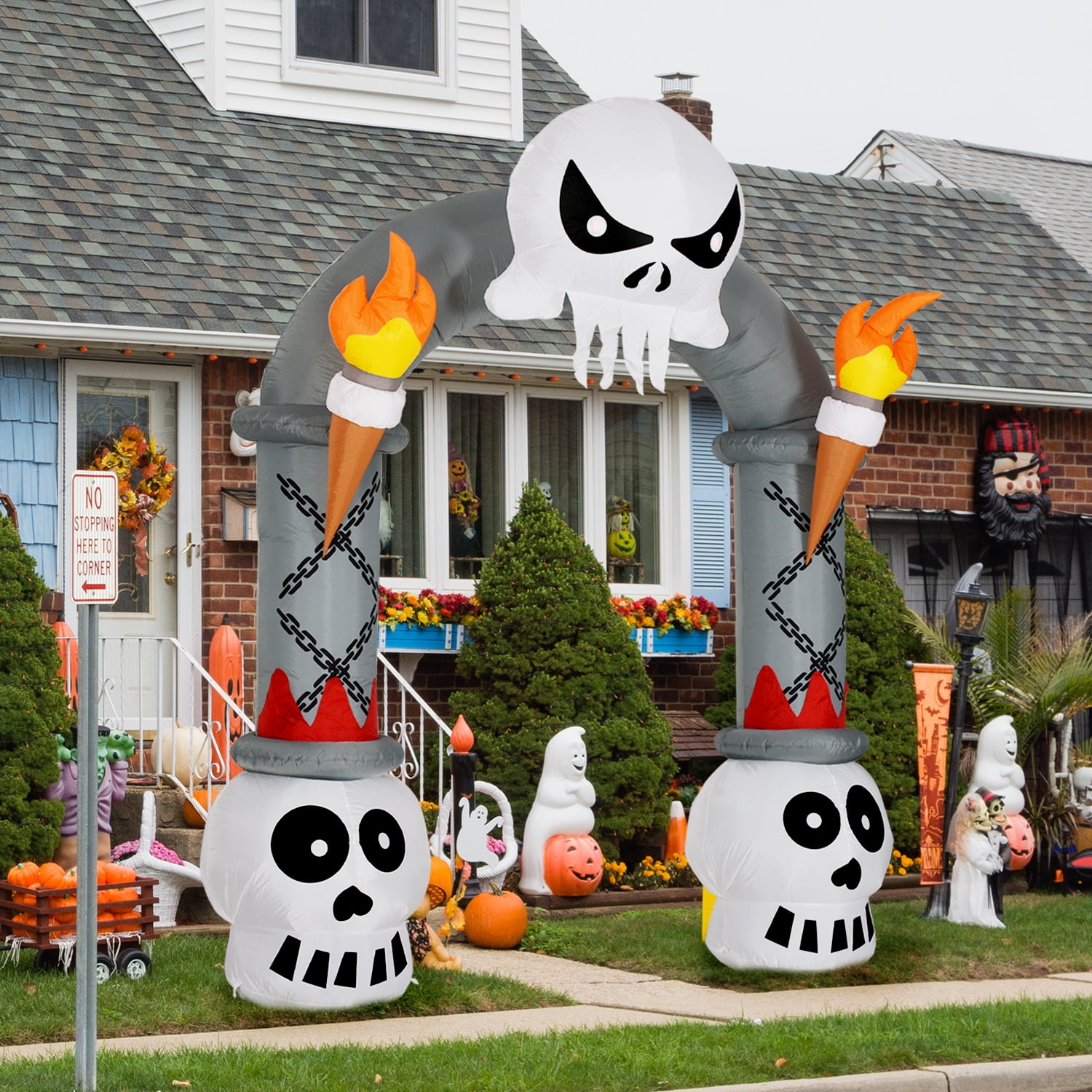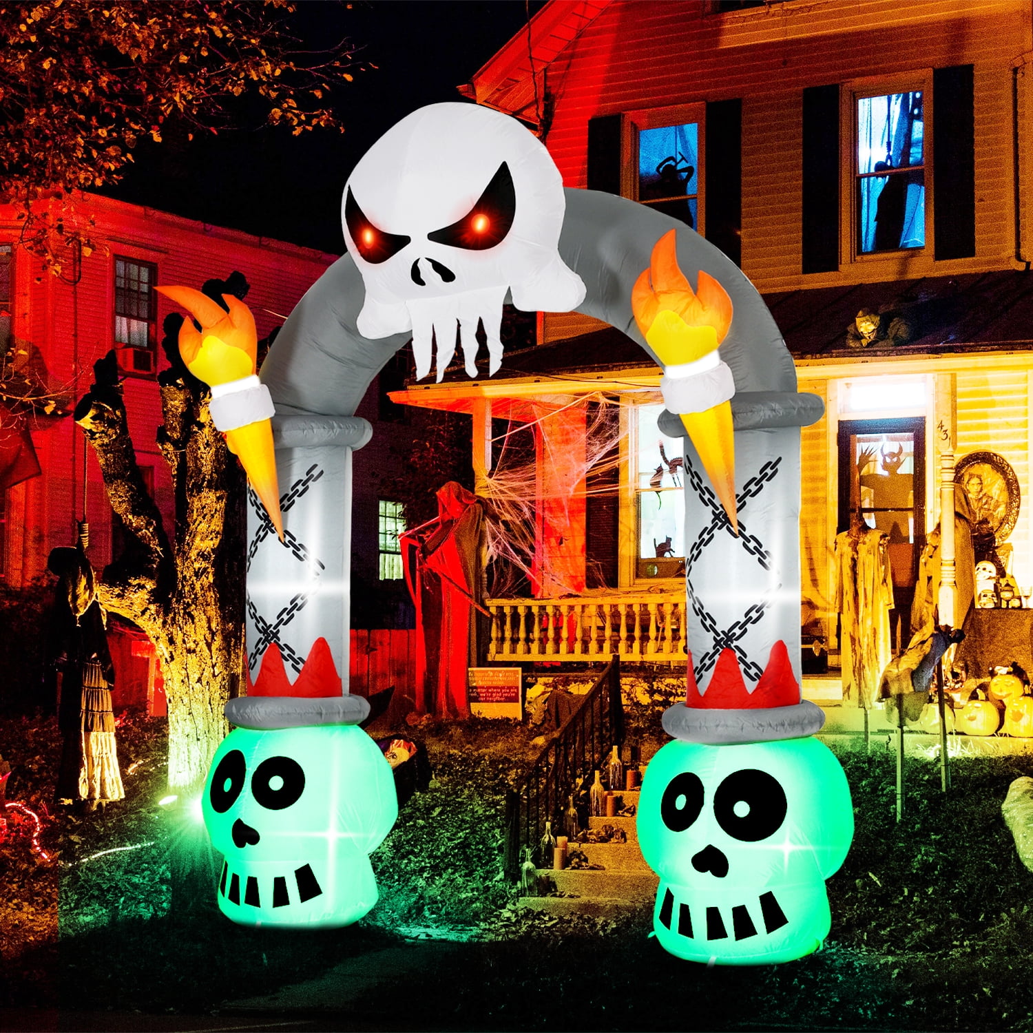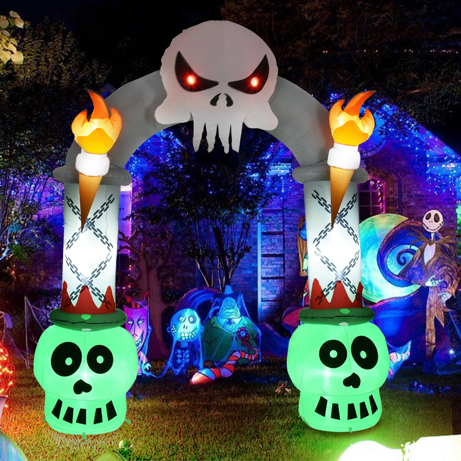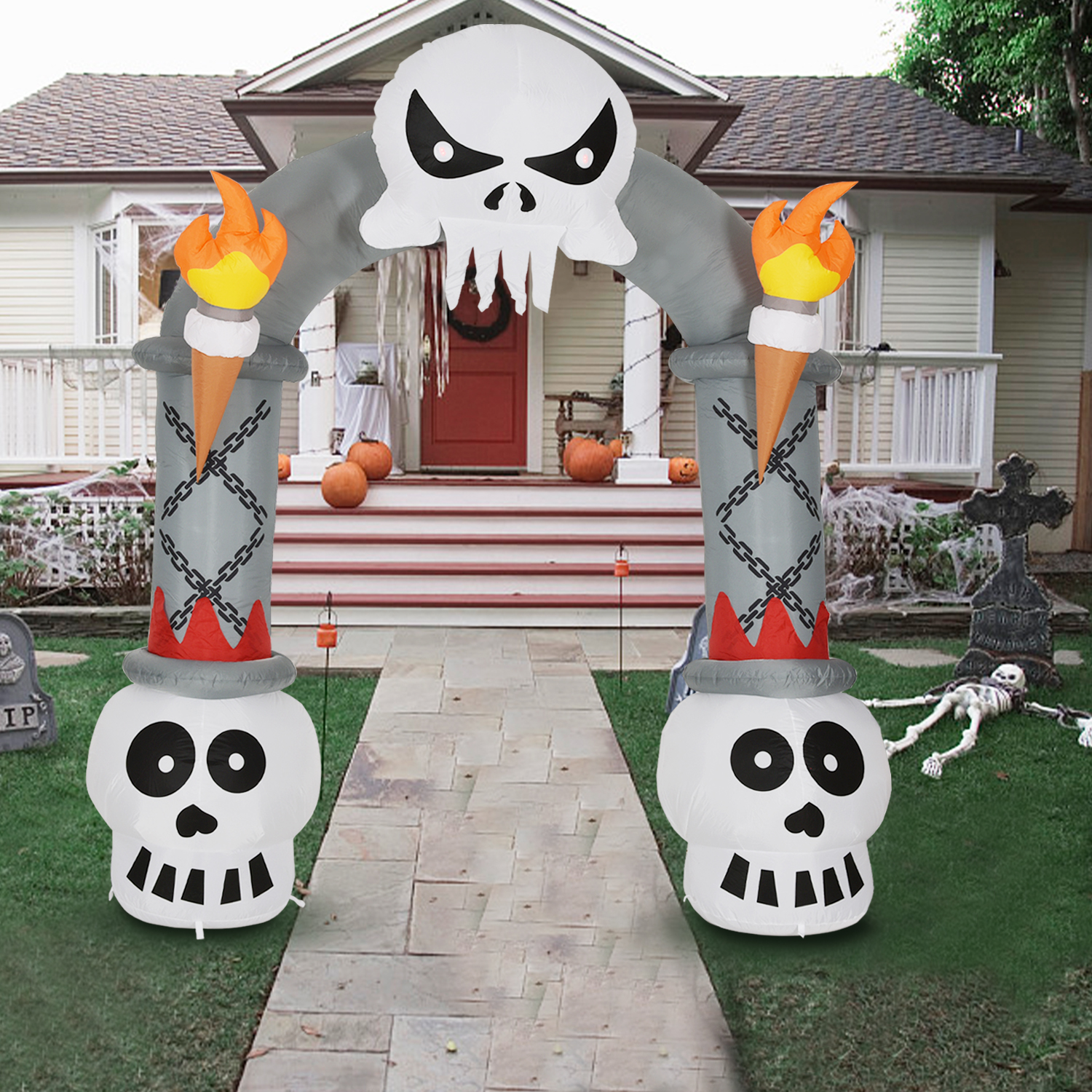 9ft Huge Halloween inflatable archway outdoor with scary halloween element. Archway inflatable halloween decorations with novetly scary red eyes skeleton and burning torch design, which will bring glorious outdoor yard decorations effect. Our halloween yard decorations with 2 colors flashing LED lights, Awsome flashing red LED lights skeleton and flashing torch lights, flashing torch design like the flames are burning, and scary skulls with twinkling red eyes, scary eyes attach kids and guests attention in Halloween, blow up halloween decorations easy to create scary Halloween atmosphere. Halloween decorations outdoor scary have 4 pcs weighted sand bags on the bottom to keep it upright and stand up. Full equipped with ground stakesx12; ropesx4; hookx2 to help you firmly fix the inflatable skeleton to the ground. (tips: Two opening at the bottom with a zipper provides space for adding some heavy objects to make it more secure and stable)Without worrying about being blown down by severe weathers such as strong winds. Halloween archway outdoor increases the scary and festive atmosphere, decor on your yard, garden, patio, lawn, doorway. Outside Halloween decorations add addition at Halloween party and so on. Made of waterproof and durable polyester fabric material. Package including: 1 X Halloween Inflatable Skull, 1 x Power Adaptor, 4 X Ground Stakes, 4 X Fasten Tethers(11ft), 2 X Sandbag, 1 X Manual