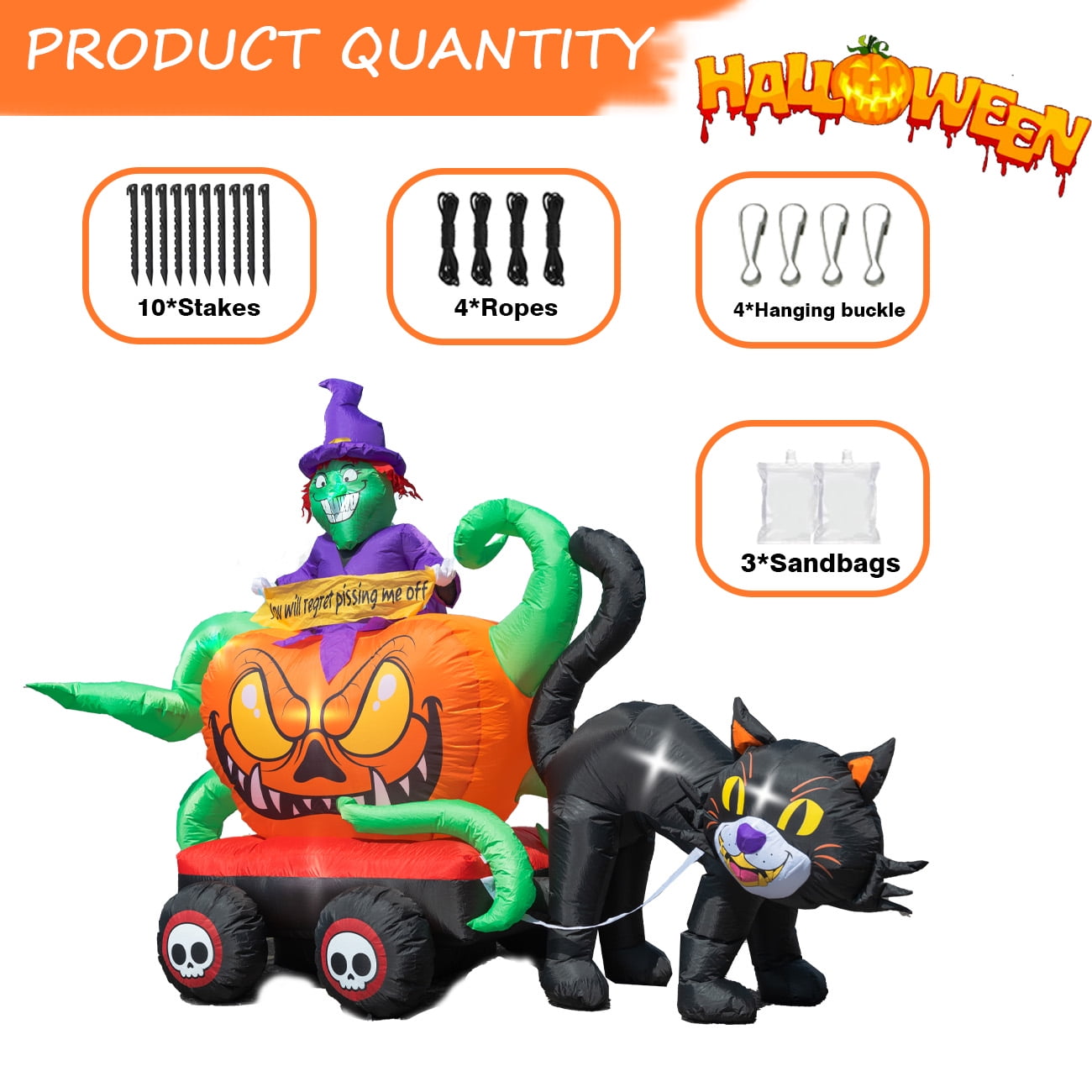 Bring a spooky and whimsical touch to your Halloween decor with the Coolmade 9ft Inflatable Witch Riding Truck. This eye-catching inflatable features a black cat and a witch sitting on a truck, creating a unique and imaginative design that is sure to delight. Crafted from high-quality, waterproof polyester, this inflatable is built to withstand the elements and can be used both indoors and outdoors. With a powerful built-in blower and easy inflation, this decoration sets up in minutes, making it a hassle-free addition to your Halloween festivities. Compact and easy to store, this inflatable is perfect for creating a festive and eerie atmosphere in your home, garden, or yard.