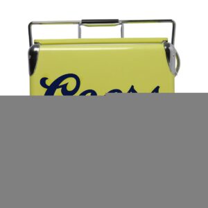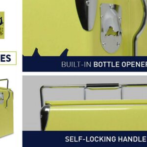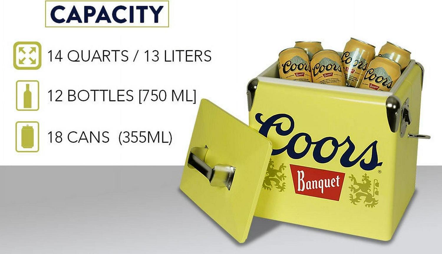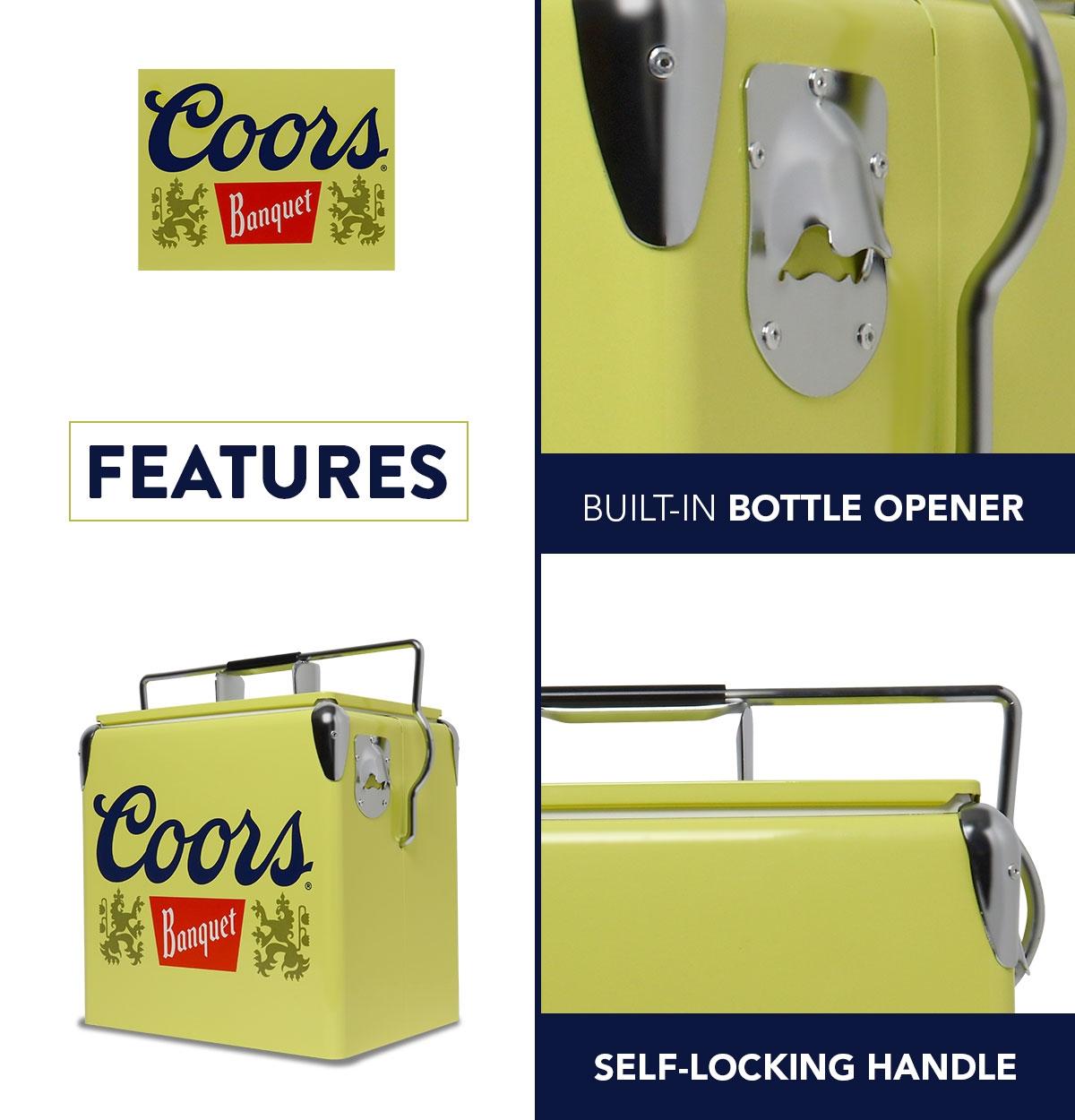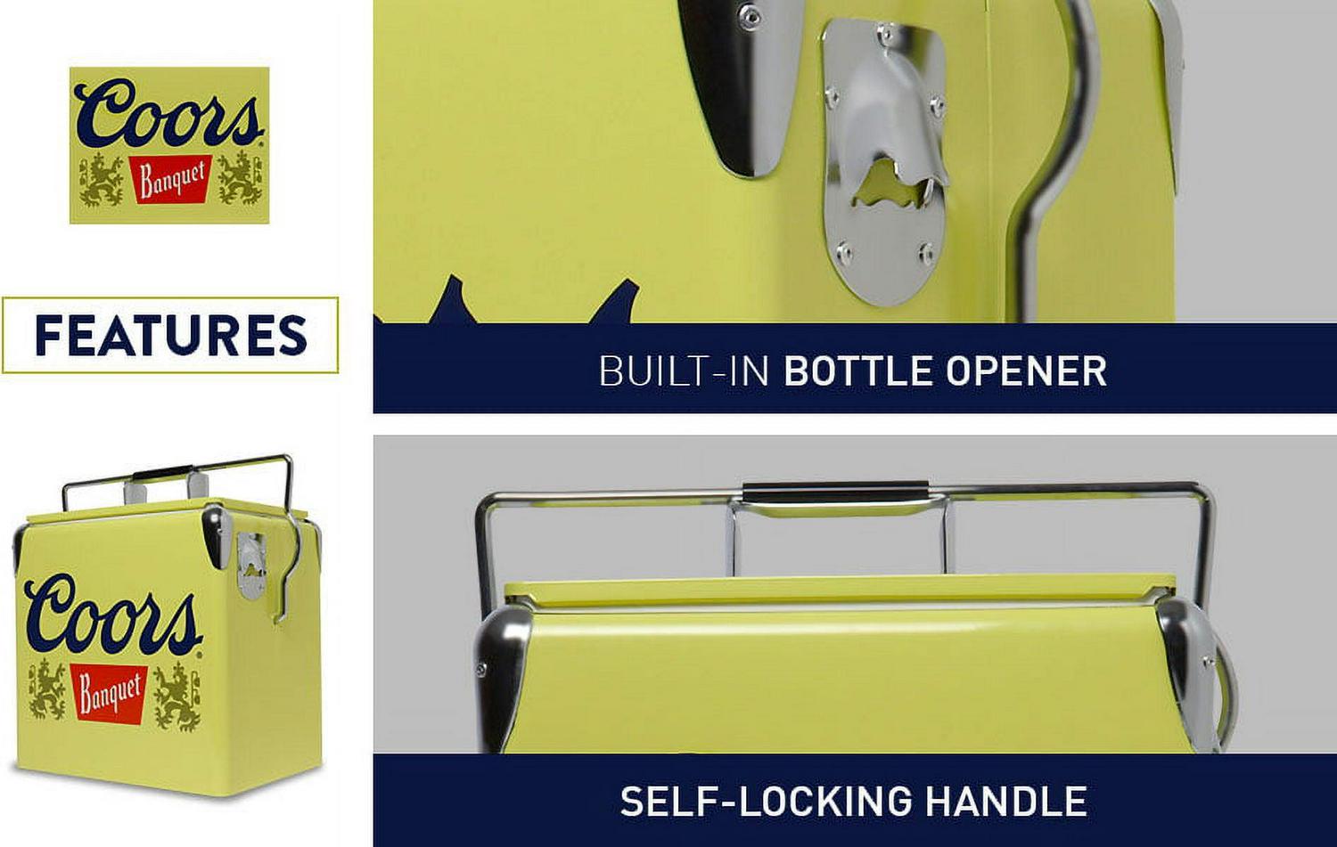 Show off your cool vintage style and celebrate your favorite beer – This retro style steel-belted ice chest features licensed vintage Coors Banquet graphics, eye-catching yellow exterior, and polished chrome accents, making it the perfect accessory for the beach, patio, campsite, boat, cottage, or RV. Fill up the insulated cooler with ice and pre-chilled drinks and snacks for environmentally friendly safe storage with no electricity or CFCs. Self-locking lid and durable non-toxic plastic liner trap cold air inside for maximum efficiency and built-in bottle opener means no scrambling for your opener when you want a cold one!