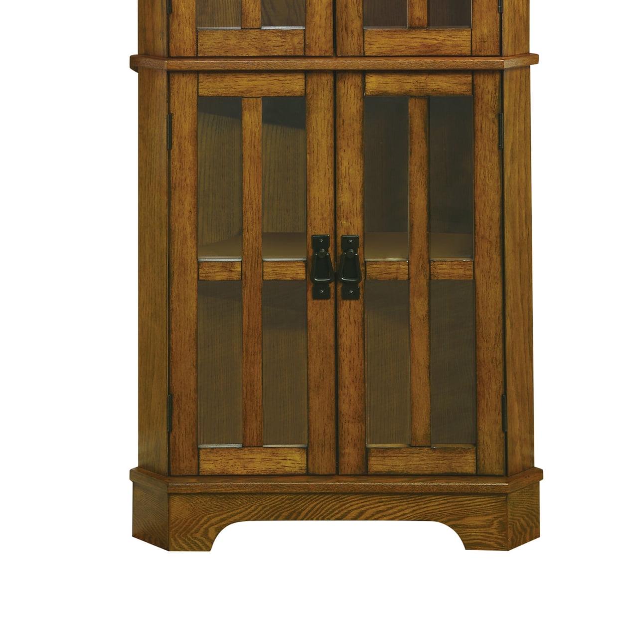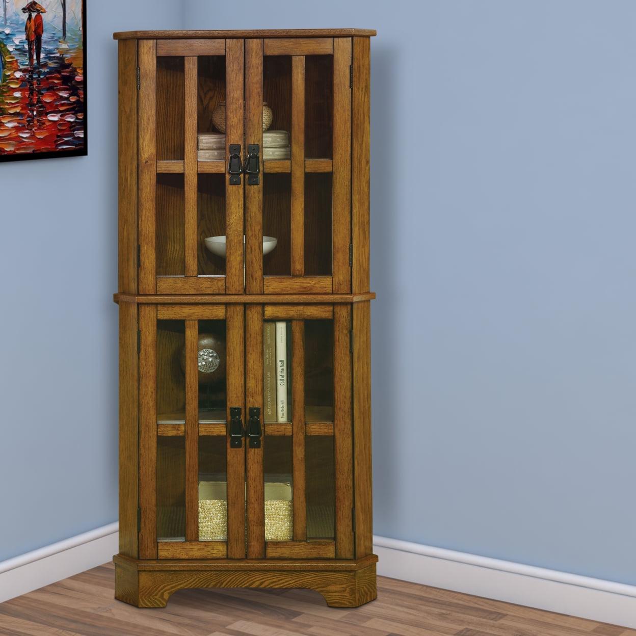 Corner Curio Cabinet With Windowpane Style Door Fronts, Brown- Saltoro Sherpi This attractive curio fits right in the corner of your living room or dining room, showcasing fine china, books, art pieces and whatever you want to put on display. Four doors and breakfront moulding create visual balance and variety. Warm brown oak and windowpane-style door fronts convey a charming, timeless simplicity. Impress your guests with this beautiful display case.