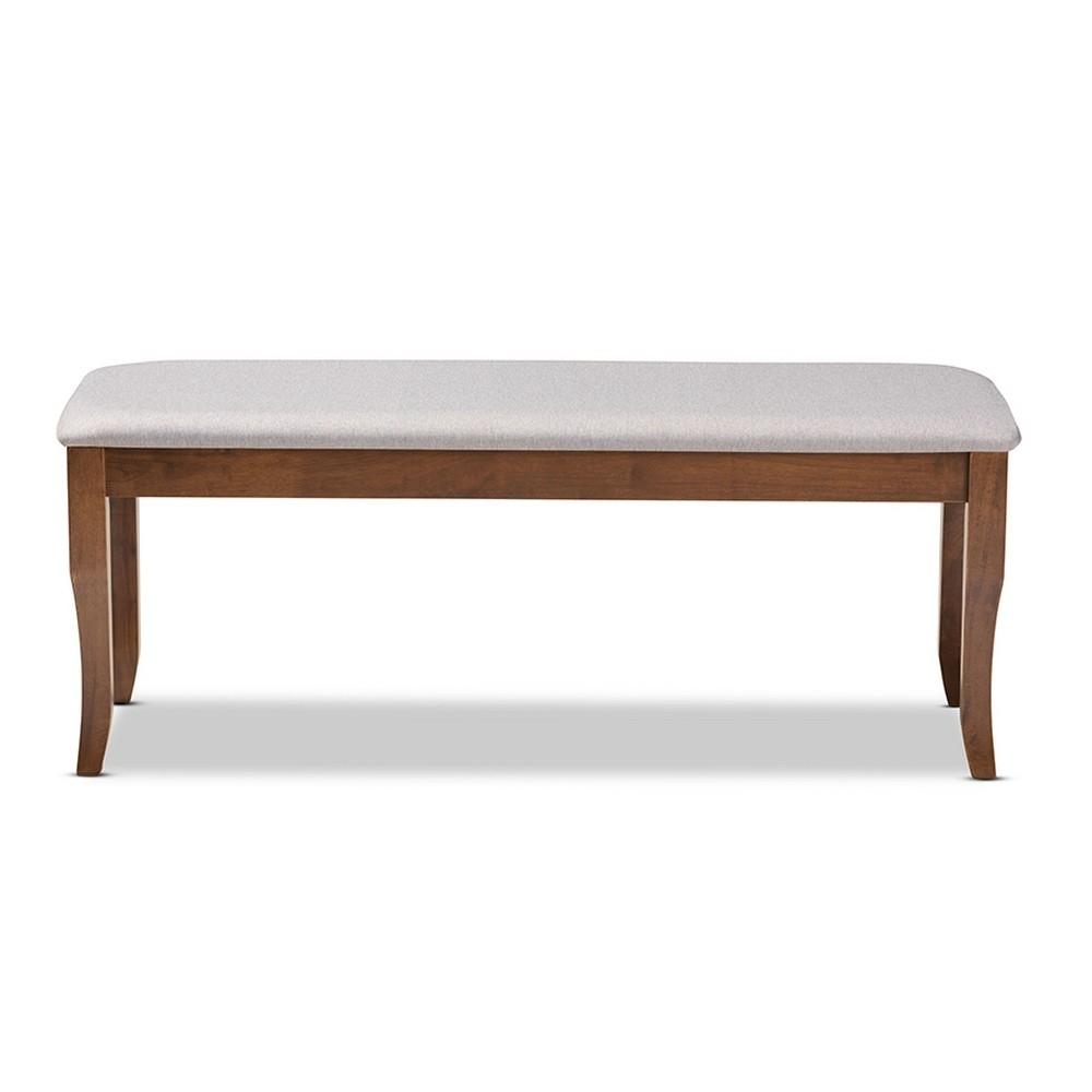 Cornelie Modern and Contemporary Transitional Grey Fabric Upholstered and Wood Dining Bench Add casual elegance to your dining room set up with the Cornelie dining bench. Made in Malaysia, the Cornelie is constructed from sturdy wood. The warm walnut brown finish on the wood complements the soft, grey fabric upholstery. An optimal balance of comfort and style, this bench features a plush foam-padded seat, as well as classic cabriole legs that enable ample leg room. Requiring assembly, the Cornelie dining bench is well suited for both casual and formal dining.