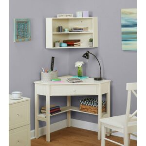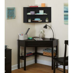 For the ultimate way to save space in style, tuck the Corner Desk with Hutch into any corner and get to work. This corner desk and its matching hutch comes in your choice of available finish. The hutch mounts to a corner wall and offers three levels of open shelving. The corner desk offers a spacious working surface and handy drawer.