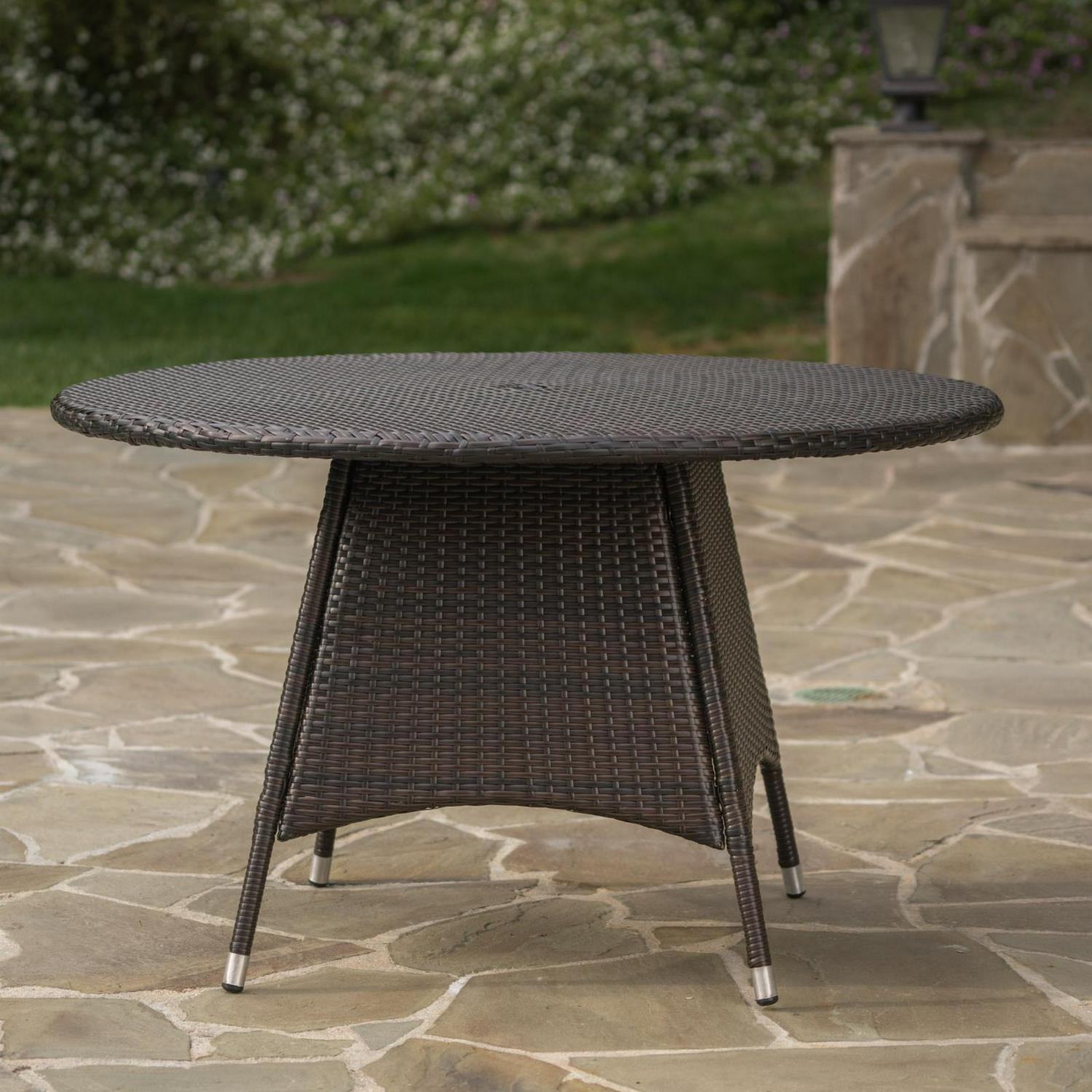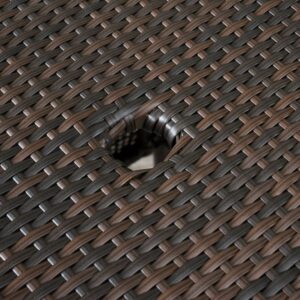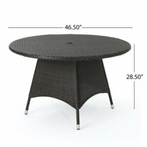 Use the Corsica Round Patio Dining Table to create the perfect outdoor dining area. This dining table has a durable iron frame and resin wicker covering that is waterproof and easy to clean. The table accommodates up to four chairs, and has an umbrella hole in the center. A neutral brow finish works with most décor styles and natural settings.