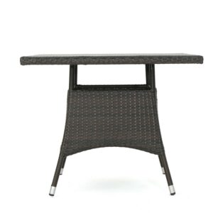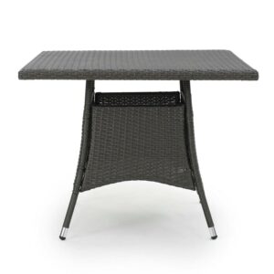 The Corsica Wicker Square Patio Dining Table is just the right size to seat four people. The patio table includes decorative side panels and an iron frame for extra durability. The polyethylene wicker on the outdoor table is woven in an eye-pleasing pattern. Blending with your existing décor, the neutral gray matte finish won’t chip or peel in the outside elements. Requires some assembly before it can be used.