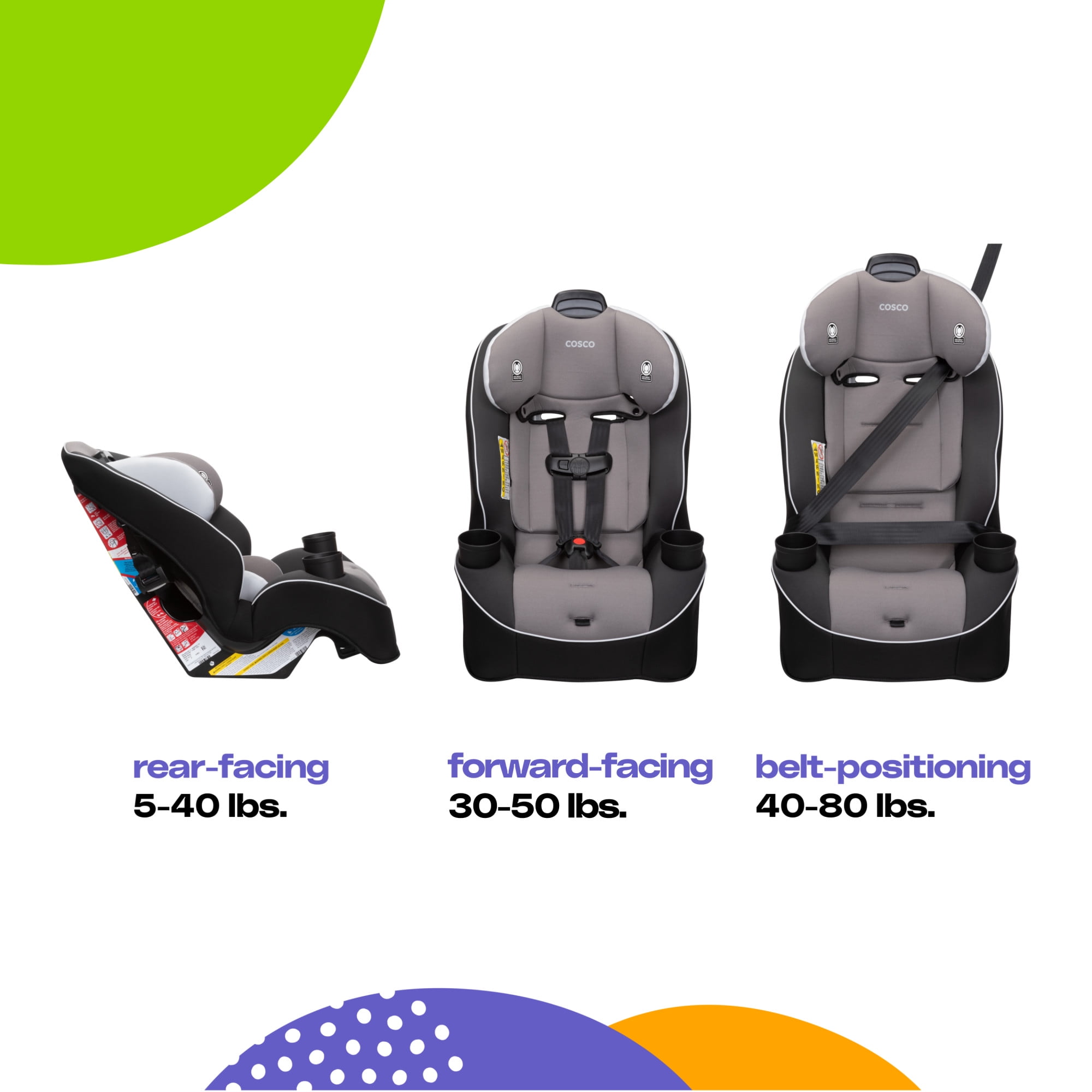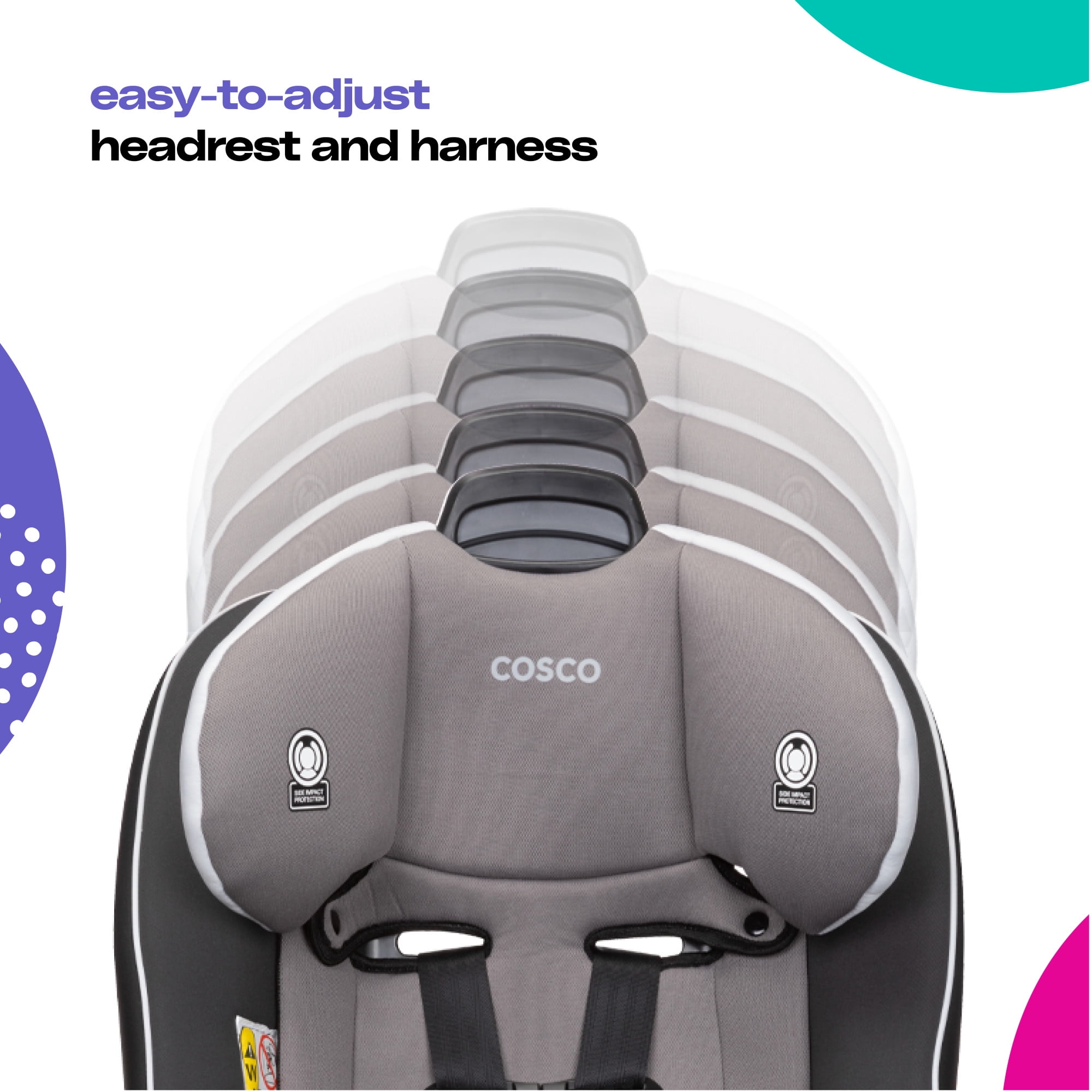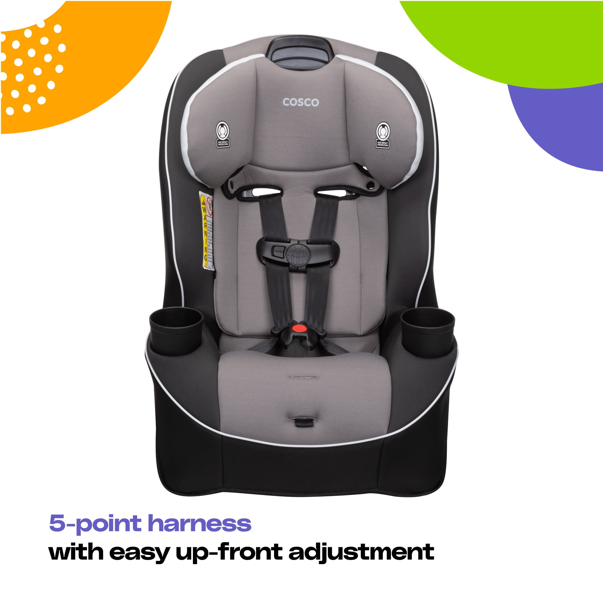 Cosco Kids™ makes choosing the right car seat simple! The Easy Elite All-in-One car seat has your family covered from rear-facing baby to big kid booster with a range of 5-80 pounds. (Rear-facing; 5–40 lbs., Forward-facing; 30–50 lbs., Belt-positioning; 40–80 lbs.) The Easy Elite also adapts to your growing family with the ability to fit three seats across the back of most cars. This all-in-one convertible car seat keeps your child safely in the rear-facing position from 5 to 40 pounds and includes a removable body pillow to give a smaller baby a snug fit. It can also be used in the forward-facing position for kids 30 to 50 pounds. In both rear and forward-facing positions, the easy-to-use headrest and harness adjust quickly and easily with one hand. There’s no need to uninstall the seat or rethread the straps. When your child is ready, remove the harness to easily convert the Easy Elite to a belt-positioning booster for big kids up to 80 pounds. Each stage provides Side Impact Protection to keep your child safer during the ride. The Easy Elite car seat is easy to care for too. With kids in the car, messes happen. Thanks to the easy-to-clean car seat pad, there’s no need to stress. The pad comes in a wide range of styles and colors, all of which remove from the seat and are both machine washable and dryer safe.