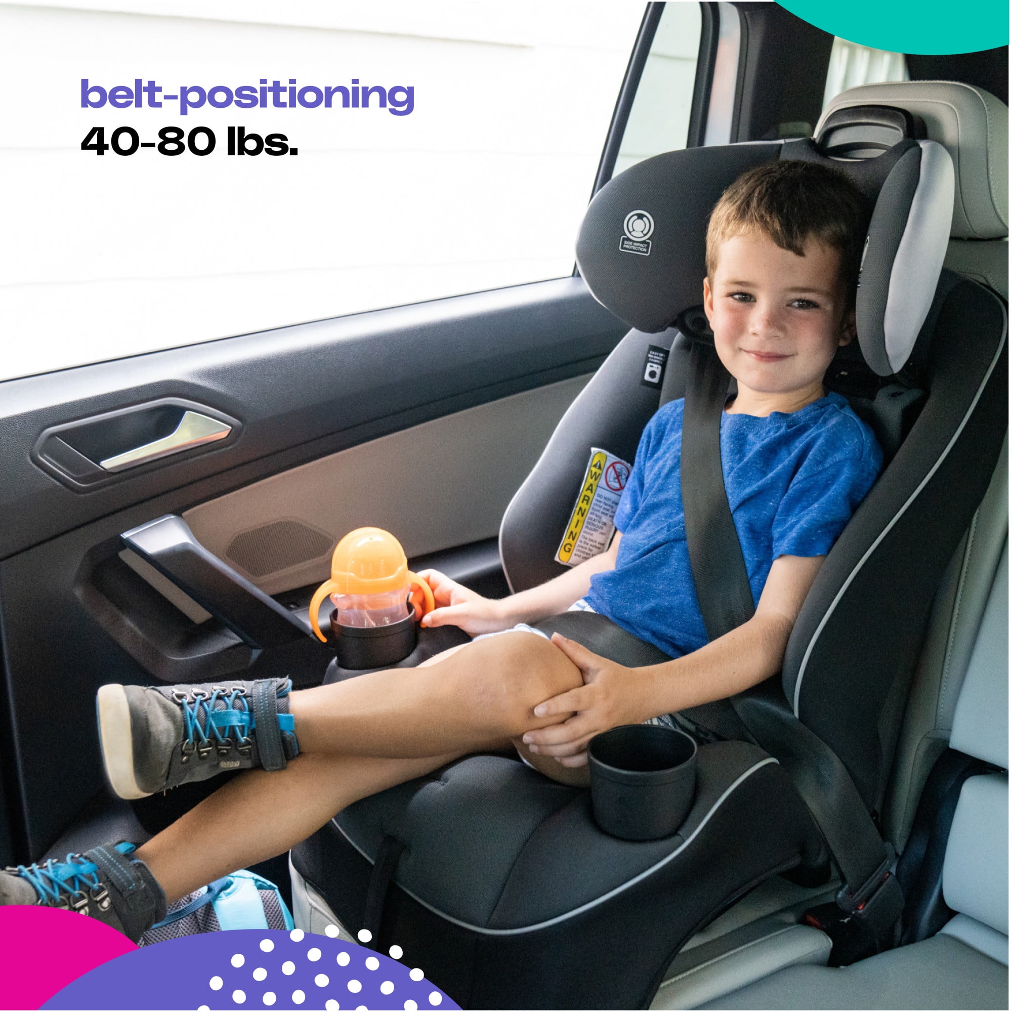 All-in-One Car Seat: Rear-facing 5–40 pounds, Forward-facing harness 30–50 pounds, and Belt-positioning 40–80 pounds Side Impact Protection 5-point harness with easy up-front adjustment Easy-to-use headrest and harness adjust quickly and easily with one hand Fits 3 across the back seat in most cars Body pillow gives a snug fit to smaller babies Machine washable, dryer seat pad 2 removable, dishwasher safe cup holders Recline for a better fit to your car Exceeds Federal Safety Standards
