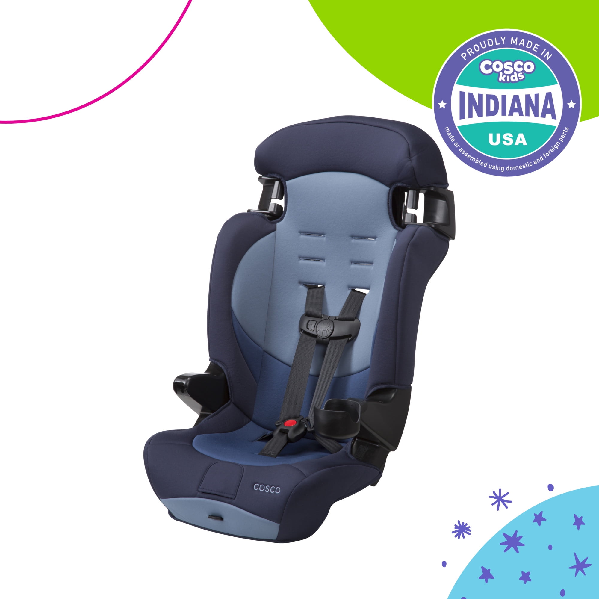 The Cosco Kids™ Finale DX 2-in-1 Booster Car Seat may be the last car seat you’ll ever need! It features extended use in both modes. It starts by keeping toddlers securely in a 5-point safety harness up to 65 lbs. In belt-positioning booster mode, it has them covered up to 100 lbs. It’s lightweight and easy to move from car to car––perfect for families on the go. The narrow design fits 3 across in the back seat of most vehicles, making it a smart choice for growing families with multiple kids in car seats at once. Removable seat pad is both machine washable and dryer safe. Proudly made in Columbus, Indiana.