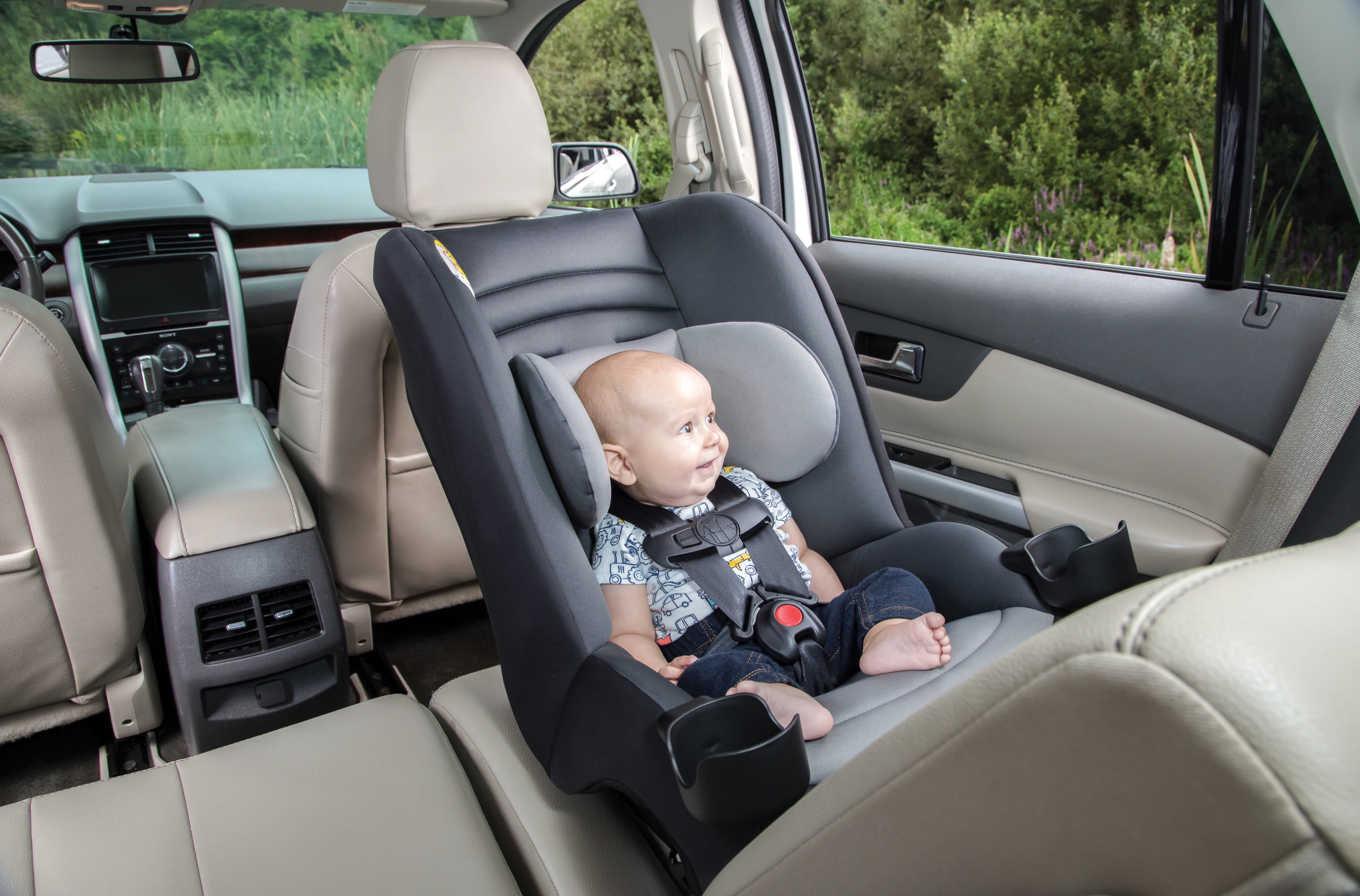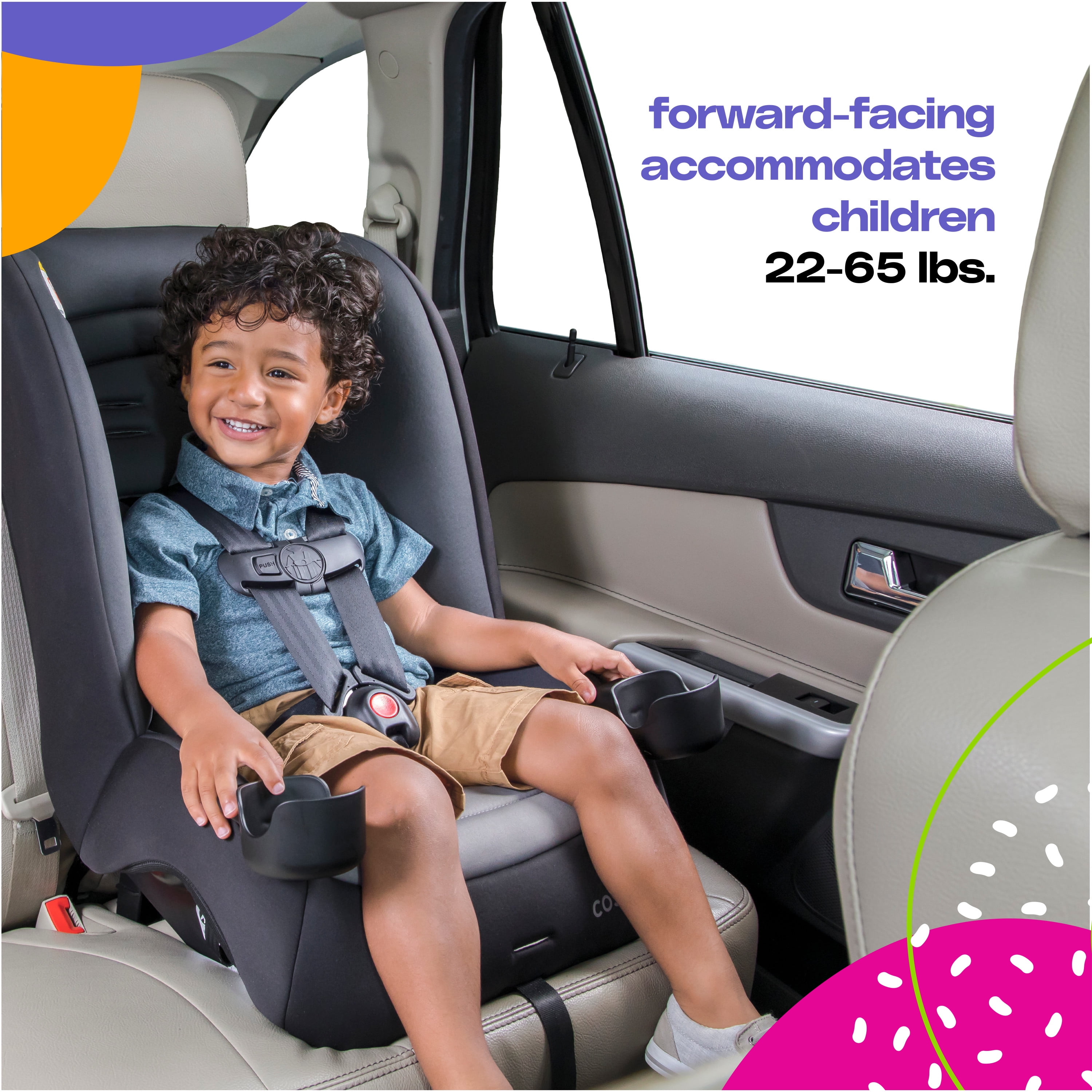 An extra-comfortable ride that lasts for years: Infant Rear-facing 5-40 pounds and Toddler Forward-facing 22-65 pounds Side Impact Protection Fits 3 across in the back seat of most vehicles 2 removable dishwasher-safe cup holders 5-point harness with easy up-front adjustment Machine washable and dryer safe fabrics LATCH equipped Airplane ready Exceeds Federal Safety Standards