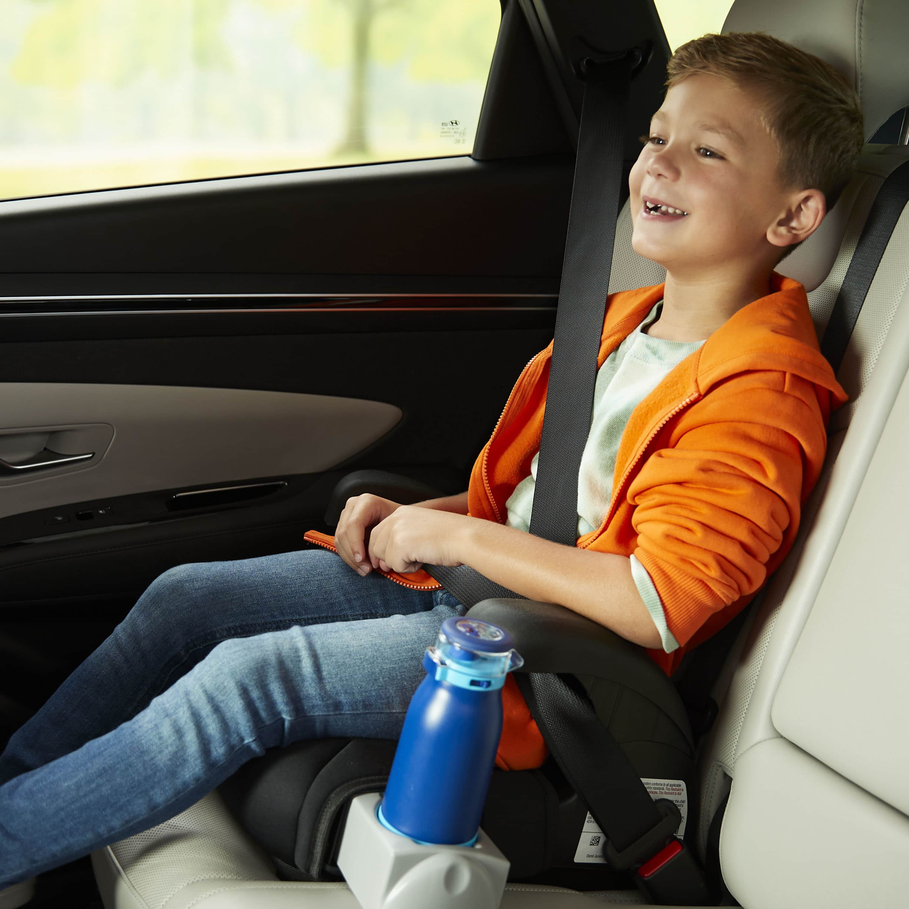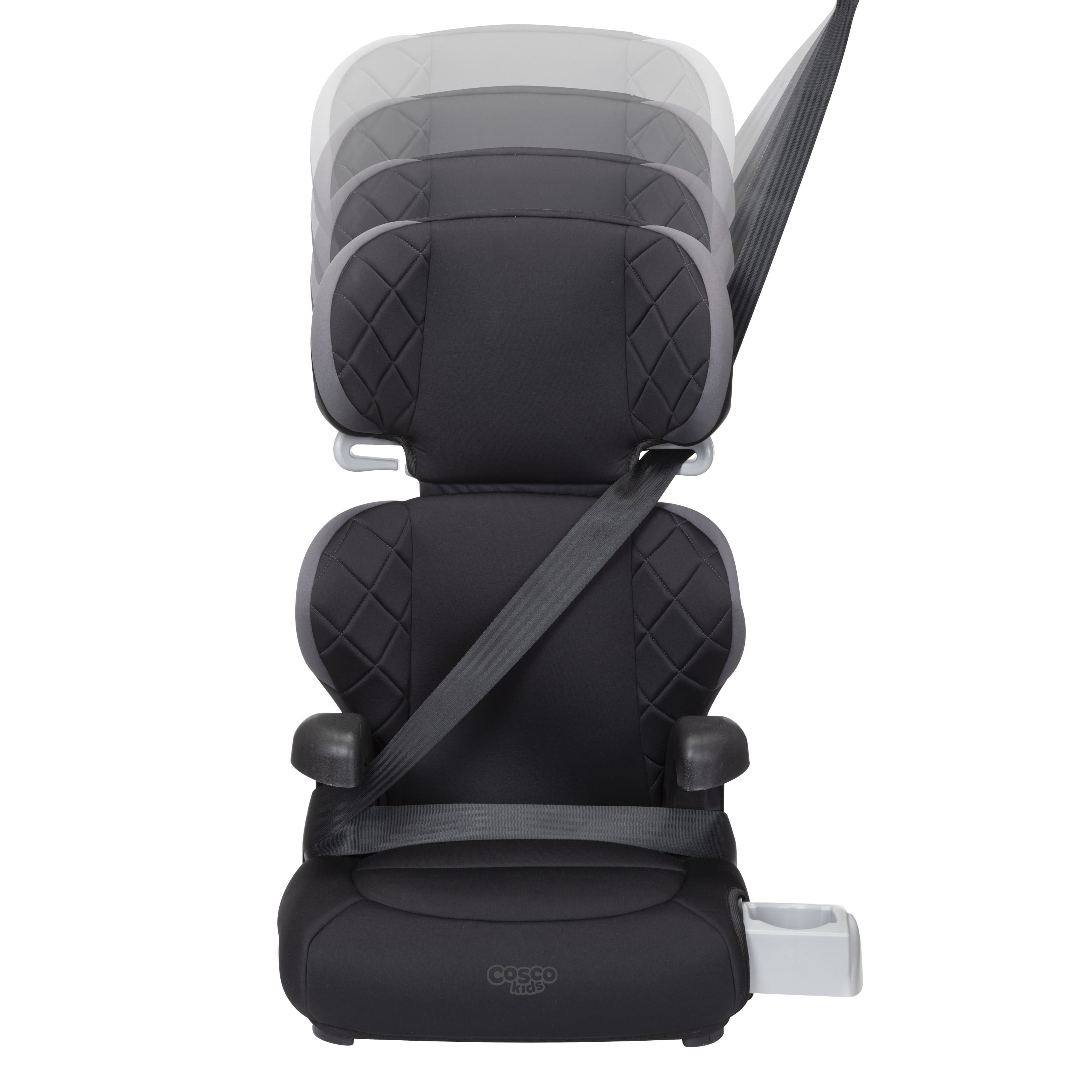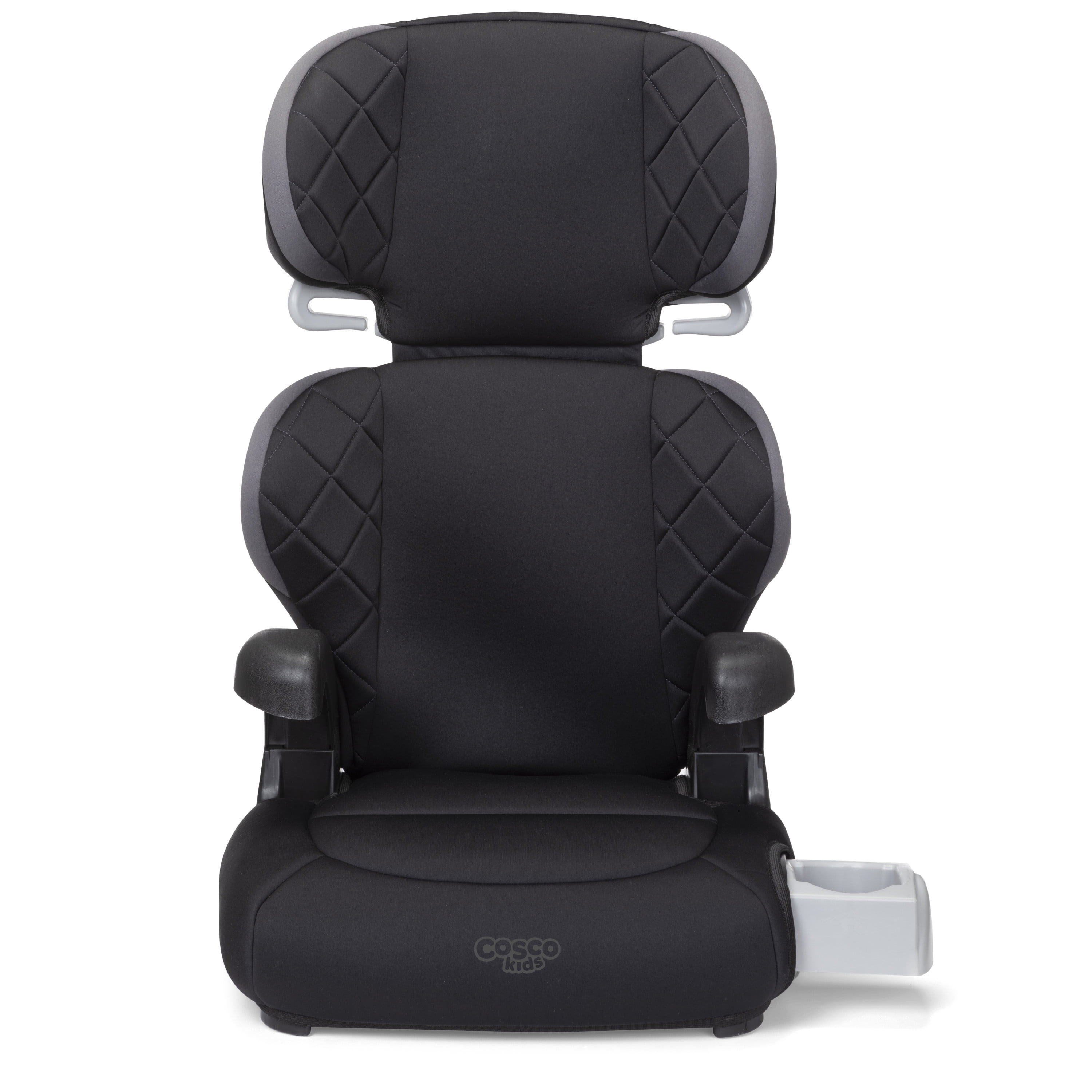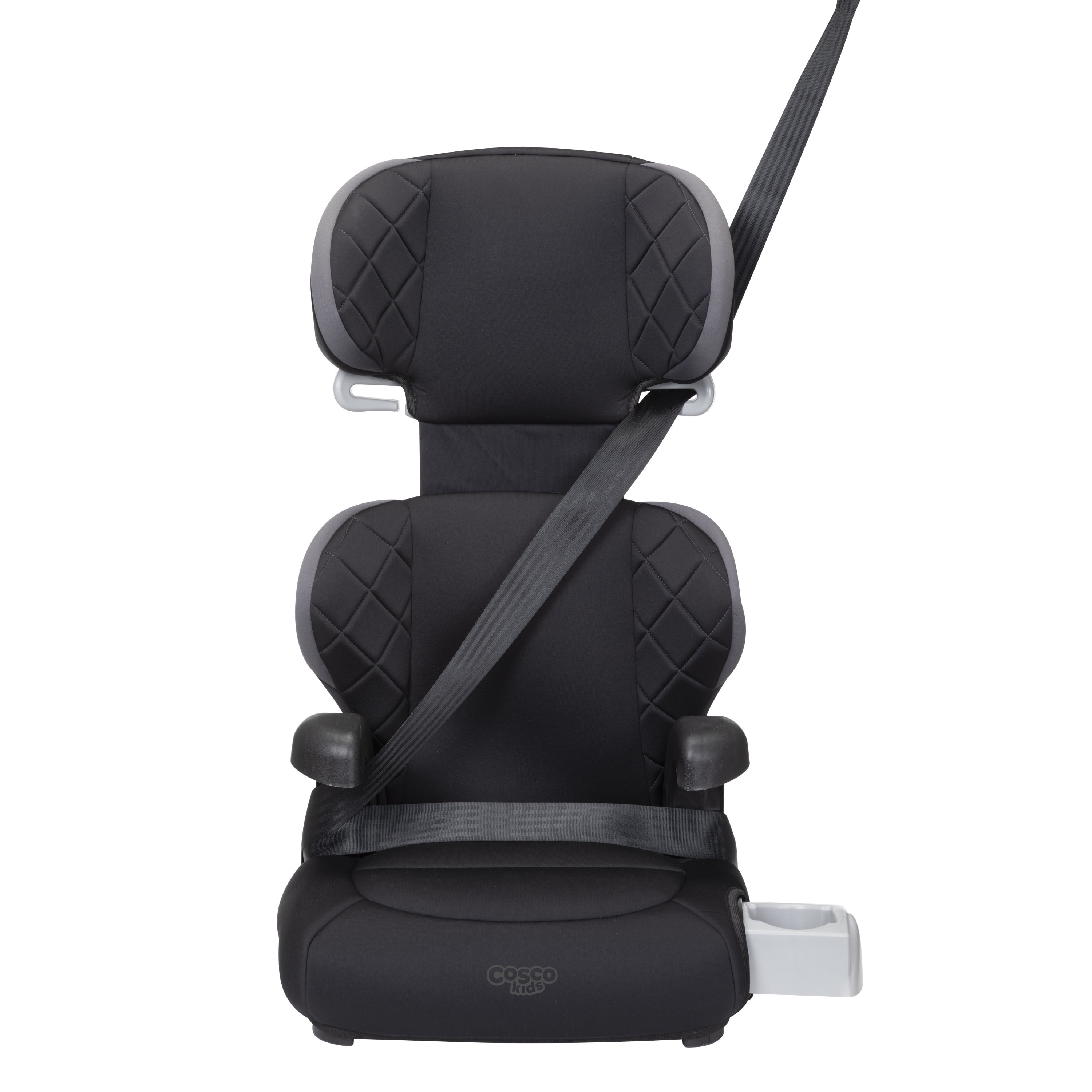 Belt-positioning booster: 40–100 lbs. 2 seats in 1: easily converts to a backless booster Washable seat pad Adjustable headrest grows with your child Integrated slide-out cup holder Shoulder belt guides Exceeds federal safety standards Headrest pillow for additional comfort