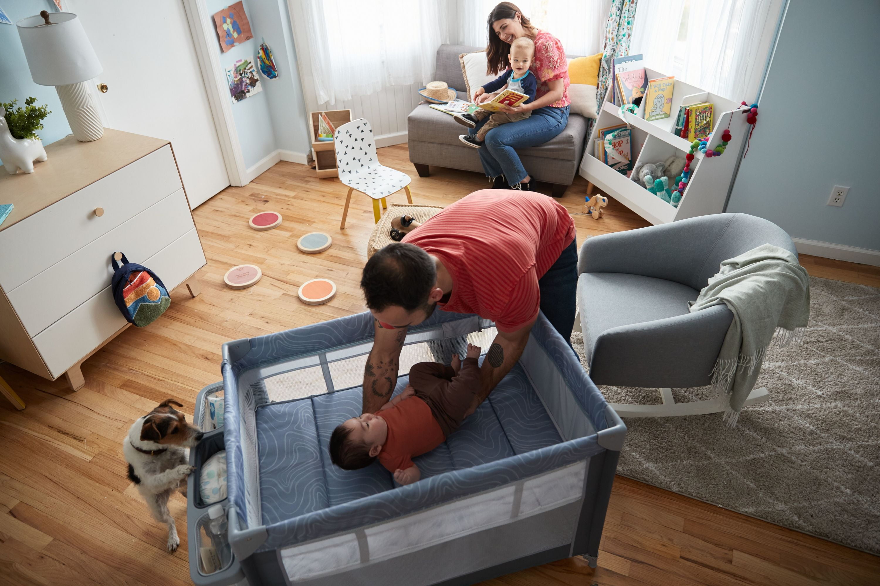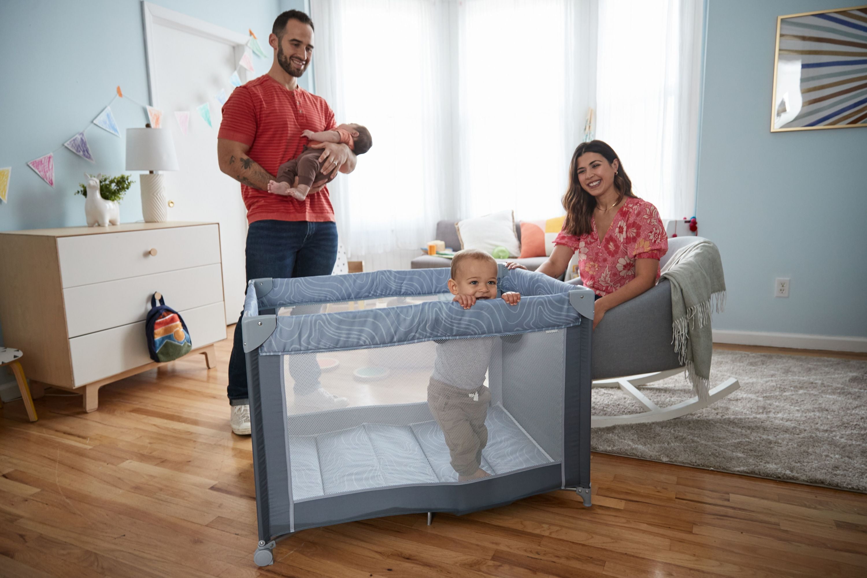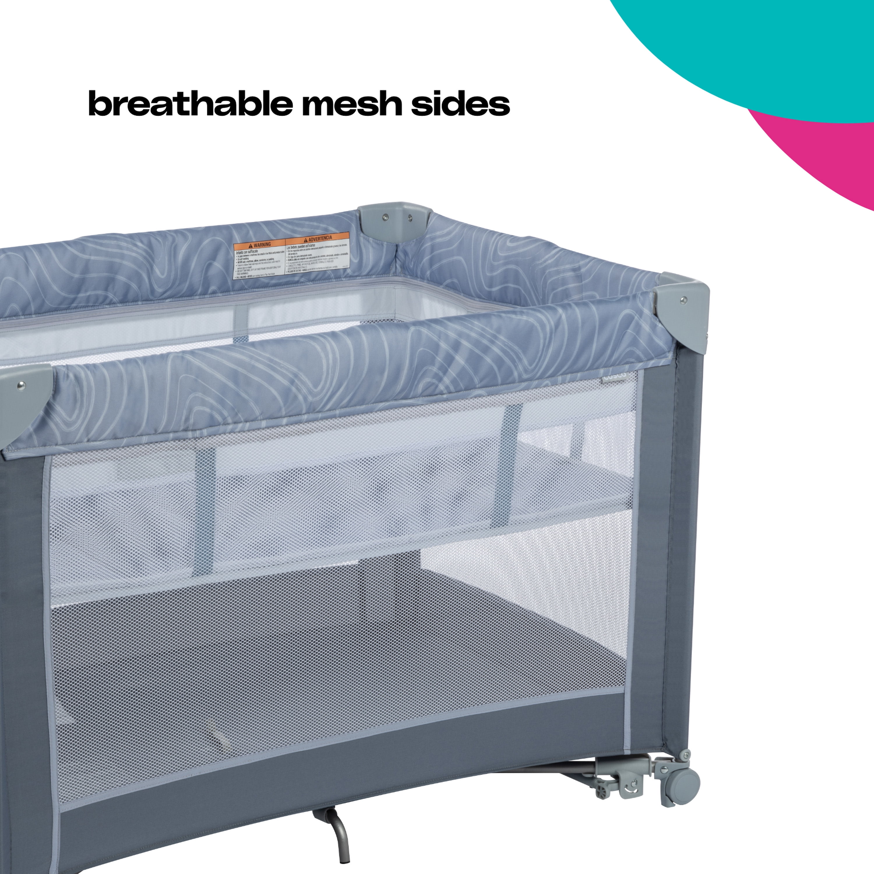 Cosco Kids Rocking Bassinet with Play Yard, Organic Waves 2 bassinet modes of use: gently calm your baby using rocking mode or secure in place in stationary mode Compact fold for easy storage Zip-on infant bassinet Storage compartment for accessories Carry bag for taking on the go Padded floor mat provides extra comfort 3 mesh sides for increased air flow (with the 4th side being a storage pocket) Suitable for babies up to 15 lbs. in bassinet mode and children up to 35” tall when used as a play yard Designed with fabrics made using recycled materials Designed with a firm, flat sleeping surface that meets the Consumer Product Safety Commission’s recommendations for safe sleep