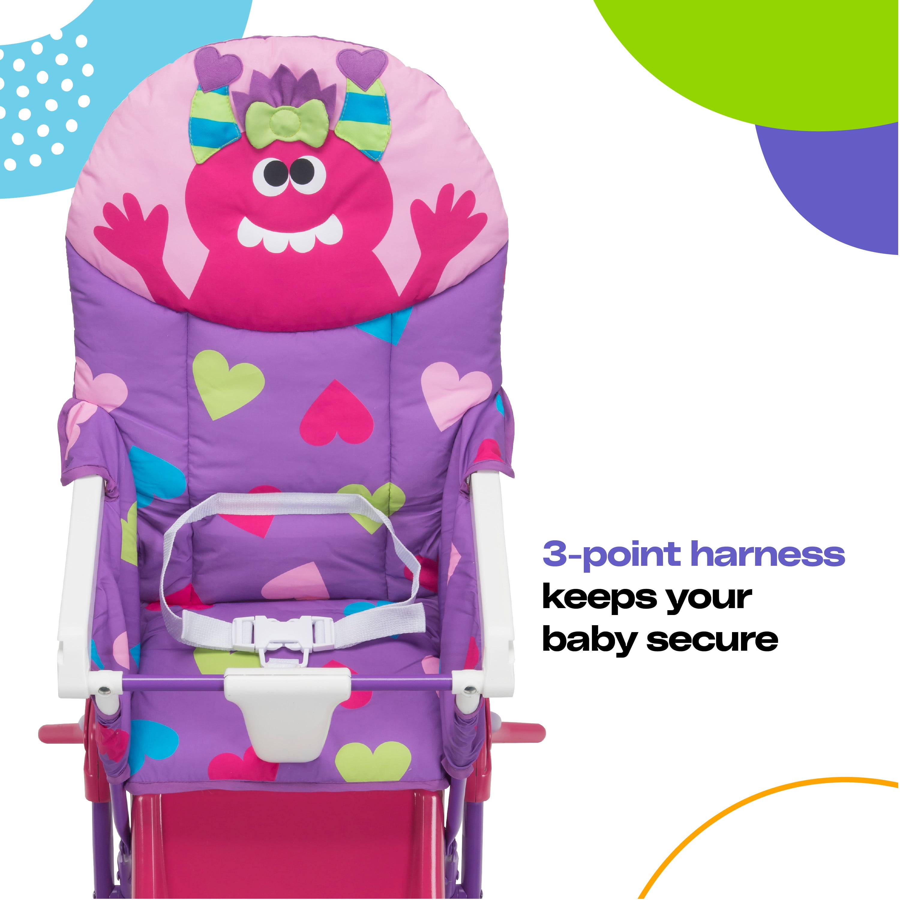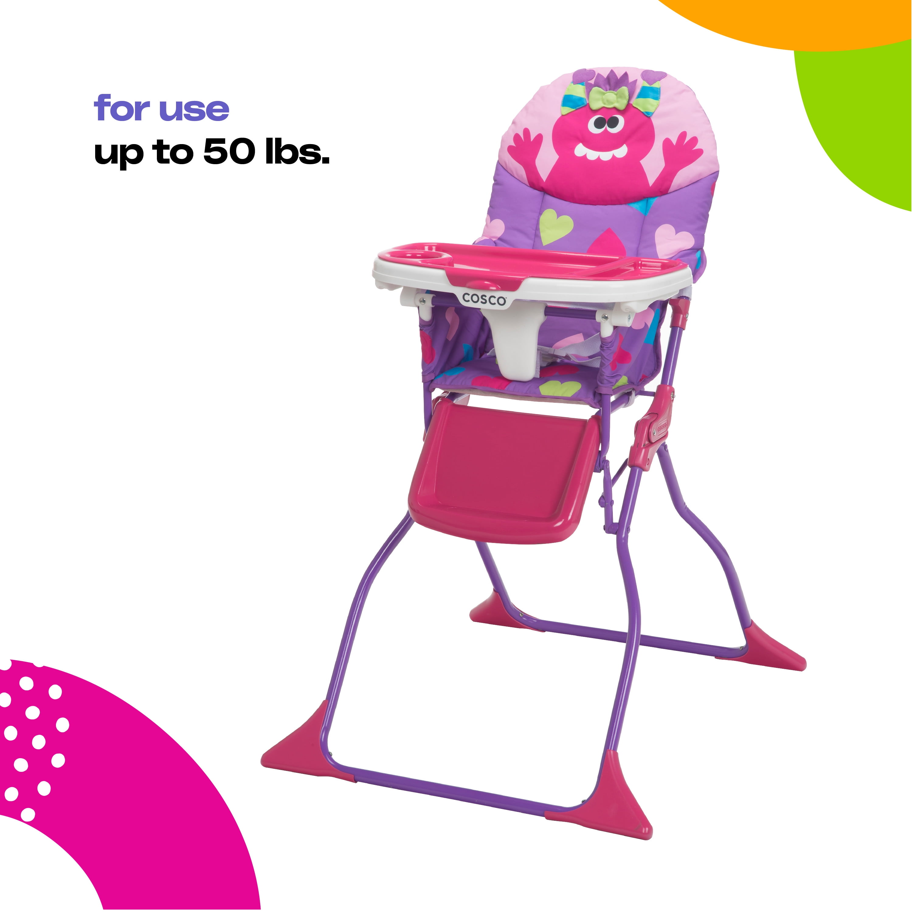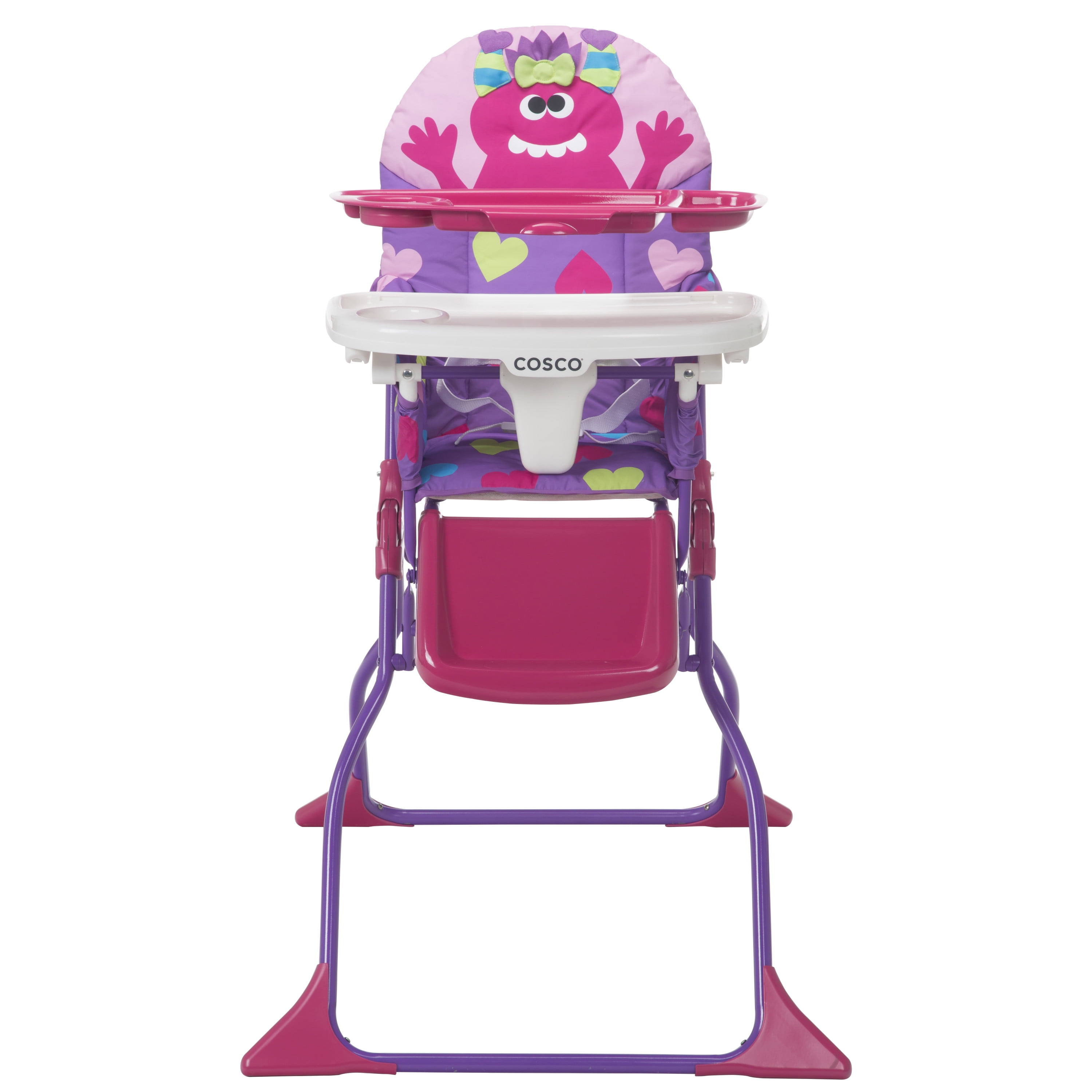 Invite a monster to mealtimes with a Cosco Kids Simple Fold Deluxe High Chair. The fun monster design will delight your little one, but the easy-to-clean design and slim fold will delight you. The wipeable seat pad makes it easy to wipe up after messy meals and the 3-position adjustable tray features a dishwasher safe insert. True to its name, the Simple Fold High Chair folds down quickly with no need to remove the tray which makes it simple to hide away or to take with you while on the go.