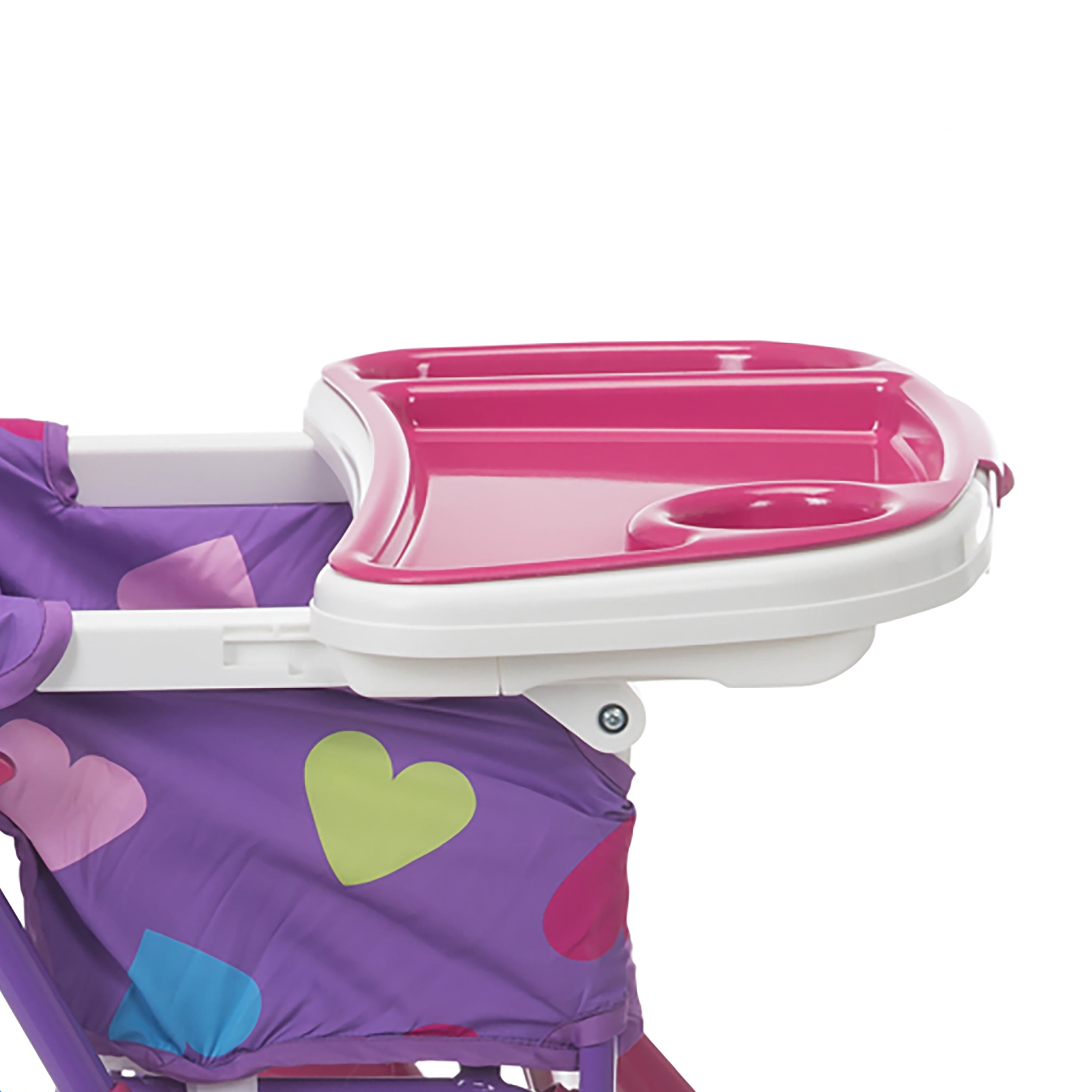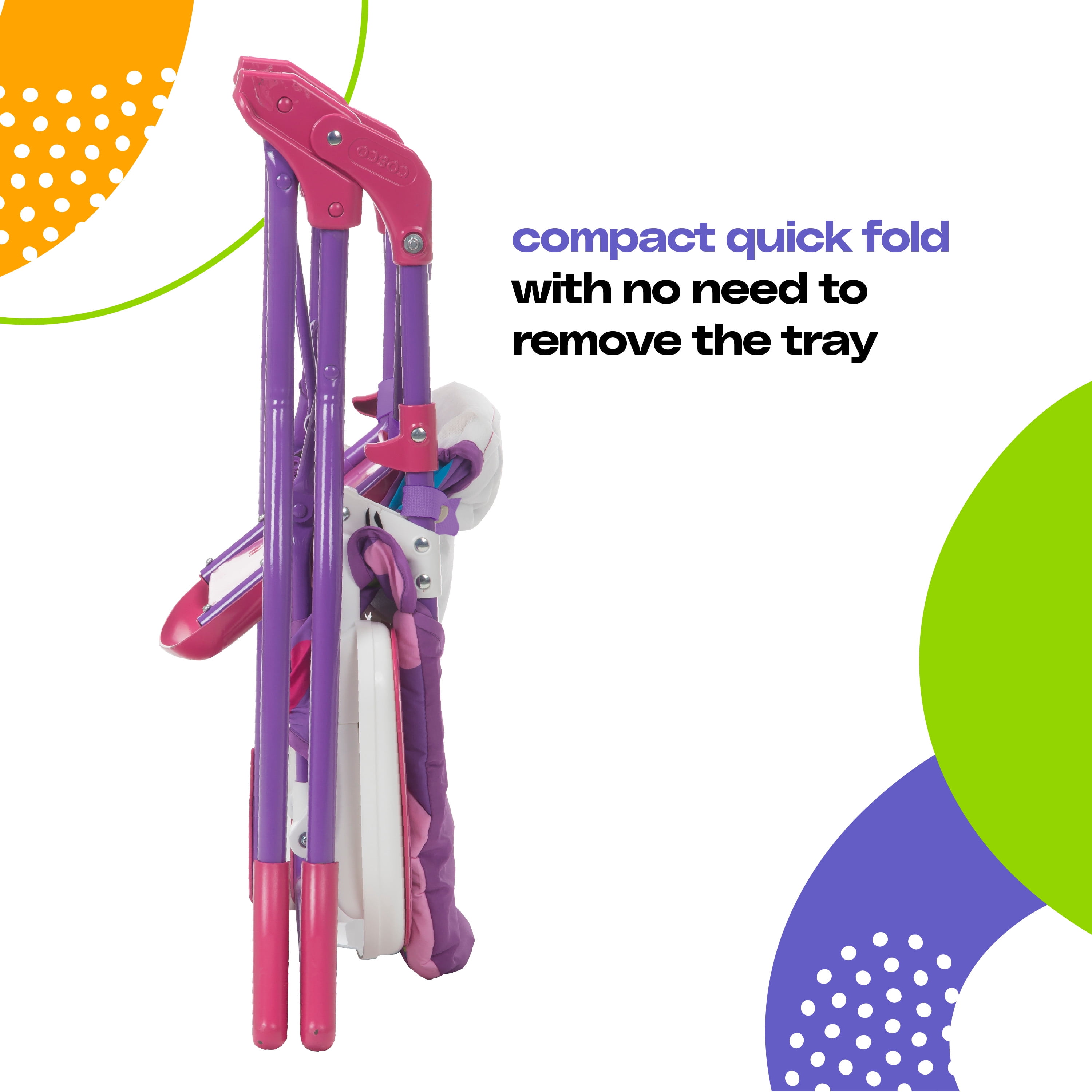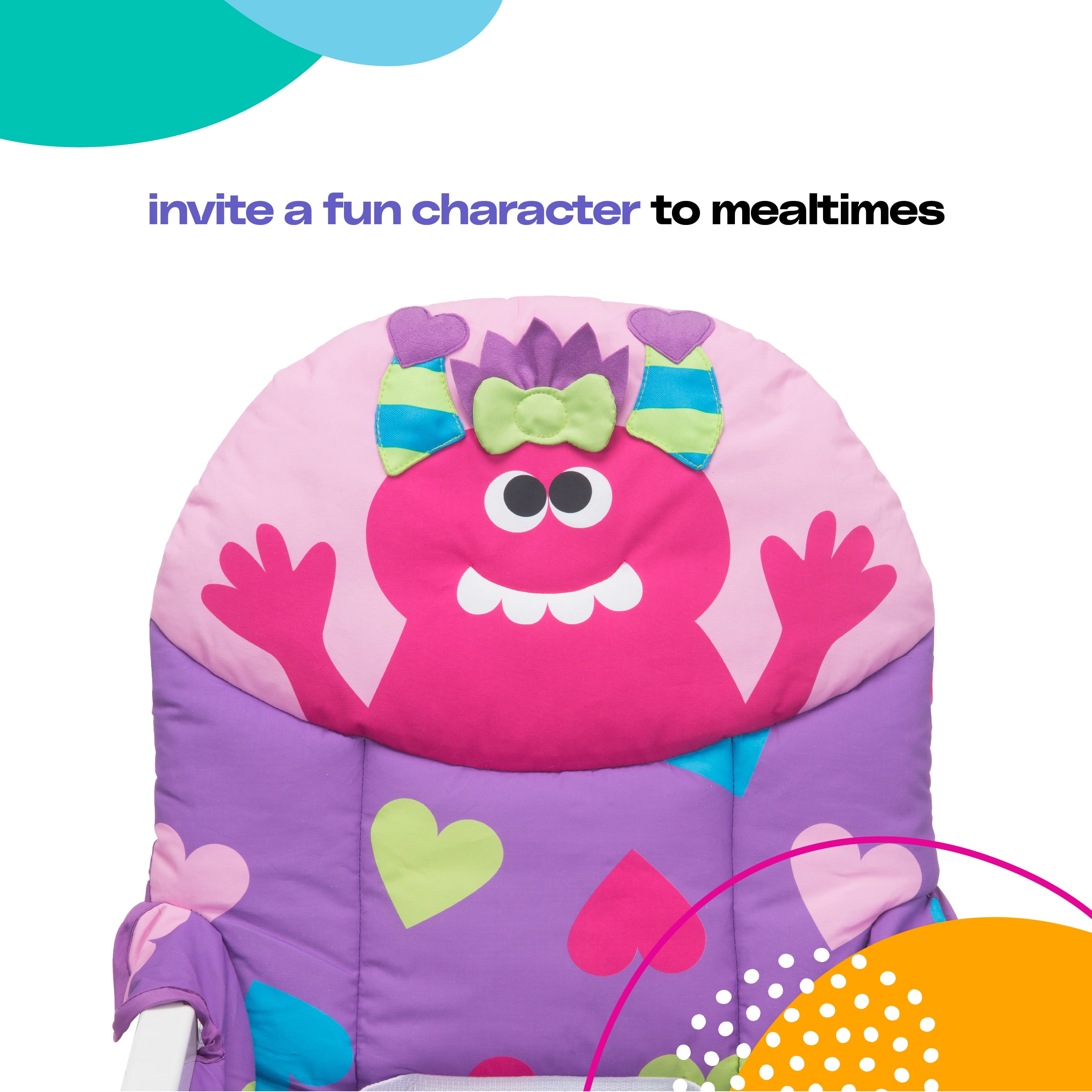 Invite a fun character to mealtimes Compact and quick fold with no need to remove the tray: simple to store or take along on the go Easy-to-clean design with wipeable seat pad and tray 3-position adjustable tray with cup holder includes a dishwasher-safe insert tray For use from 6 months and up to 50 pounds, the 3-point harness keeps your baby secure as well as your growing toddler