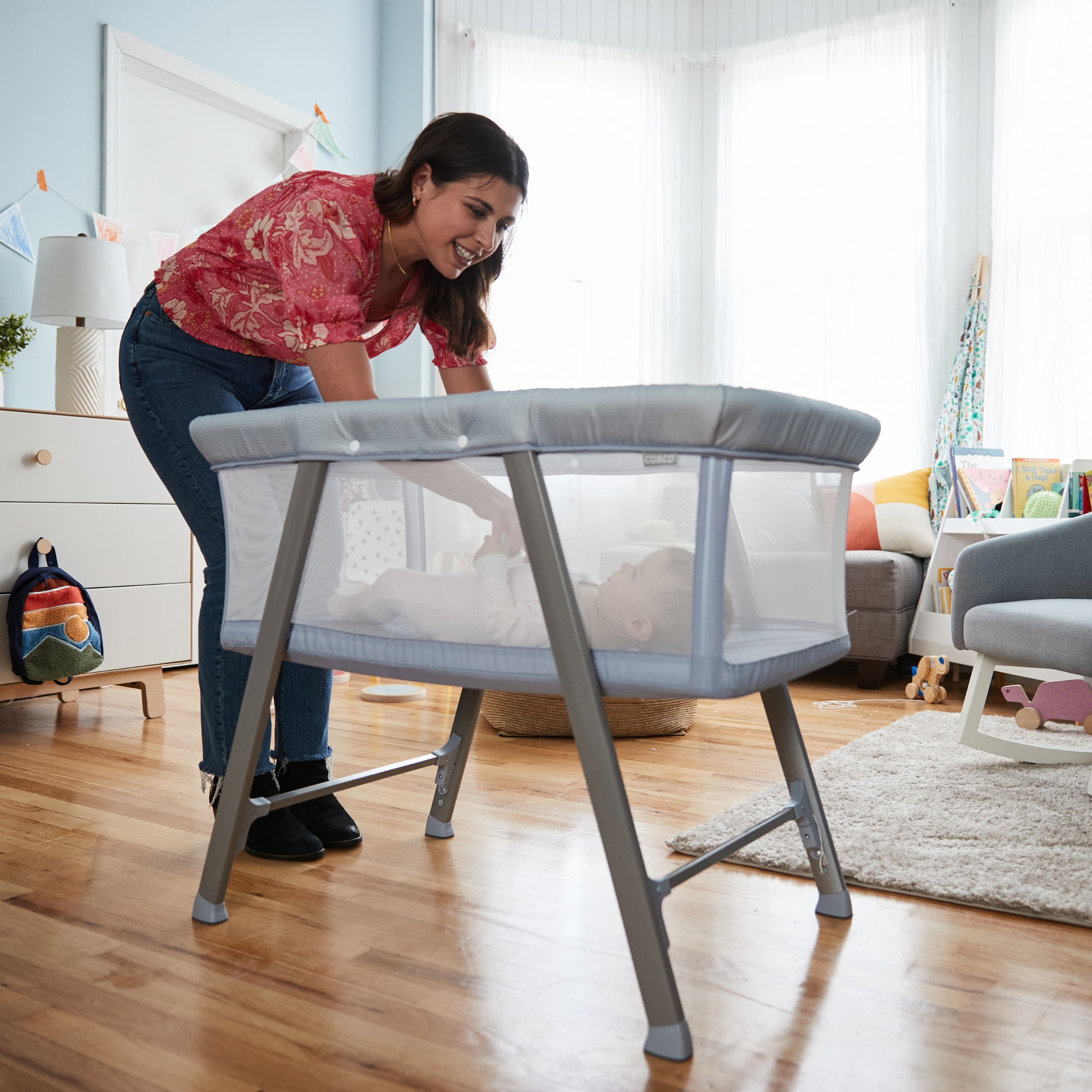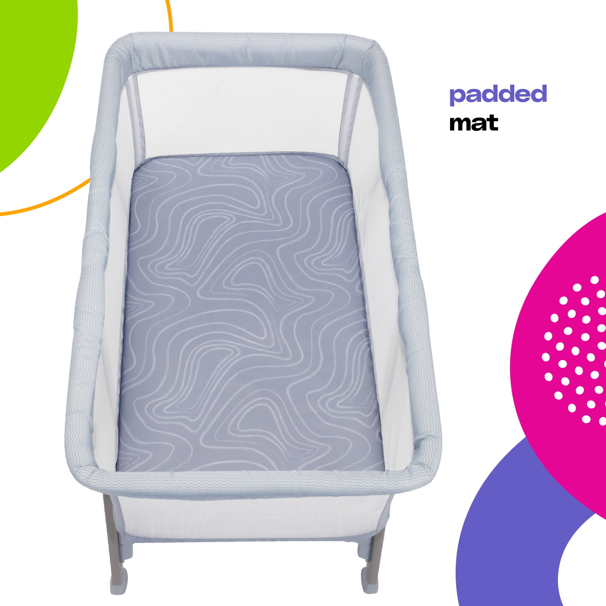 Cosco Kids SleepAway Baby Bassinet, Organic Waves Breathable mesh sides provide increased air flow and keep baby cooler Perfect size to place next to your bed, so you can keep your baby close Padded mat is designed for your baby’s comfortable and restful sleep Lightweight at 14.4 pounds Simple to transport, set up, or move from room to room with ease Color Category: Blue Designed with a firm, flat sleeping surface that meets the Consumer Product Safety Commission’s recommendations for safe sleep