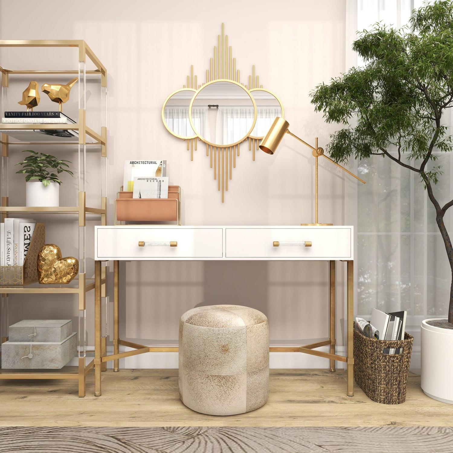 CosmoLiving by Cosmopolitan 27″ x 39″ Gold Wall Mirror is a unique addition to your stylish home. Apart from decorating your home, the purpose of this wall mirror is to bounce back outdoor light to a small room to make it look bigger. Pair this decorative wall mirror with house plants or other wall decor accent pieces to blend everything together perfectly. This round gold wall mirror showcases a finish and silhouette that suits both glam and natural-themed living room and dining interiors. This item ships in 1 carton. Can be hung vertically using the sawtooths; nails and screws not included. Suitable for indoor use only. This item ships fully assembled in one piece. This is a single gold colored entryway mirror. Contemporary style.
