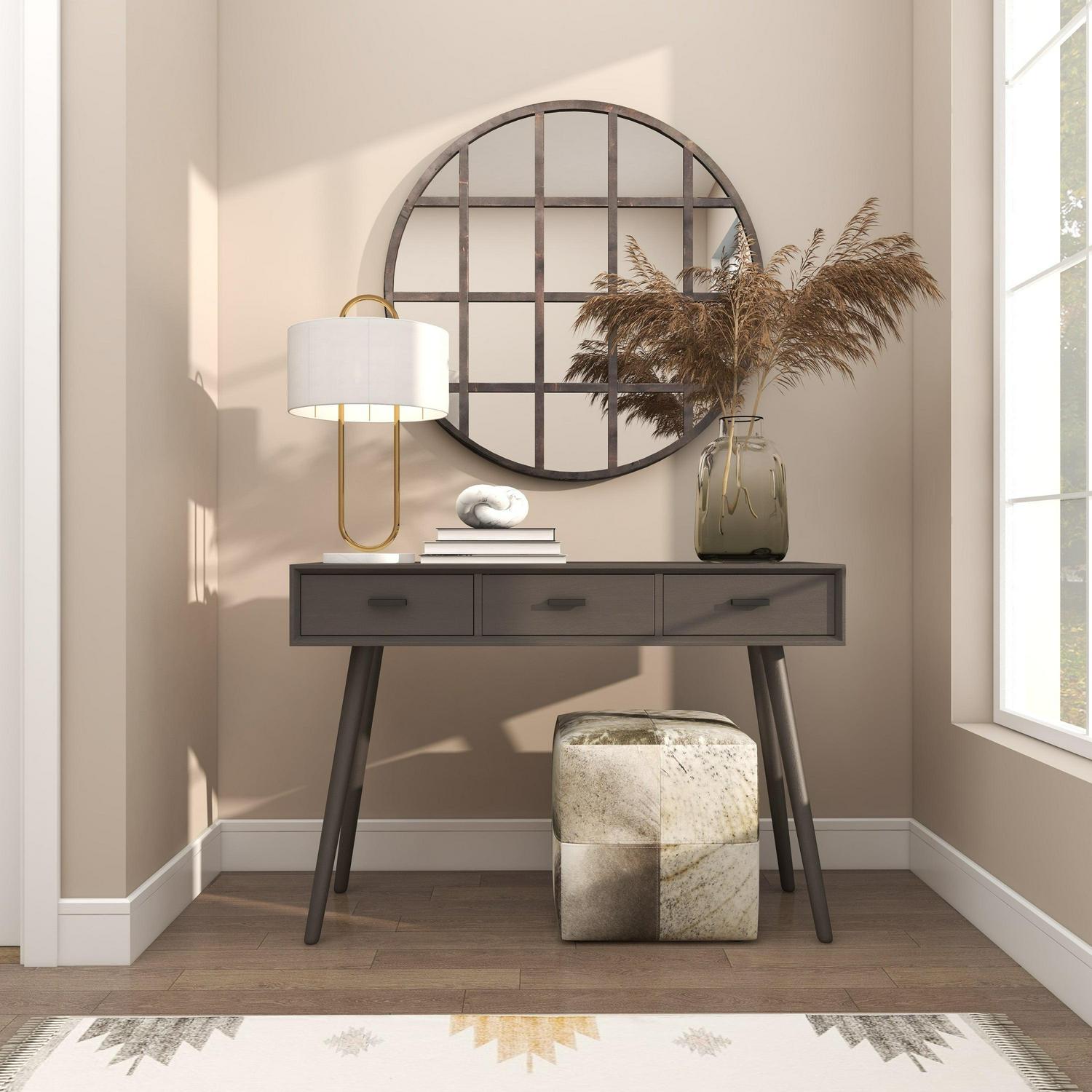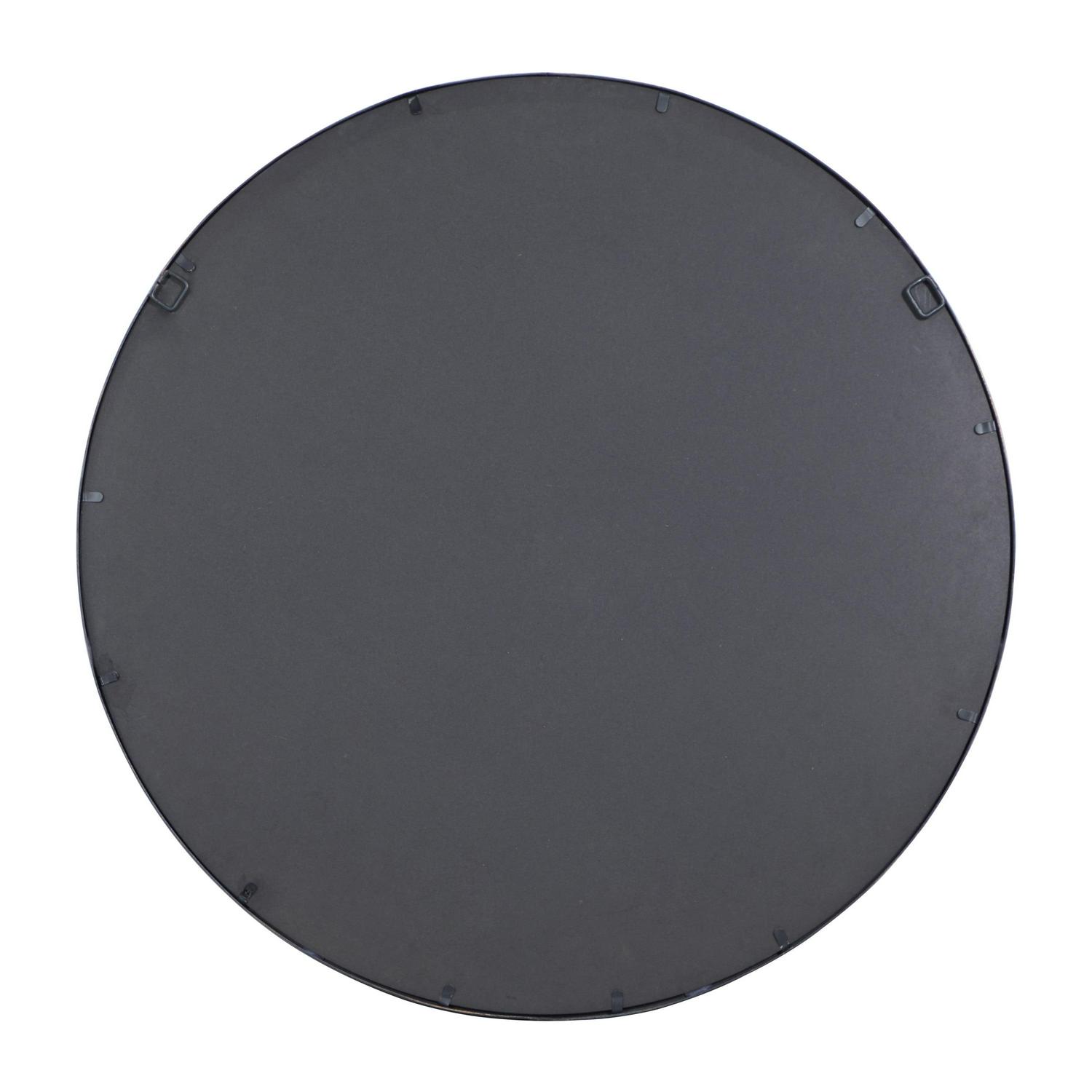 – This round wall mirror features a semi-matte dark silver finish with copper-finished rust highlights