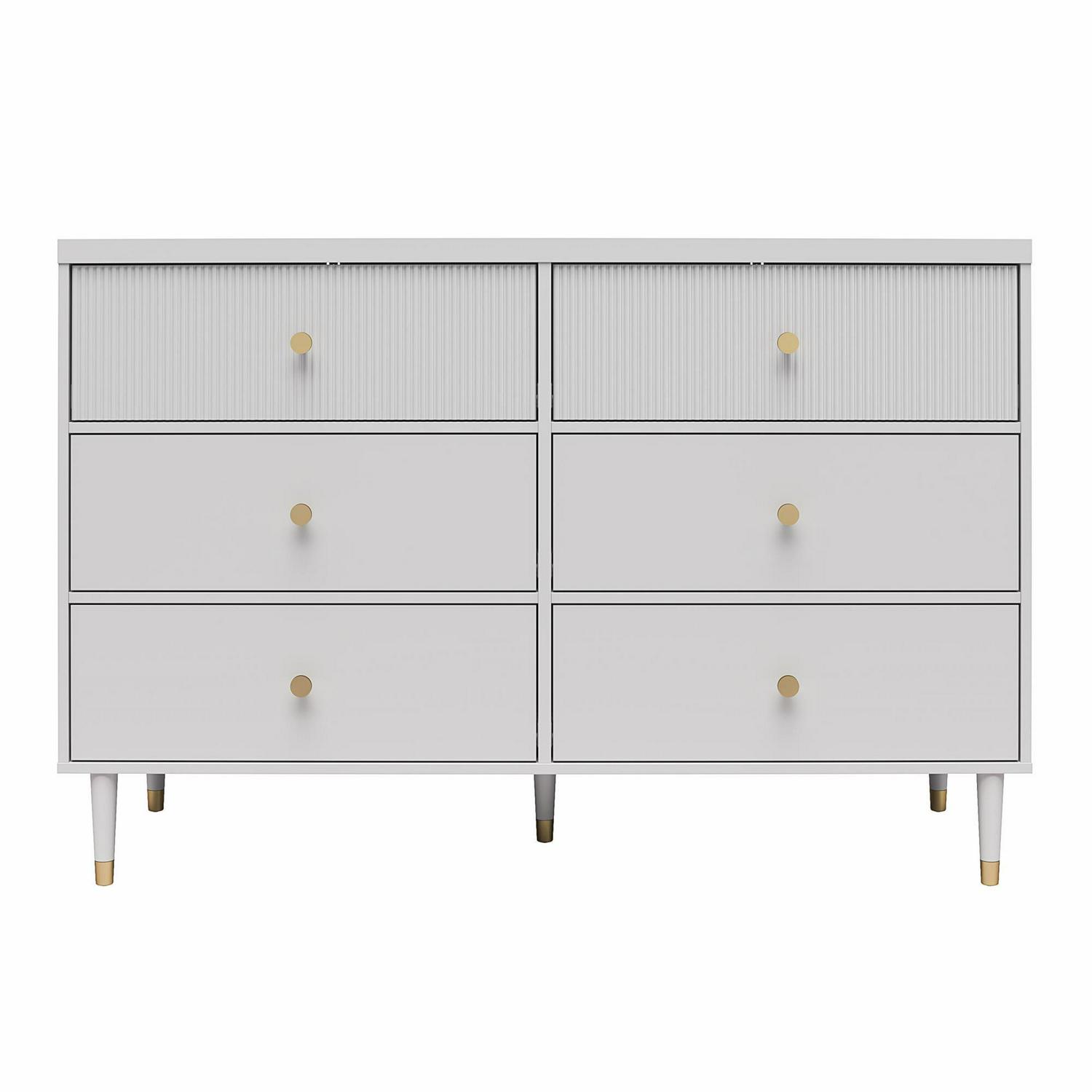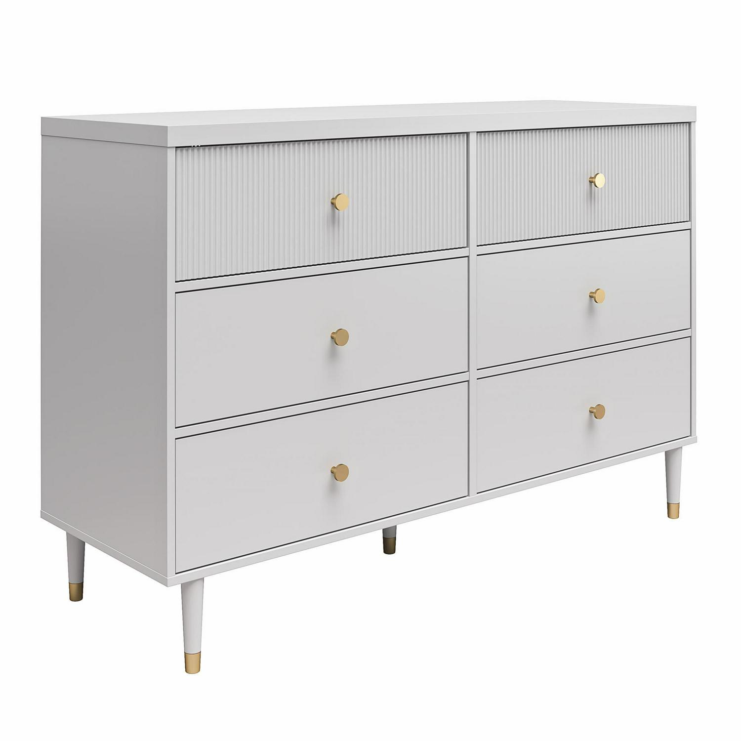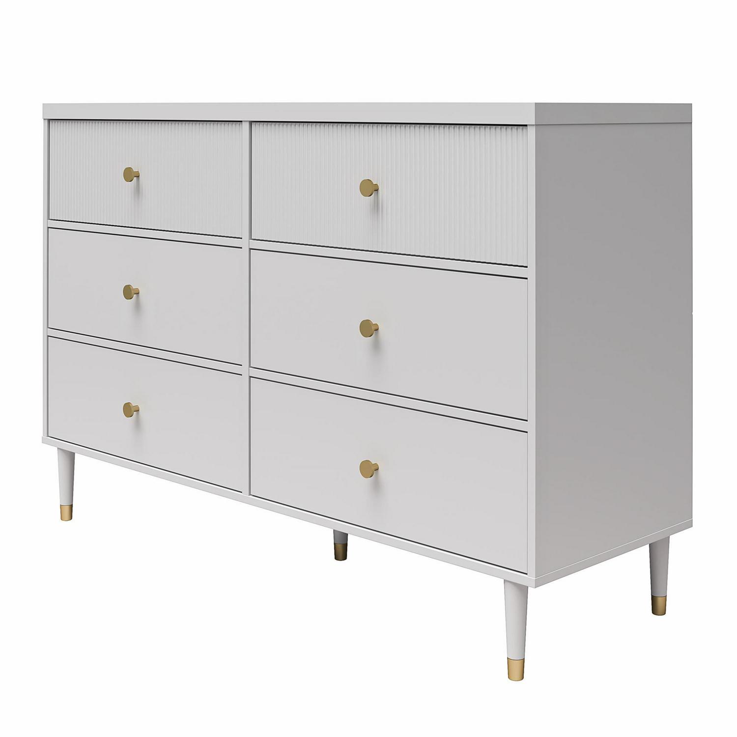 CosmoLiving by Cosmopolitan brings you a truly Pinterest-worthy bedroom ensemble with the lavish, lux Elizabeth Collection. The contemporary chic design of the Elizabeth 6 Drawer Dresser melds perfectly with midcentury modern contours to create an instant focal point in any room. Fabulously designed with 2 ribbed, textured drawer fronts, and 4 smooth, adorned with glam gold drawer pulls. The 6 sizable drawers, painted in a creamy dove gray finish, are the epitome of subtle and chic. Constructed from durable painted MDF, the Elizabeth 6 Drawer Dresser beautifully sits atop tapered solid wood legs, nestled in gold capped feet, creating a sophisticated and polished look, fit for a modern-day queen like yourself. Totally transform your living space with the entire Elizabeth Collection from CosmoLiving by Cosmopolitan. (Each sold separately)