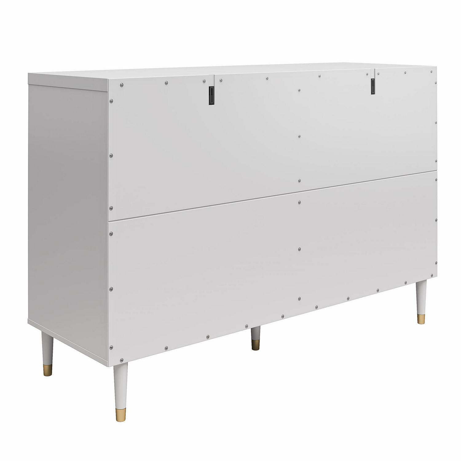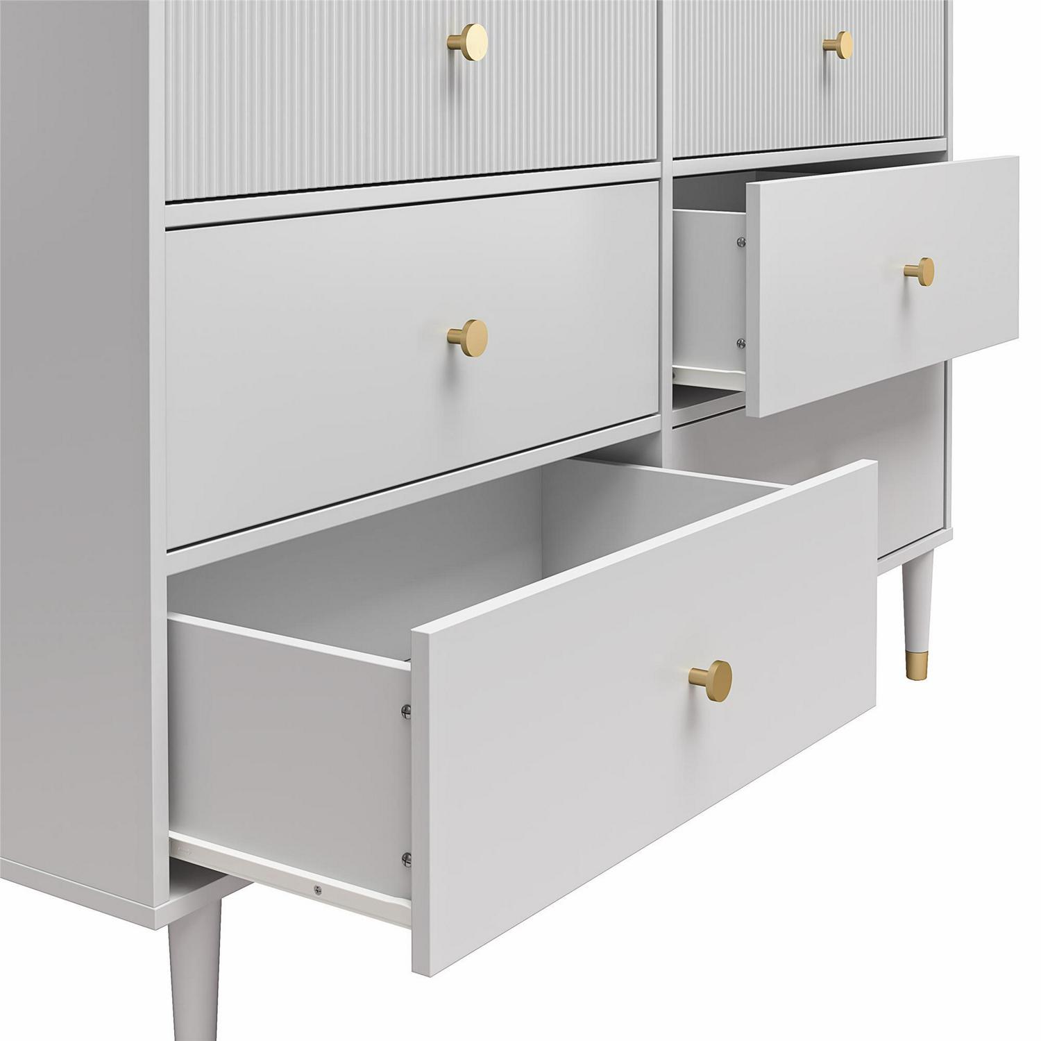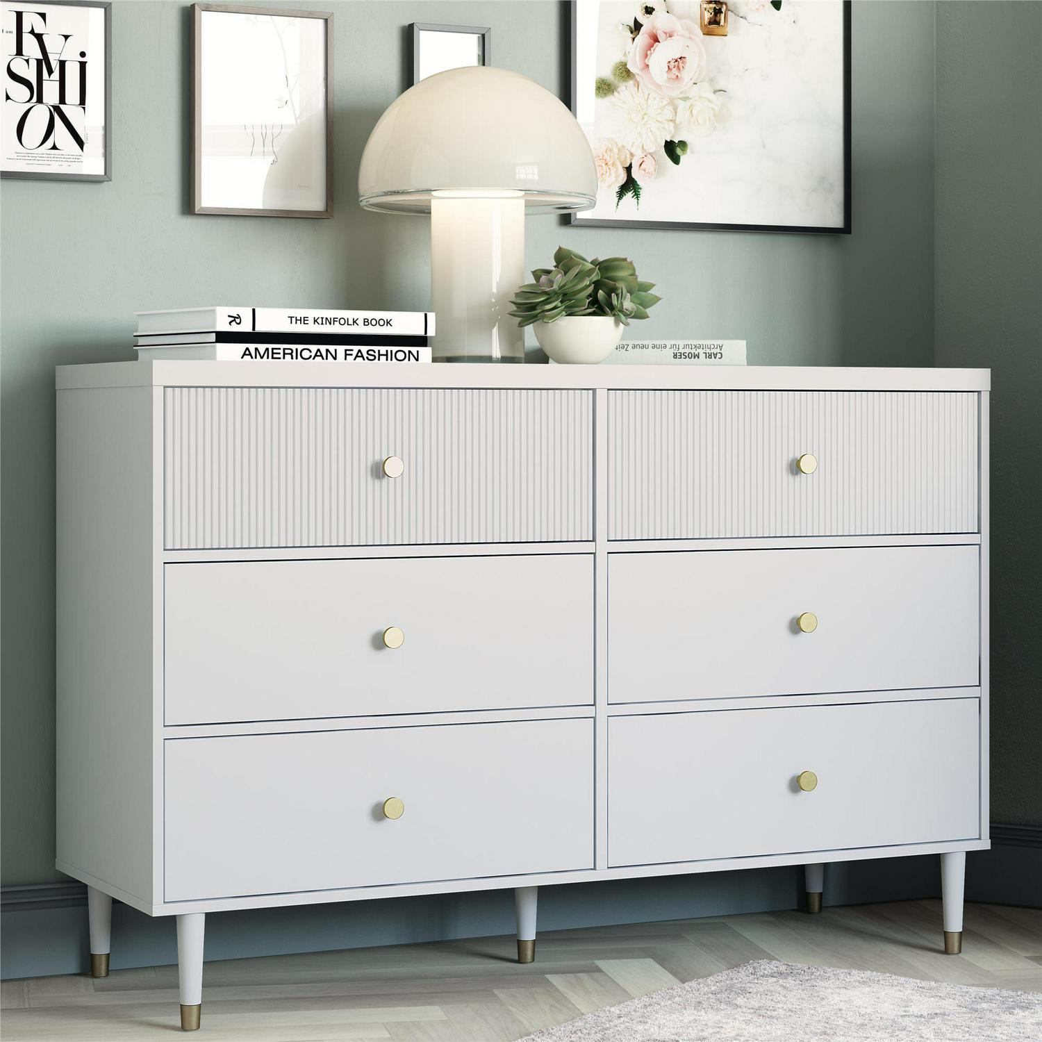 CosmoLiving by Cosmopolitan brings you a truly Pinterest-worthy bedroom ensemble with the lavish, lux Elizabeth Collection. The contemporary chic design of the Elizabeth 6 Drawer Dresser melds perfectly with midcentury modern contours to create an instant focal point in any room. Fabulously designed with 2 ribbed, textured drawer fronts, and 4 smooth, adorned with glam gold drawer pulls. The 6 sizable drawers, painted in a creamy dove gray finish, are the epitome of subtle and chic. Constructed from durable painted MDF, the Elizabeth 6 Drawer Dresser beautifully sits atop tapered solid wood legs, nestled in gold capped feet, creating a sophisticated and polished look, fit for a modern-day queen like yourself. Totally transform your living space with the entire Elizabeth Collection from CosmoLiving by Cosmopolitan. (Each sold separately)