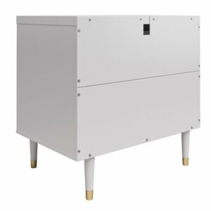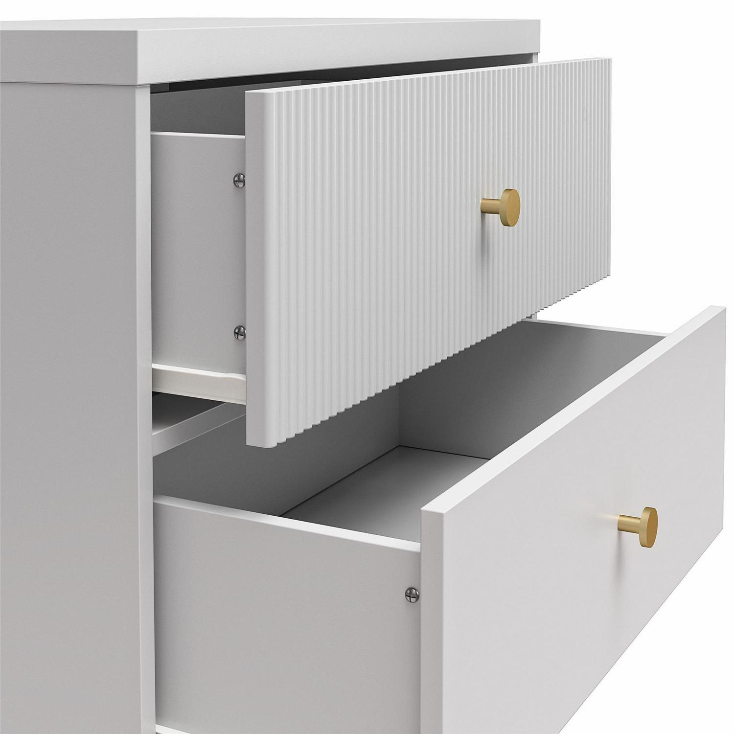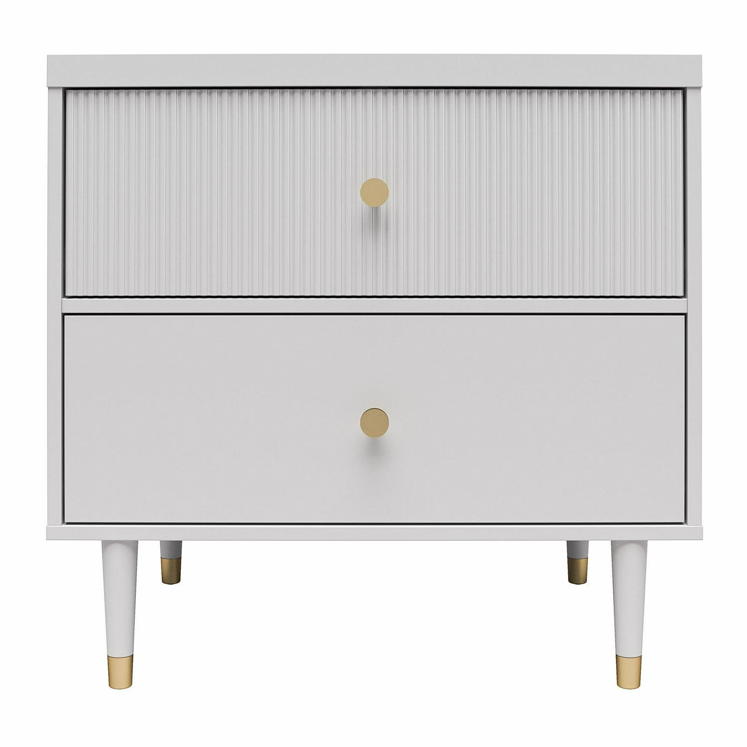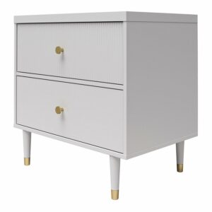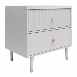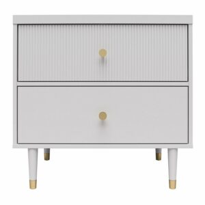 – Constructed from durable painted MDF & featuring midcentury modern contours and textured ribbed drawer fronts with gold accents; Two roomy drawers with sturdy metal slides