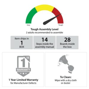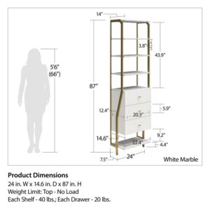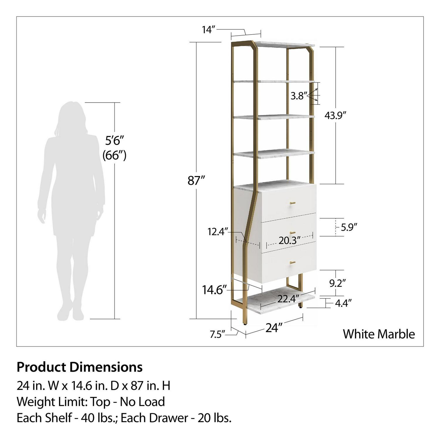 – Assembly required. Two adults recommended to assemble. Assembled measurements: 24 W x 14.6 D x 87 H. Max weight capacities: Shelves (x5): 40 lbs. each. Drawers (x3): 20 lbs. each. Assembled product weight: 93.44 lbs.