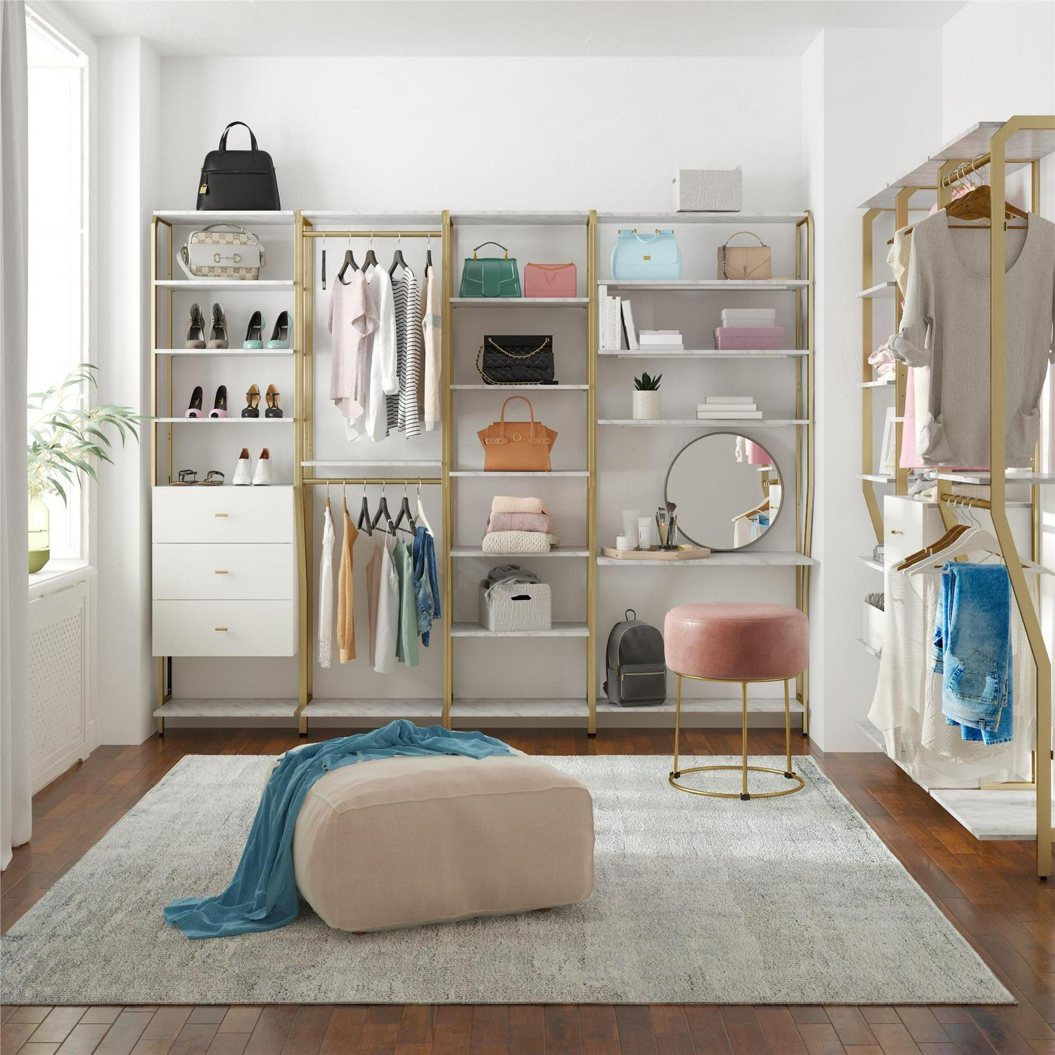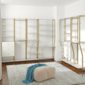 – The glamorous Gwyneth customizable closet system is comprised of durable engineered wood and powder-coated metal
