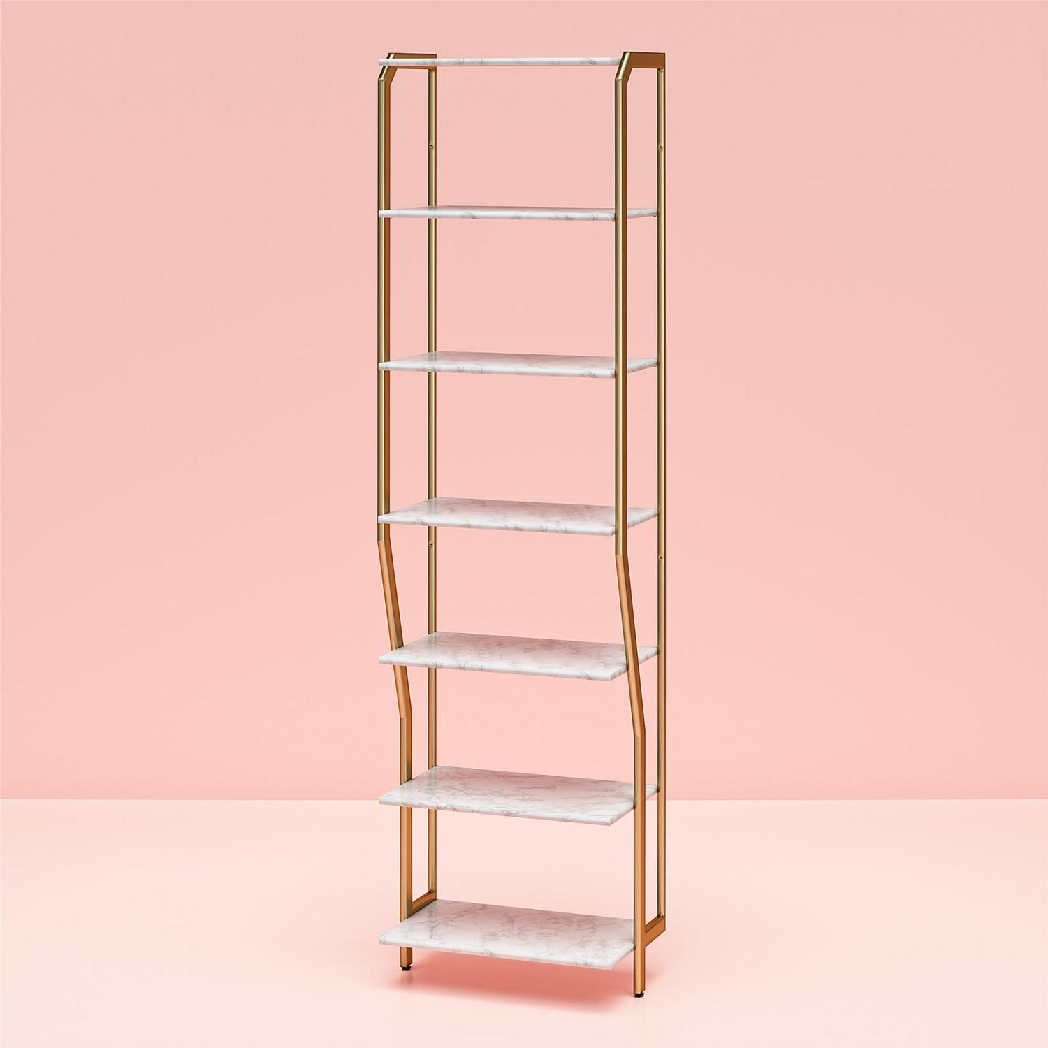 PSA: You can make your space look SO much well, spacey-er with CosmoLiving! This open Boutique-style closet organizer eliminates the need for bulky closet doors while visually increasing the square footage of a room! What more could you want CosmoLiving by Cosmopolitan slays the closet game with the gorgeous and truly glamorous Gwyneth Closet Organizing System. This stunning customizable closet system comprised of durable engineered wood and powder-coated metal allows you to mix and match your way to a highly organized open wardrobe. Designed to look like custom built-ins (without the designer price tag) these faux marble and gold closet gems allow you to show off your most prized possessions like a work of art. Use as individual pieces or integrate several units together for a coordinated look. (each unit sold separately) Stored behind closed doors, Gwyneth brings much needed structure to your current closet space. No closet No problem! Forget the doors and add depth to your bedroom by placing the units on an open wall or corner of the room. The stand-alone Gwyneth Closet Shelves unit provides a total of 6 spacious shelves for all your *pretty things*, 4 of which are adjustable to suit your individual storage needs. Mix and match with the entire Gwyneth Collection. (each sold separately)