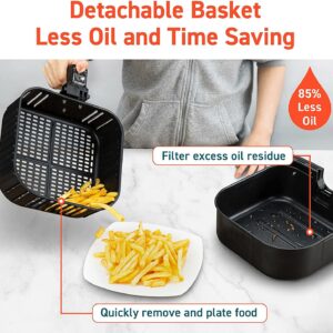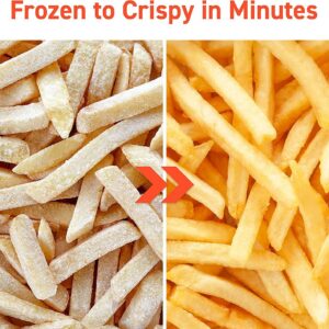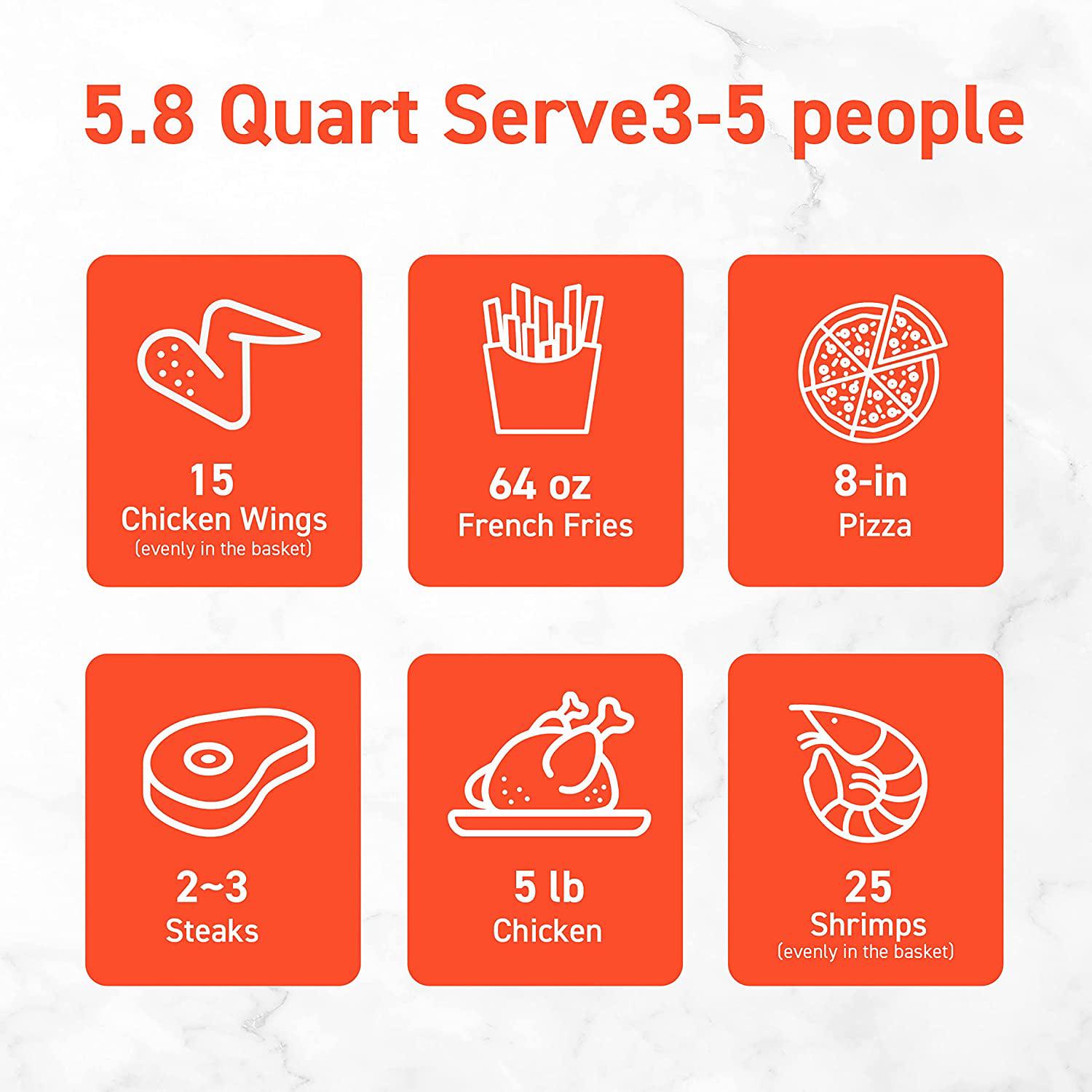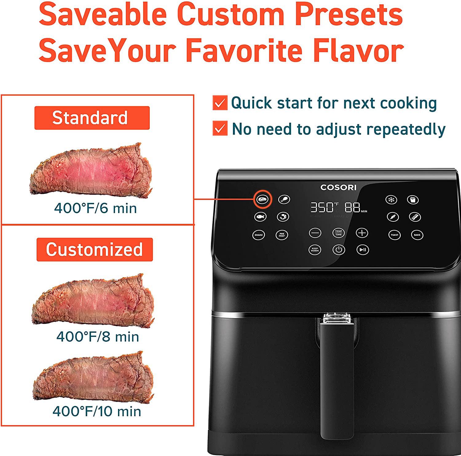 Cooking with our Cosori air fryer allows you to make the same foods you normally enjoy deep-fried but with 85% less oil. Meet your health goals without sacrificing your favorite foods. 12 cooking functions in 1: Steak, Chicken, Seafood, Shrimp, French Fries, Frozen Foods, Bacon, Vegetables, Toast, Bake, Preheat and Keep Warm. Family-sized XL 5.8 quart for 2 Steaks,15 Chicken Wings,5-lb Chicken, 8-in Pizza, and a wide range of temperature control. Utilize the option to use the Shake Reminder to move your food around when cooking for extra assistance.