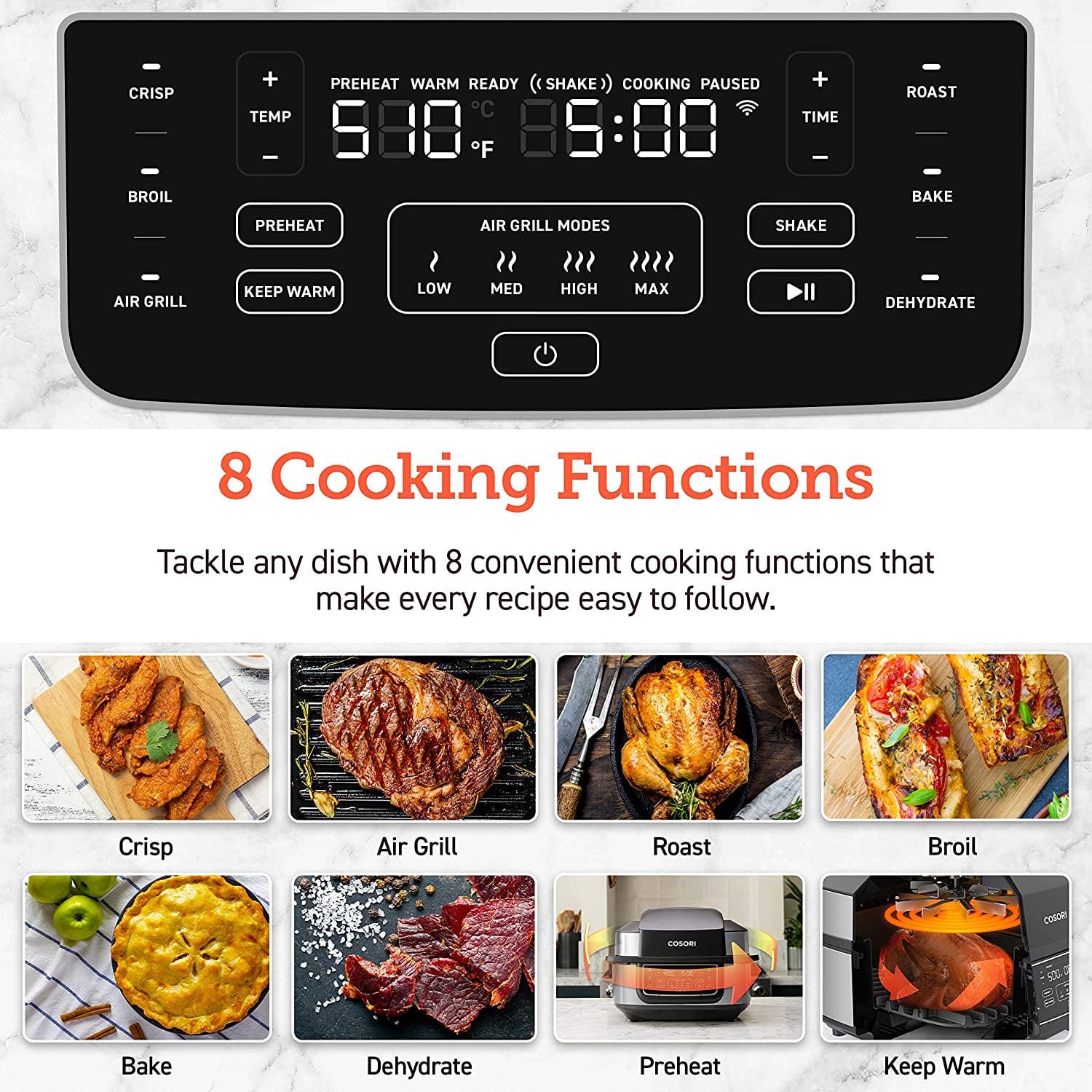 - 8 Cooking Functions: Air Grill, Crisp, Broil, Roast, Bake, Dehydrate, Preheat, Keep Warm.