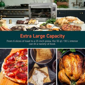 32QT Large Capacity: Cook for 5-7 people with the 32-quart/30-litre air fryer toaster oven, which can fit a 13-inch pizza, 6 slices of bread, or an entire rotisserie chicken
