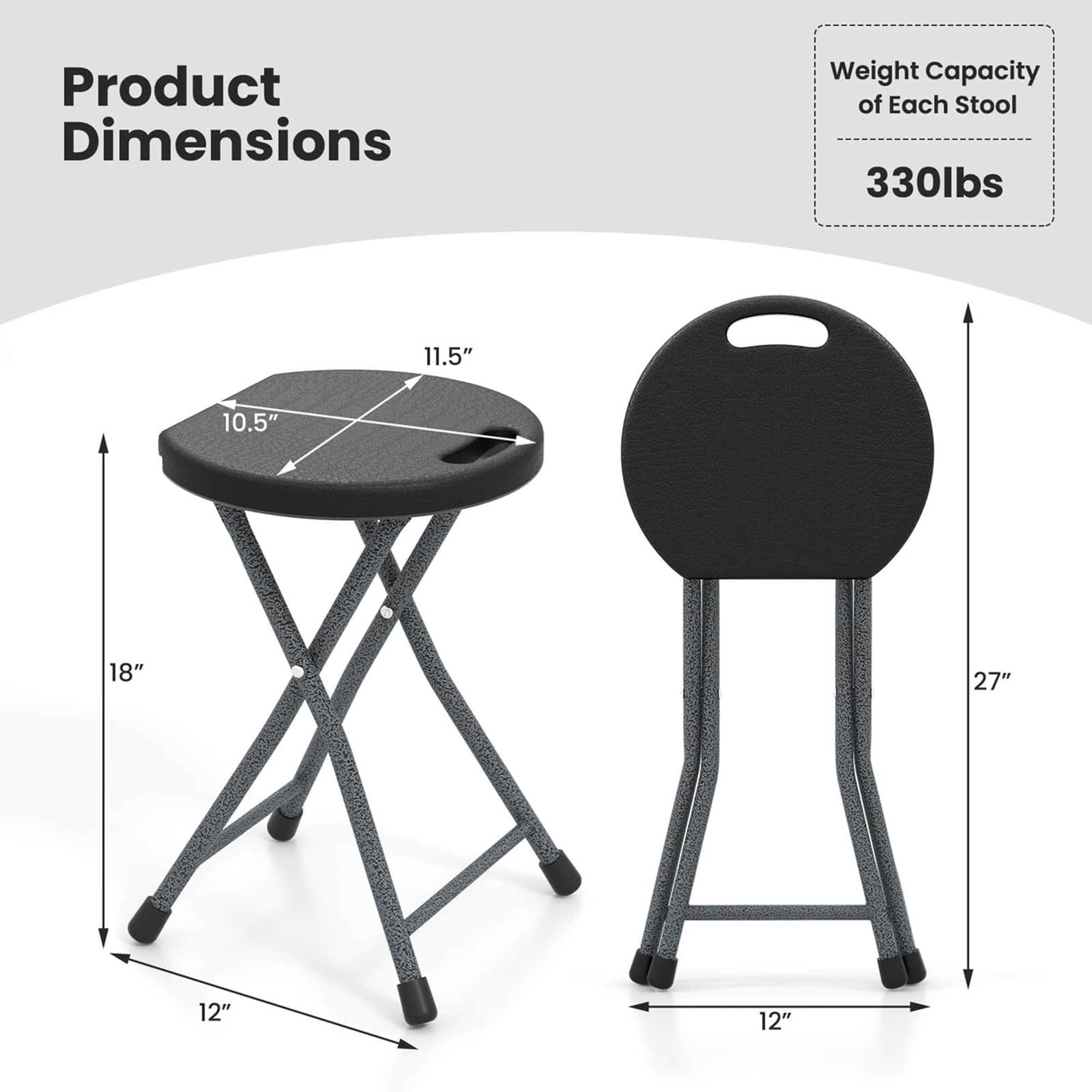 Experience Comfort and Convenience During Your Outdoor Adventure! Our folding stool measures 12″x 12″x 18″(L x W x H) and the camping stool can be easily folded into a compact size for easy storage and transportation. And there exists a built-in handle, allowing for effortless carrying wherever you go, such as picnic, camping, fishing, queuing, gardening, painting, and more. It can also be used as an extra seat at home. Other than that, it adopts a durable and crack-resistant HDPE seat, ensuring superior strength and durability. And the heavy-duty powder-coated metal frame enhances overall sturdiness and stability. Whether you need an extra seat at home, a reliable stool for your garage, or a comfortable seating option for your outdoor adventures, this folding stool has got you covered. Feature The seat is made of premium HDPE, withstand frequent use and resist wear and tear The powder-coated metal frame is not easy to rust, peel, or chip The stable X-shaped frame ensures a secure seating experience The anti-slip and anti-sink footpads prevent any accidental slips or sinking Easy and quick to fold into a compact size, make it convenient to carry and store With its built-in handle, you can effortlessly transport the stool anywhere you want Can be used for extra indoor seating or various outdoor activities Specification Color: Black, Silver Material: HDPE, Metal Overall Dimensions: 12″x 12″x 18″(L x W x H) Seat Size:11.5″x 10.5″(L x W) Folding Size:12″x 27″(L x W) Weight Capacity of Each Stool: 330 lbs Net Weight of the Single Stool: 3.5 lbs Package Includes: 1 x Folding Stool