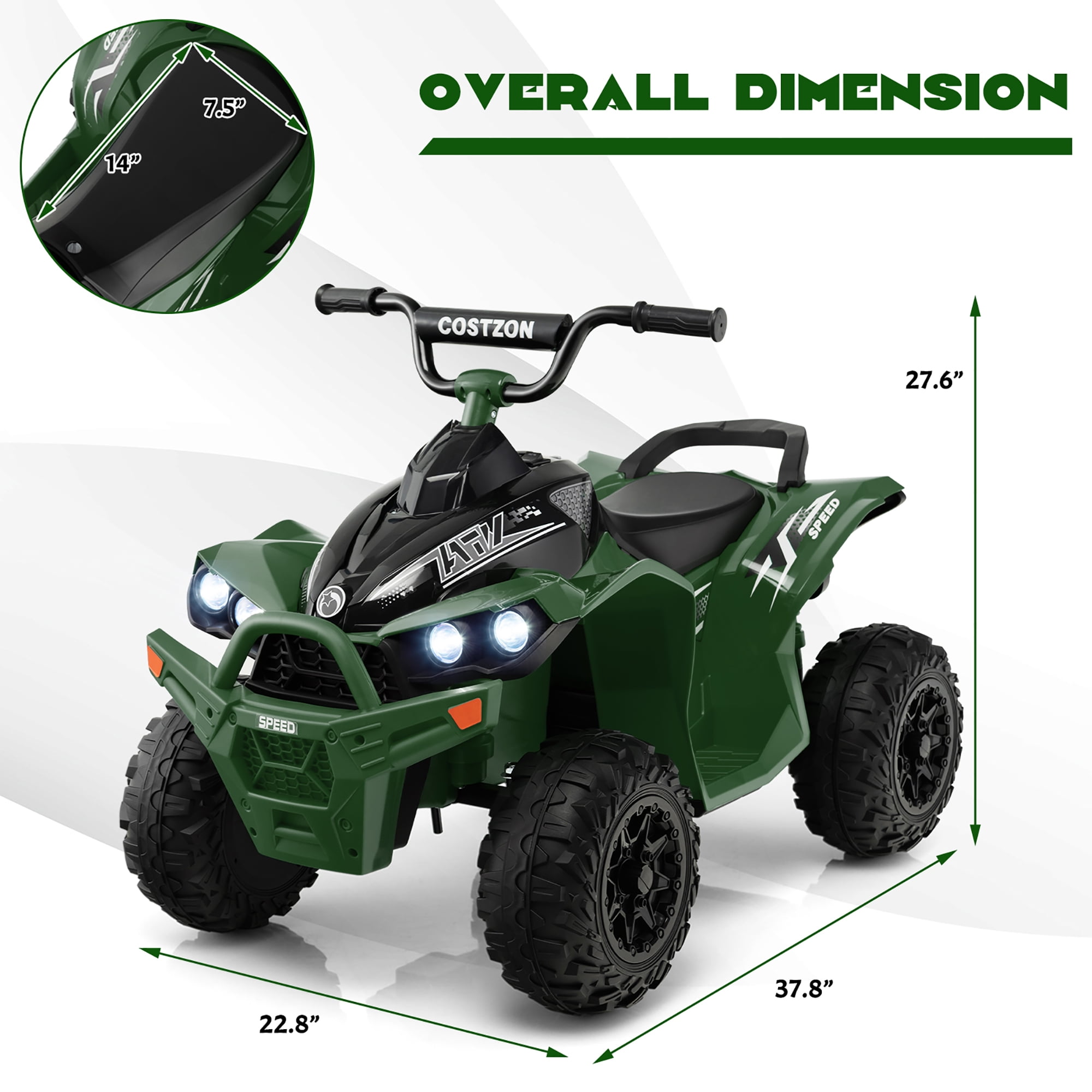 Looking for a driving toy for kids’ birthdays or other festivals? Don’t miss our kids’ ride-on ATV(suggested for ages 3-8 years old). Cool ATV look and attractive colors offer kids endless fun. 4 anti-slip and wear-resistant wheels allow kids to drive smoothly on different road conditions. With 2 powerful motors, it is able to reach a speed of up to 2.7 mph. Besides, kids can easily operate the vehicle with functional buttons of the central panel. Bright headlights, built-in music and horn also make their driving more interesting. What’s more, wide footrests and smooth seat enable kids to feel comfortable when they ride. This ride-on ATV not only brings kids tons of fun, but also encourages them to explore the outside world and builds up their self-confidence. Feature 2 powerful motors and 12V rechargeable battery to reach 1.4/2.7 mph speed The forward/backward button and high/low speed button make it easy to operate Anti-slip handlebars to control its direction Foot pedal for convenient acceleration Bright headlights, built-in music and horn for a fun driving experience 4 anti-slip wear-resistant wheels for safe and smooth riding Ideal for lawn, beach, wood floor, cement road or asphalt road Front carrying handle for easy movement Premium PP material ensures high durability Comfortable seat and wide footrest for more comfort and safety Specification Color: Army Green Material: PP, TPR Overall Dimension: 37.8″ x 22.8″ x 27.6″ (L x W x H) Seat Size: 14” x 7.5” (L x W) Speed: 1.4/ 2.7 mph Charging Time: 8-12 Hours Suitable Age: 3-8 Years Old Applicable Height: 31.5”-51” Load Capacity: 77 lbs Net Weight: 30.9 lbs Package includes: 1 x Kids Ride on ATV 1 x User Manual 1 x Charger