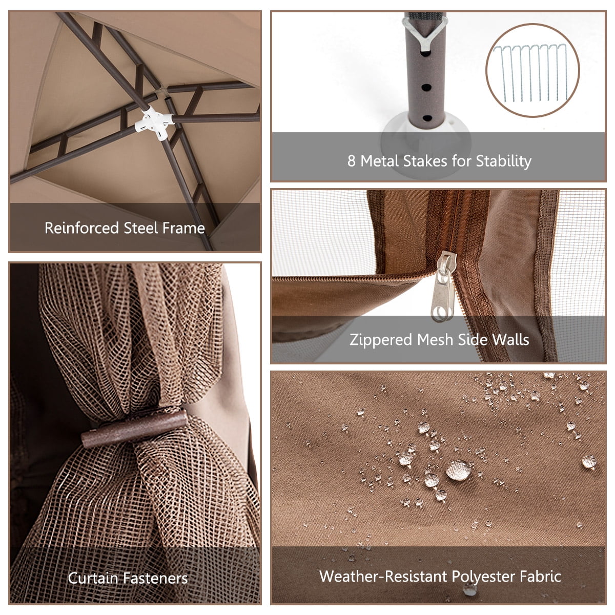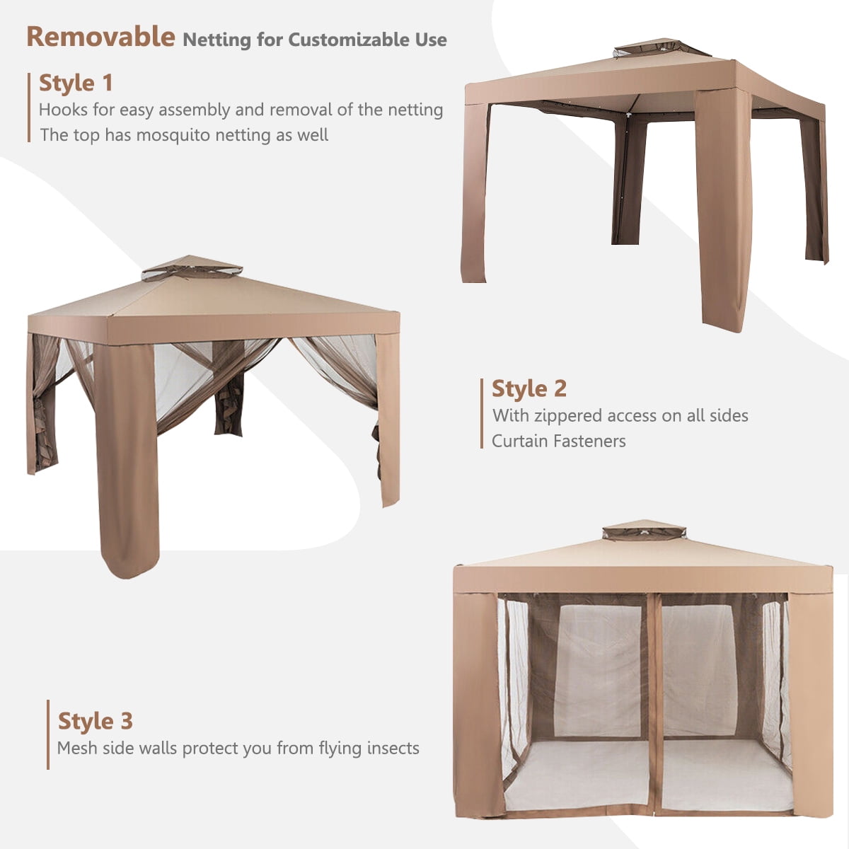 This is our brand new canopy gazebo. It’s a great place for your friends and family to gather, relax, dine, and enjoy conversation. It’s durable, stable and affordable. It’s certain to make a lasting impression on your guests as they enjoy your upscale, shaded getaway. Designed with double-tier canopy gazebo and polyester fabric cover, it provides proper ventilation. What’s more, our gazebo tent is roomy enough for your party and relaxing in solace to entertaining guests. High quality mosquito netting with zippers, fully enclosed keeps you from disturbing of mosquito and other insects. It is great for relaxing and enjoying the summer sun in leisure season. You and your family and friends can enjoy your times with our product. Don’t hesitate to buy it! Feature Solid steel frame, durable and sturdy, avoiding wobbling problems Mosquito netting set keep you from disturbing of mosquito and other insects Double -tier canopy top provides proper ventilation A perfect cover to keep out the sunshine, rain and UV radiation 8 pcs metal stakes to fix canopy to the ground, increasing the stability Polyester fabric, easy to clean and maintain All steel pipe design with buckle connection, more stable String to fasten canopy leg fabric, easy to set up Beautiful design and nice-looking decorative patterns Perfect for outdoor camping, parties, picnics and other conditions Designed for quick, straightforward and simple assembly Specification Color: Coffee Material: Steel and polyester fabric Overall Dimension Of This Item: 10’X 10′ X9.0′ (LXWXH) Product Weight: 36lbs Package Include: 1 X 2 tier Canopy Tent