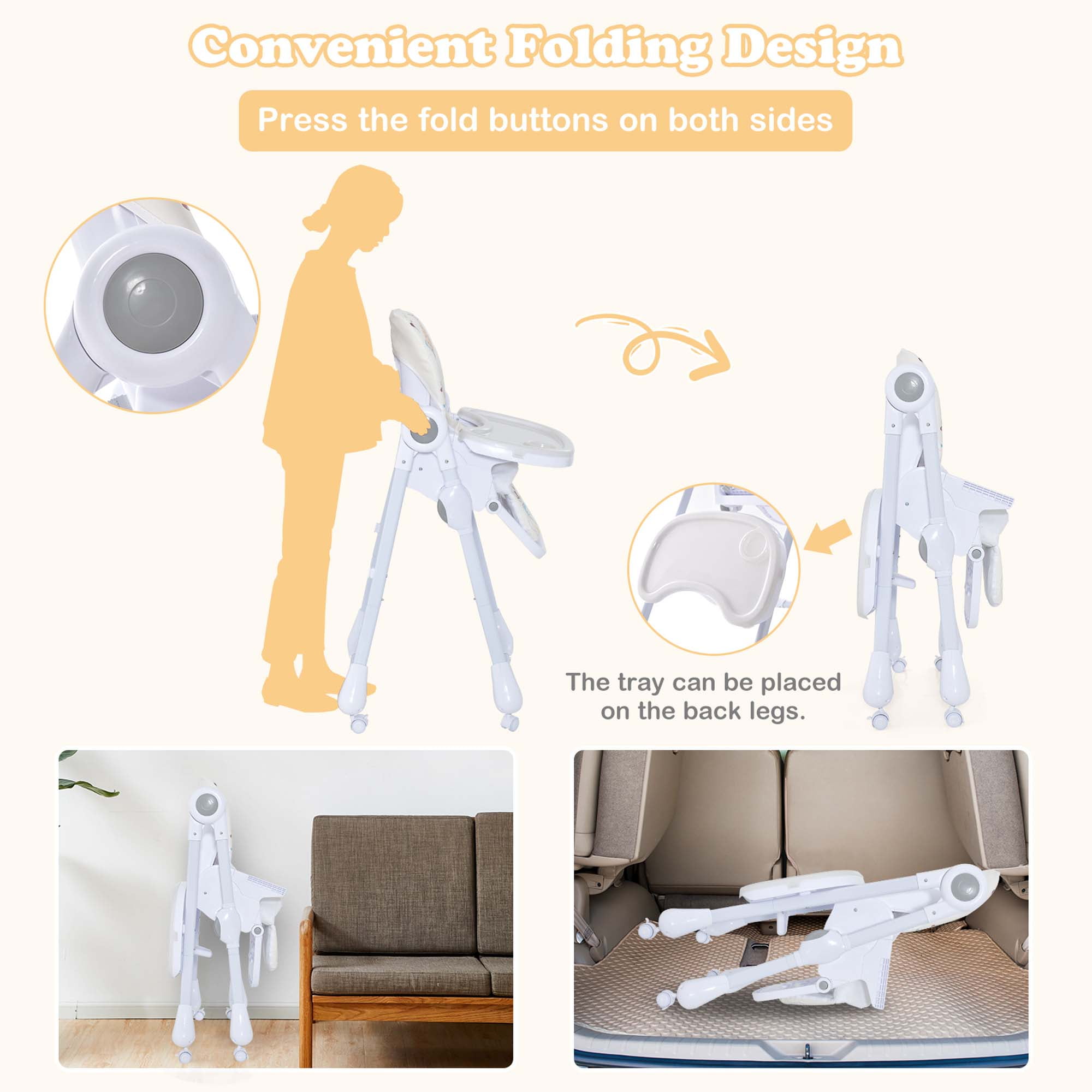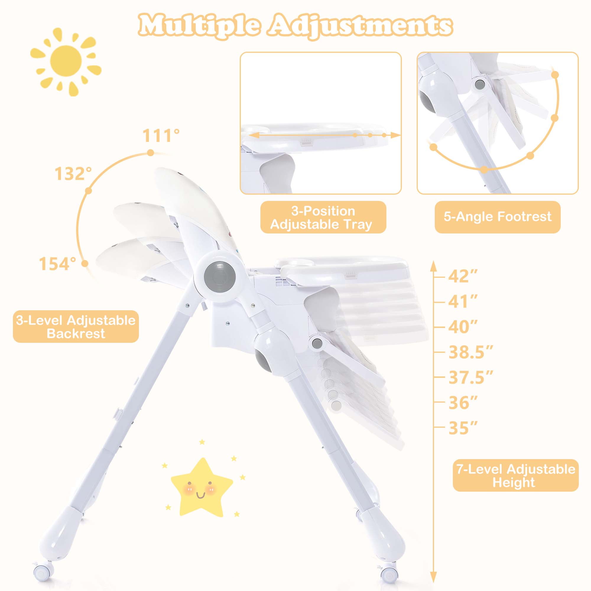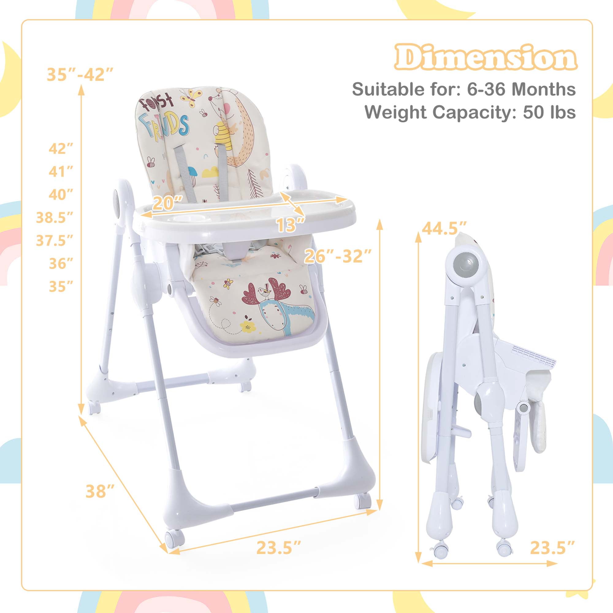 Our multifunctional highchair can be used as an feeding chair, dining booster chair, or even a toddler chair. Our high chair can perfectly match the growth needs, seamlessly transitioning from newborn to toddler. Our baby feeding chair features 3-level reclining backrest, 5-setting footrest and a 3-setting food tray to keep your baby comfortable while eating or playing. It also provides 7 height positions to match dining tables of different heights. The infant highchair features a stable A-shaped structure, non-slip foot pads and a 5-point safety harness to ensure stability and safety. Cleanliness has always been a concern for baby products. Contact with detachable trays and waterproof PU cushion, our baby high chair is easy to clean and maintain after daily use. This reclining baby high chair can be quickly folded for storage and transport. The detachable trays also can be fixed on the rear legs for space saving. Feature 3-in-1 convertible high chair for babies and toddlers aged 6-36 months Featuring 7 adjustable heights to match tables at different heights 3-level backrest, 3-gear food tray and 5-gear footrest meet more requirements Double-layer tray offers perfect place for both eating and playing 5-point safety harness and anti-falling baffle prevent kids from falling Smooth PU seat cushion offers more comfort and is easy to clean A-shaped and 4-point support structure ensure excellent stability Easy to fold up for compact storage and easy transportation Smooth edges and rounded corner design avoid potential injury Specification Color: Beige Material: ABS, PP, PU Leather, TPR Unfolded Dimension: 38” x 23.5” x 35”-42” (L x W x H) Folded Dimension: 44.5” x 23.5” x 16” (L x W x H) Size of the Tray: 20” x 13” (L x W x H) Adjustable Height: 35”, 36”, 37.5”, 38.5”, 40”, 41”, 42” Weight Capacity: 50 lbs Suitable for: 6-36 Months Net Weight: 17.5 lbs Package includes: 1 x Baby High Chair 1 x Instruction