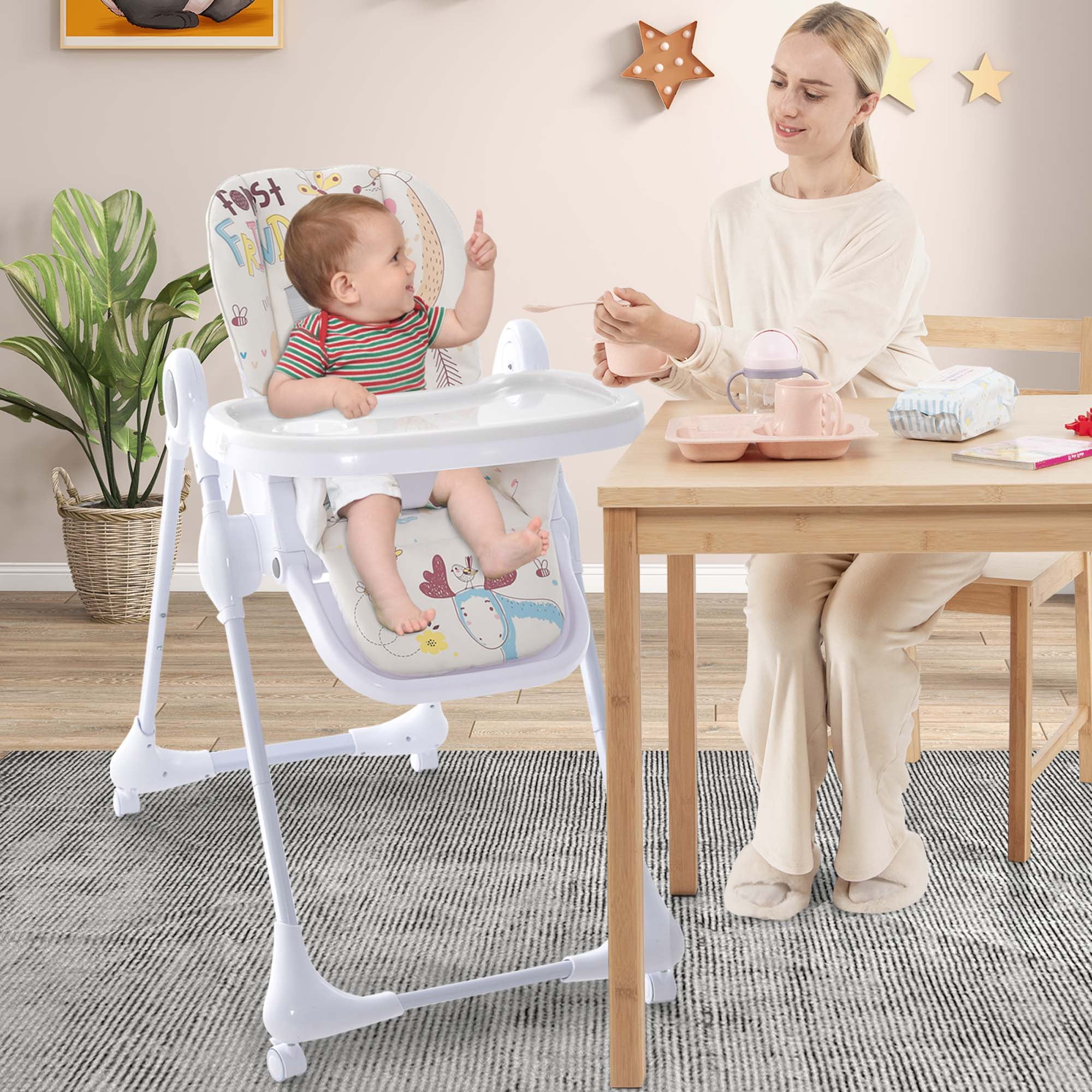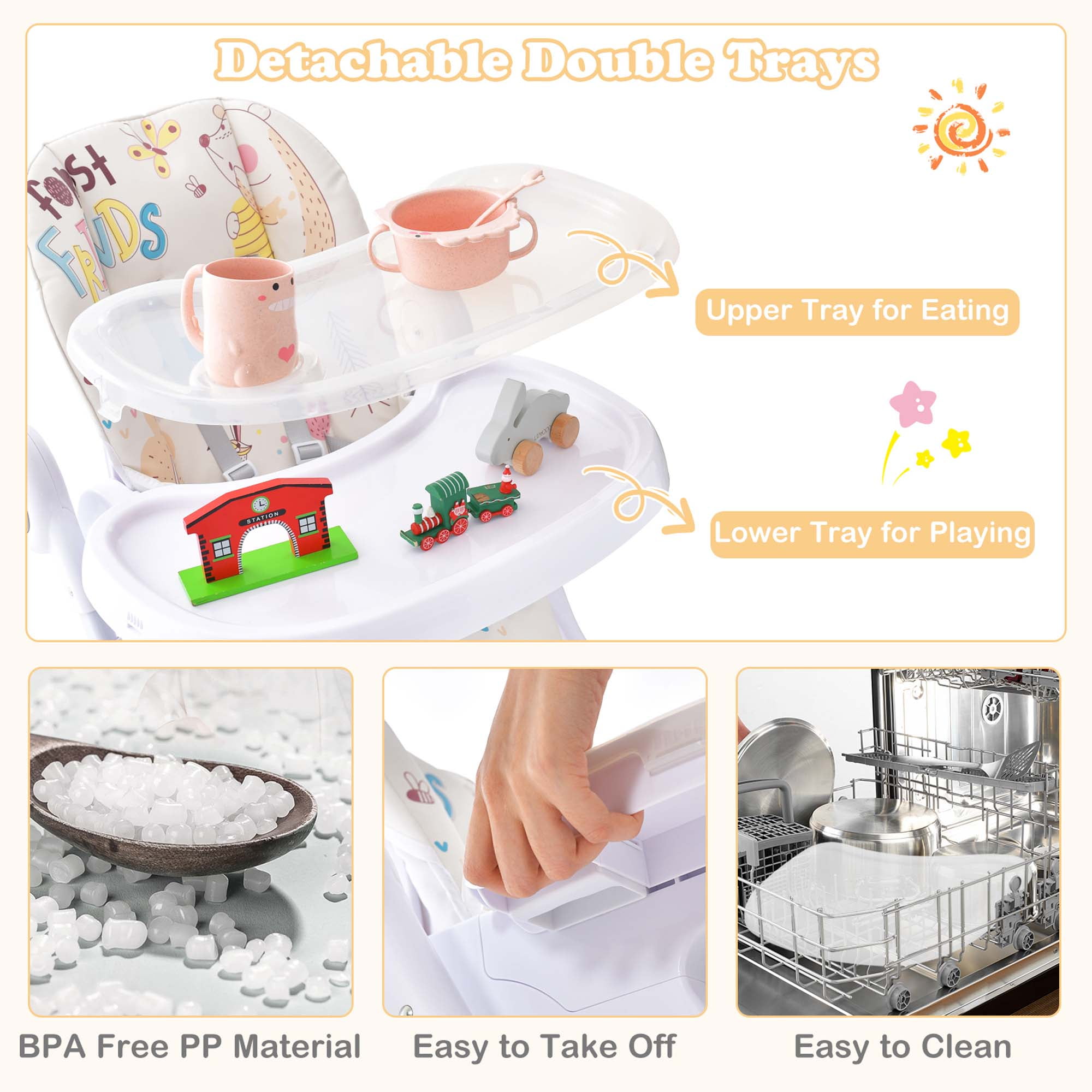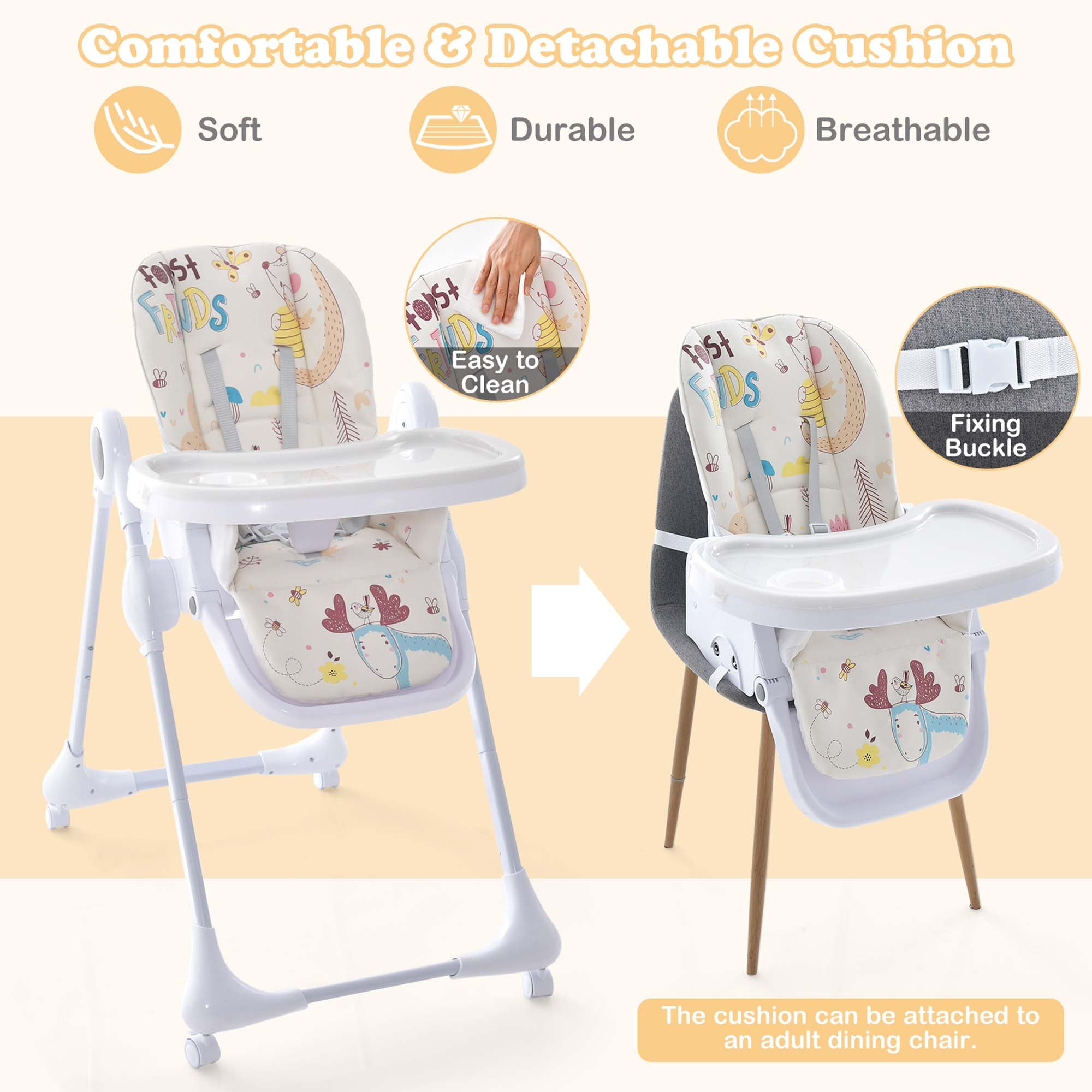 3-In-1 Highchair with Cushion: This convertible baby chair can be used as a baby high chair, toddler low chair, or dining booster seat. It’s ideal for various activities including feeding, reading, and relaxing. The seat has a comfortable & detachable cushion that is soft, durable, breathable and easy to clean. With fixing buckle, the cushion can be attached to an adult dining chair. Highchair with Multiple Adjustments: This foldable baby high chair is designed with 7-level adjustable height and 3-position adjustable tray to match tables at different heights and grow up with your baby. The 3-level adjustable backrest supports your baby’s back for added comfort. Additionally, the 5-angle footrest can meet baby’s postures. Reliable & Stable Structure: The sturdy A-shaped structure coupled with large non-slip feet make this infant highchair stable enough without any wobbling. The chair can hold a kid up to 50 lbs. Besides, the 5-point safety harness and anti-falling baffle design ensure that children sit safely in the seat. Plus, the smooth edges avoid potential injury. Detachable Double Trays: This reclining baby highchair is equipped with double trays, with upper tray for eating and lower tray for playing. The double-layer tray is made of BPA free PP material, safe and durable. Plus, the detachable tray is easy to take off and easy to clean. When not in use, the tray can be placed on the back legs. Foldable High Chair with Wheels: Thanks to its convenient folding design, the toddler feeding chair is easy to fold and store, simply press the fold buttons on both sides. The 4 lockable universal wheels are intended to move the baby dining chair from one place to another easily or keep the chair in place. Plus, the wheels can be removed.