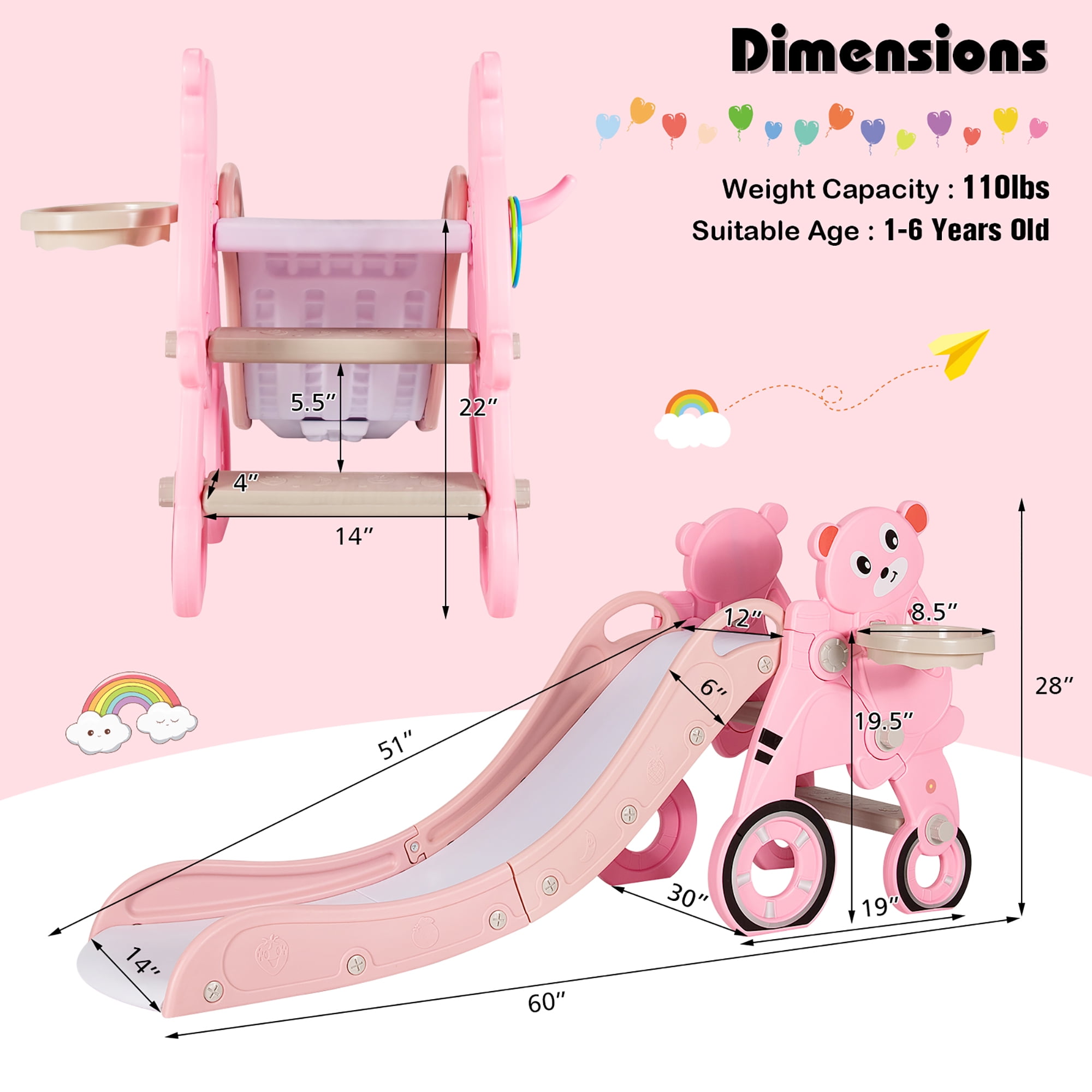 Feature: The 4-in-1 multi-functional slide is equipped with a climbing ladder, slide, basketball hoop, and ring toss The wide armrest design is easy for children to grasp Made of odorless and non-toxic high-quality PE material Smooth surface and round edges prevent injuries and scratches The closed climb steps with non-slip texture make it safer and easier for kids to climb Triangular stable structure to ensure safe use Foldable design for easy storage A great gift for kids to play indoors and outdoors Easy to assemble and maintain Specification: Color: Blue/Green/Pink Material: PE Overall Dimension: 60″ x 30″ x 28″(L x W x H) Slide Size: 51″ x 14″(L x W) Net Weight: 11 lbs Weight Capacity: 110 lbs Suitable Age: 1-6 years old Package Includes: 1 x Baby Slide 1 x Ball 3 x Rings 1 x Instructions
