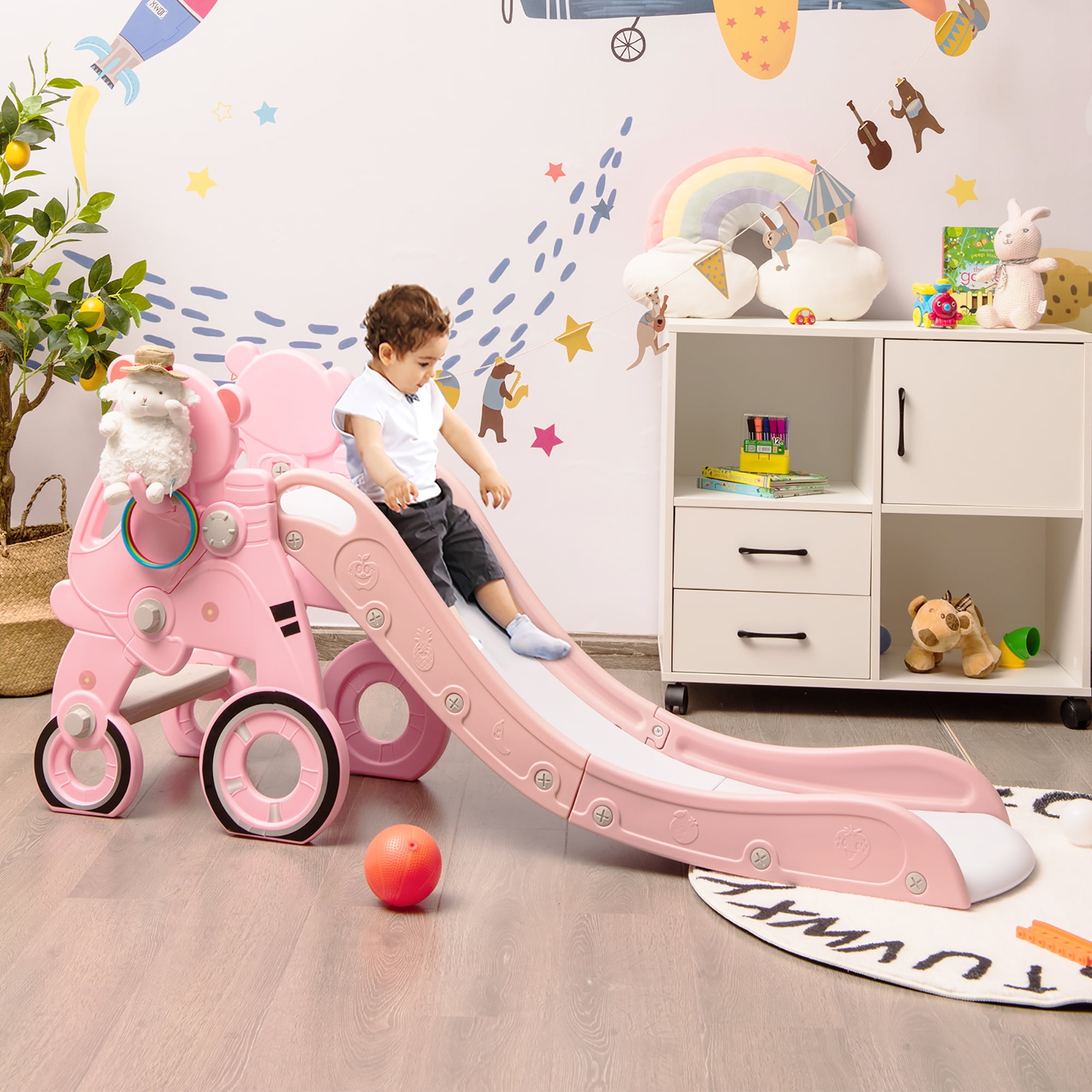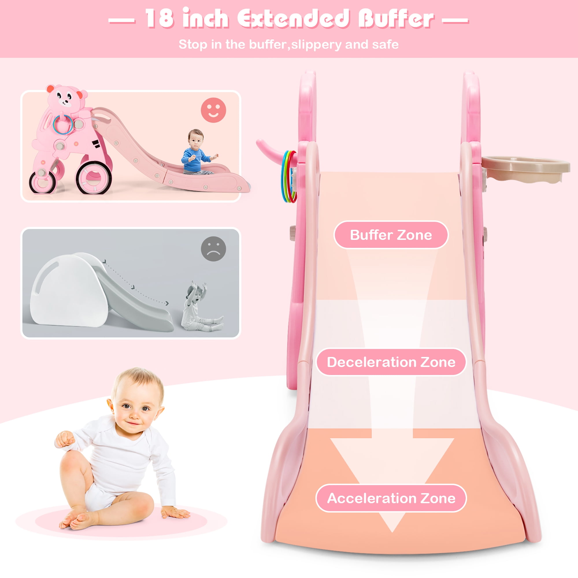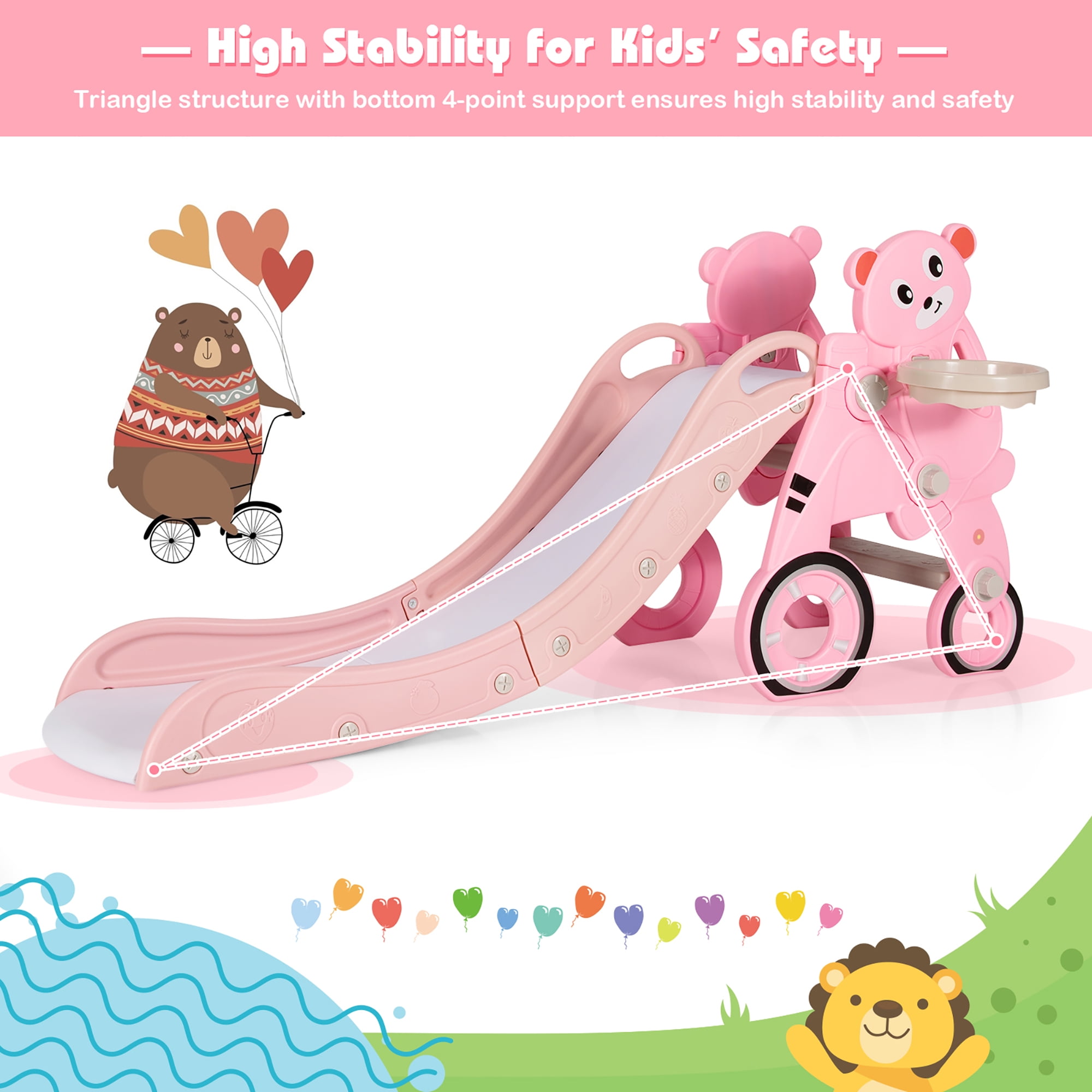 Do you want to give your kids a play while developing adventure spirit space in your home? This kids slide with a max load-bearing capacity of 110 lbs is the perfect choice for your kids aged 1-6 years old, accompanying their childhood! With a cute cartoon shape, this slide would be popular in the kid’s age group, attracting much of their attention to play. The extra-long slide enhances the cushioning force during the sliding process, preventing the baby from sliding out of the slide and getting injured. As a multifunctional slide set, our kid slide is equipped with a basketball hoop, telescope, ring toss, steering wheel, and so on. Moreover, this kid’s slide set is not only a toy but also a great piece of equipment to exercise kids’ physical development abilities and arouse their interest in sports. This will be the slide you can’t miss, buy it now!
