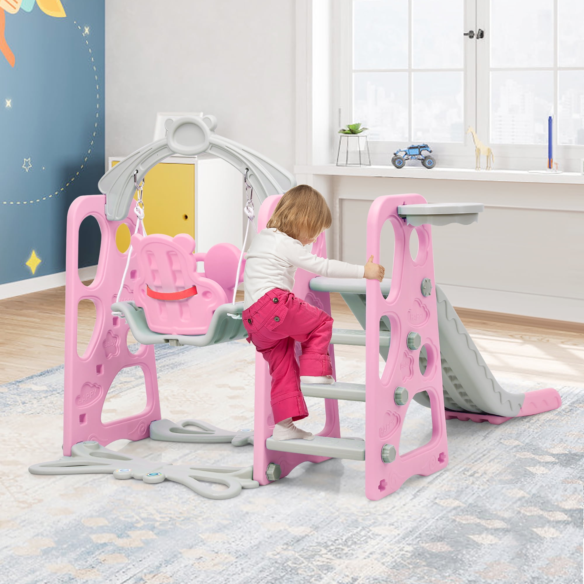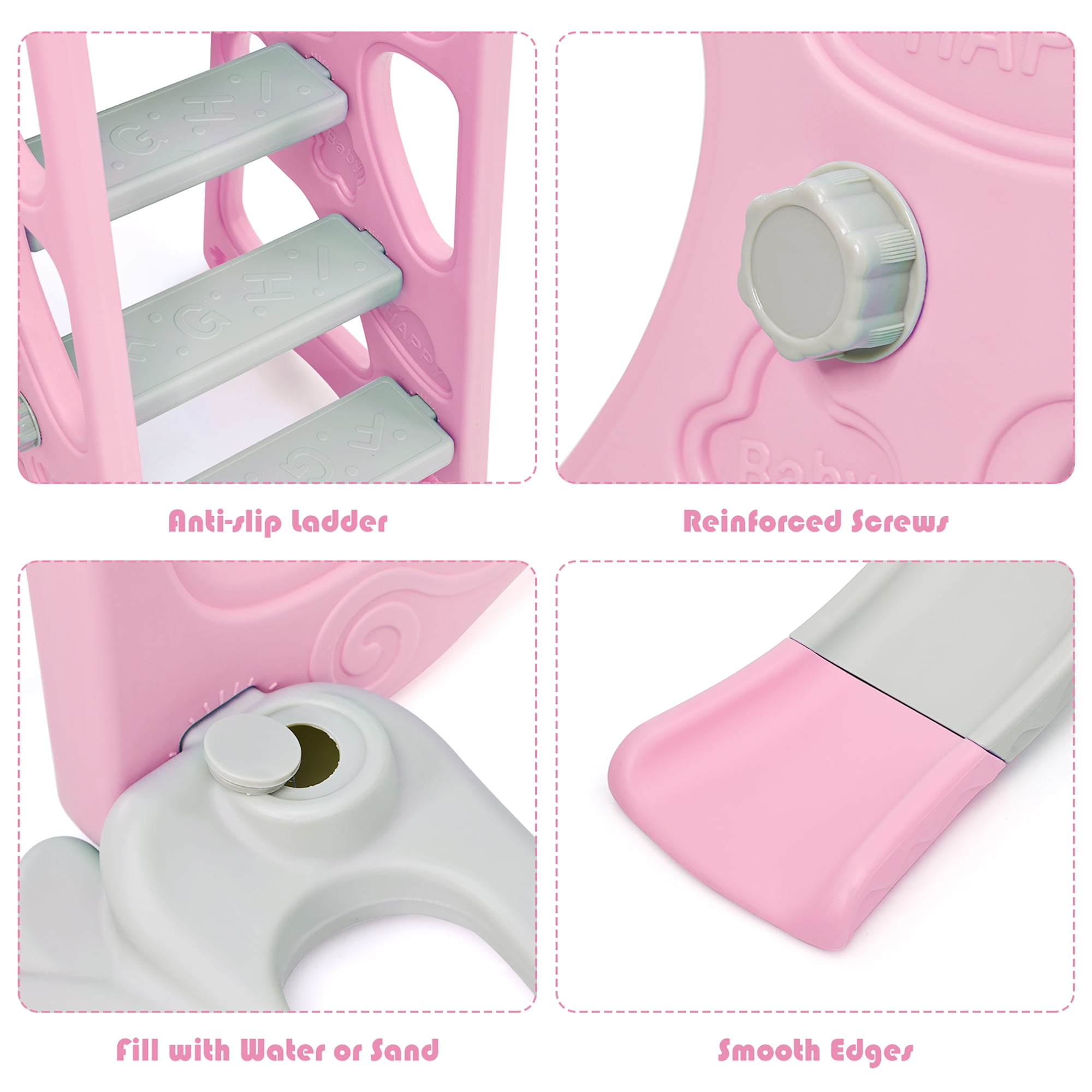 This bright and colorful 4-in-1 playing set offers 4 functions: smooth slide, safe swing, basketball hoop and climbing ladder, suitable for indoor and outdoor use. Our toddler slide has the extended slope and anti-slip steps, which offers your baby with a smooth sliding experience. Additionally, we have carefully added safety belt and forward leaning guardrail to the swing in order to protect kids from injury. Plus, the basketball hoop is suitable for your little athlete to enhance hand-eye coordination and improve motor skills, such as ball picking, running and jumping. If you are looking for a 4-in-1 multifunctional playing set, please don’t miss it! Feature 4-in-1 playing set includes smooth slide, safe swing, basketball hoop and climbing ladder Environmentally friendly PE material ensures high durability and long service life Climbing ladder with non-slip texture makes it easier for kids to climb Swing with safety belt, T-shaped forward leaning guardrail ensures the safety of uses Adjustable rope of swing meet diverse requirements of babies of different heights Enhance hand-eye coordination and improve motor skills Extended buffer zone increases cushioning force in the slide way Filling base with sand or water enhances stability without shaking Easy assembly by following the detailed steps in the instructions Specification Color: Pink Material: PE Product Dimensions: 56”x 69.5” x 43.5” (L x W x H) Slide Length: 57.5” Net Weight: 24 lbs Maximum Capacity of Swing: 110 lbs Maximum Capacity of Slide: 88 lbs Age Range: 1-6 years old Package Includes: 1 x 4-in-1 Toddler Climber & Swing Set 1 x Basketball 1 x Instruction