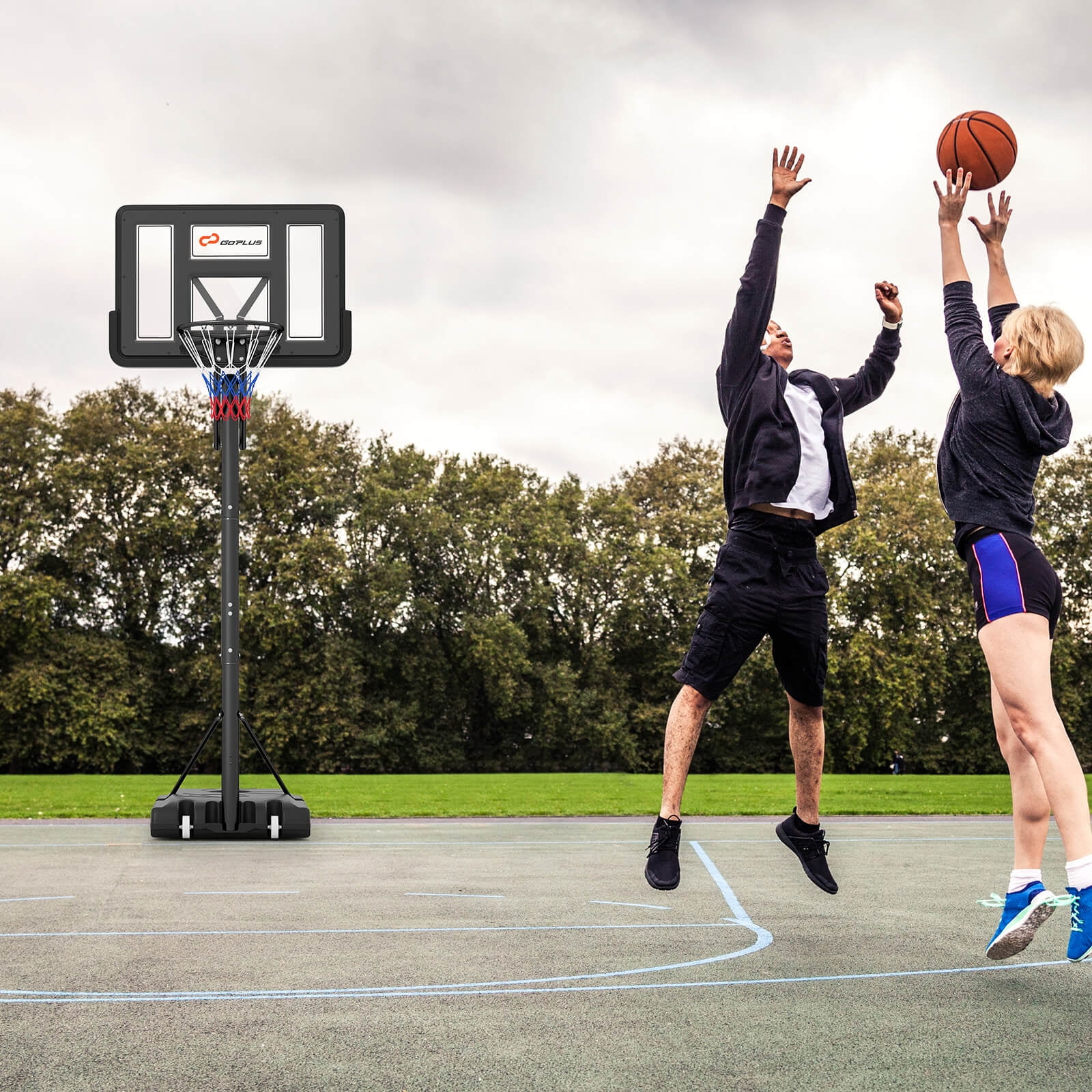 Use this portable basketball hoop to enjoy your basketball time with friends or family! The overall height of this basketball hoop stand can be adjusted from 10.1′ to 12.1′ and the rim height is adjustable from 8′ to 10′. So, everyone can play. The 44-inch backboard made of high quality PET material is shatterproof and durable. Besides, made of rustproof powder-coated metal poles & rims and weather-resistant net, this basketball hoop stand is suitable for indoor & outdoor play. The base can be filled with 14.5-15.3 gallons of water or 143.3 lbs of sand to increase stability. There is a groove on the base as a place for you to hold the basketball. And you can place the weighted bag on the base to make the basketball hoop less prone to dumping or shaking. Moreover, 2 smooth rolling wheels make it easy for you to put this portable basketball hoop in the perfect spot in your backyard or driveway. Feature 5-level adjustable height meets different requirements Thickened pole and triangular structure ensure higher stability Shatterproof backboard with double shock-absorbing springs The widened base can be filled with water or sand Provided with a free hoop secure bag to enhance stability All-weather resistant, suitable for indoors and outdoors 2 built-in wheels ensure easy movement & transportation A recess on the base offers a place to hold your basketball Specification Color: Black Material: Metal, PE, PET Adjustable Total Height: 10.1/10.6/11.1/11.6/12.1ft Adjustable Rim Height: 8/8.5/9/9.5/10ft Backboard Dimensions: 44” x 29.5” (L x W) Base Dimensions: 35.5” x 23” x 6” (L x W x H) Outer/Inner Diameter of Basketball Rim: 19”/18” Added Weight: 14.5-15.3 Gallon Water or 143.3 lbs Sand Net Weight: 54 lbs Package Includes: 1 x Portable Basketball Hoop 1 x Hoop Secure Bag 1 x Instruction