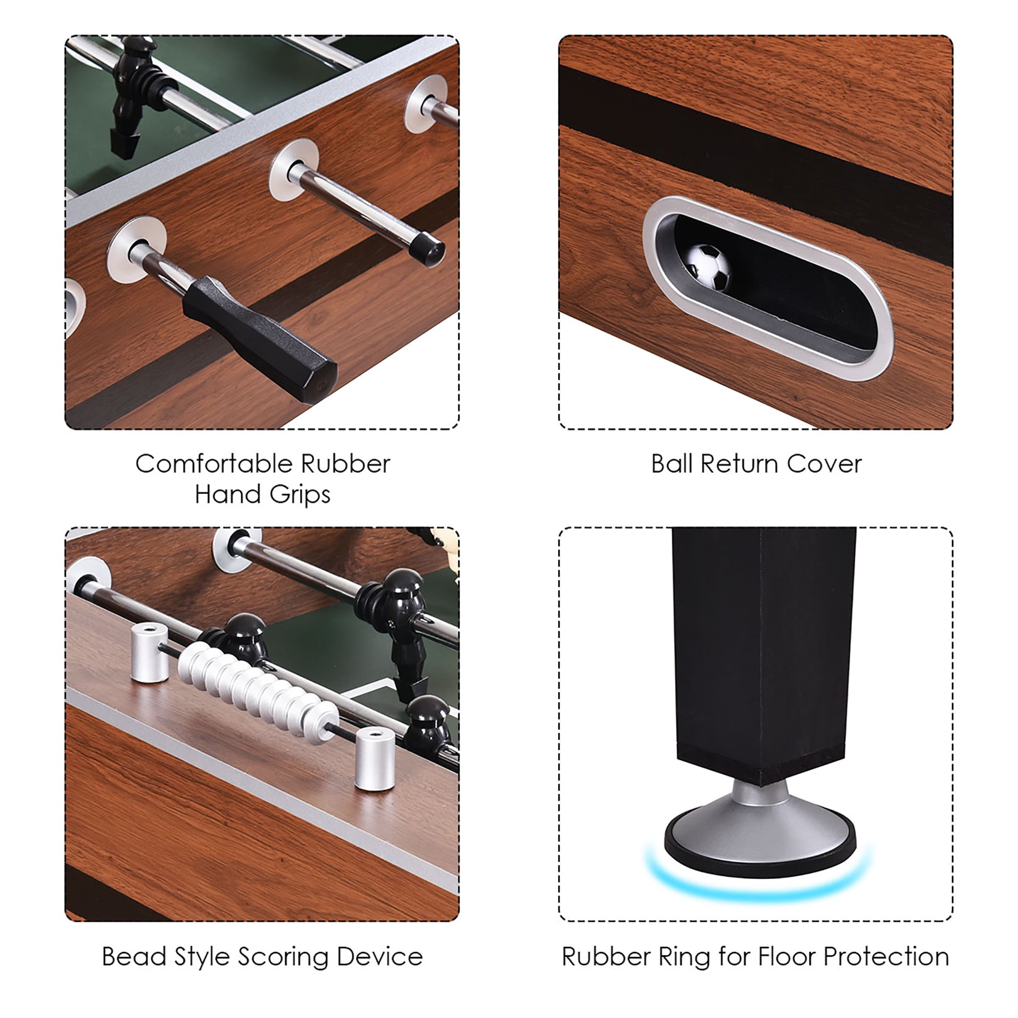 【Solid structure】Constructed with high quality MDF and oversized leg levelers to keep the game table firm and stable. Rust-proof strong steel rods with slide bearings for smooth rotation. 【High restored real competition scene】Simulation design with soccer field, player, goals, soccer balls and scorer, provide a best game experience. High performance player shines with luster long compound coating, resists wear and tear. 【Comfortable & convenience】Rod bars built with comfortable grips make it easy to control the balls. Internal goal and ball collector for easy retrieval at each goal. And the football court designed with smooth, friction-less surface for easy ball sliding. The luster long compound coating also protects the surface from scratches. 【Official Competition Sized】Standard made foosball game table, comes with 8 rows within the table to allow 4 rows per team. 13 black players and 13 ivory players are included. Bead Style Scoring device Helps Keep Track Of The game process conveniently. 【Entertaining and fits various occasions】Suitable for indoor entertainments between family, friends and colleagues, sure to keep your friends entertained for hours on end. This Game Table Measures 54″ And Comes With Two Foosballs.